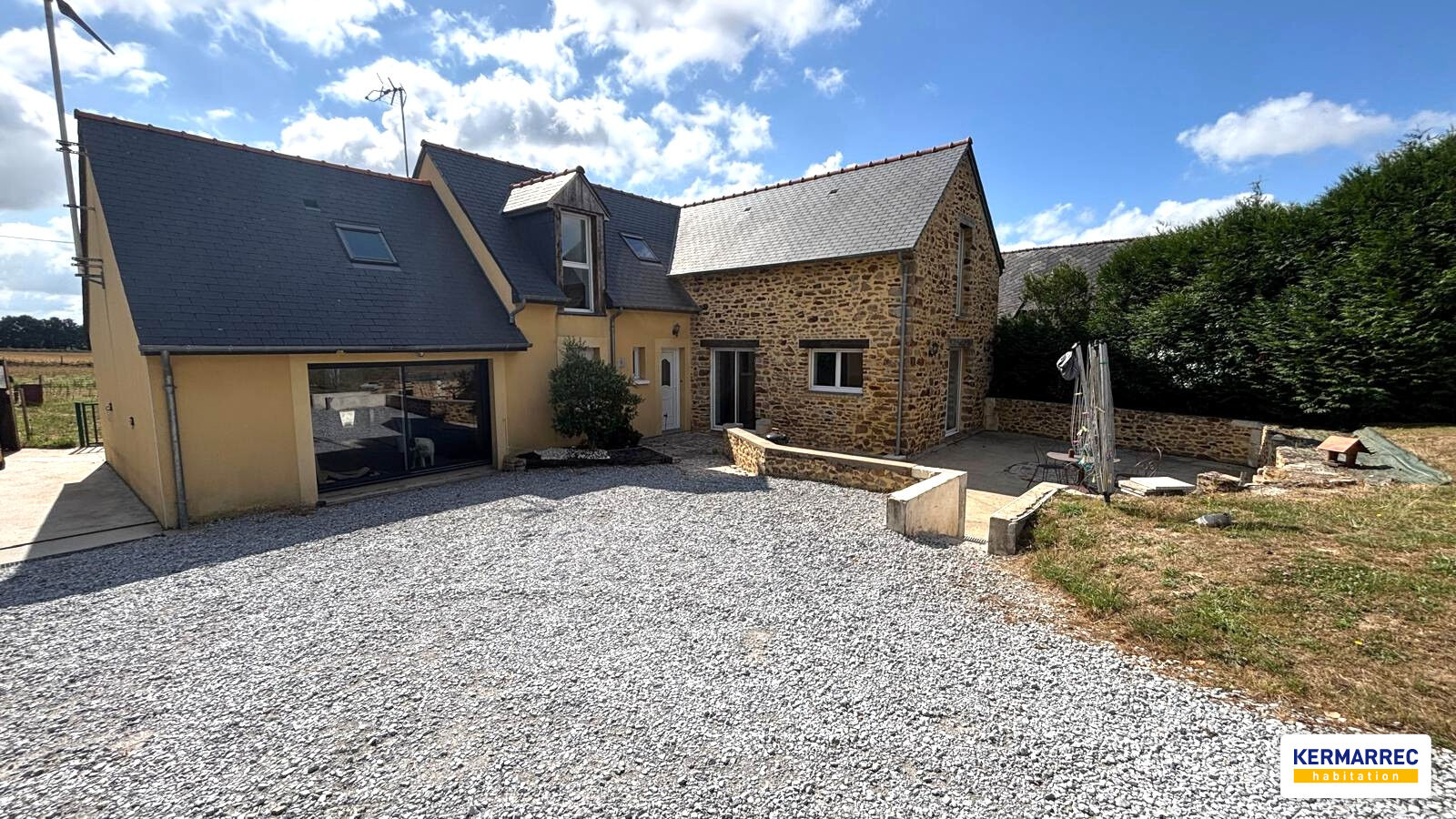 CHEZ KERMARREC - Sur la commune du PERTRE, en CAMPAGNE, à vendre une maison en pierres avec une extension rénovée en 2005 de 125 m² habitables (environ 147 m² au sol) comprenant une entrée, un salon-séjour avec un poêle à granules et une cuisine aménagée et équipée, une chambre avec salle d'eau privative, un wc, une buanderie. A l'étage : une mezzanine desservant 3 chambres, une salle de bains, un wc. Une grande pièce pouvant être destiné à un garage et un grenier au dessus Chauffage avec pompe à chaleur air/air réversible. Ballon thermodynamique. Adoucisseur d'eau. Un garage avec porte motorisée, Terrasse. Abris (animaux/stockage), Le tout sur un terrain d'environ 5200 m² sur deux parcelles avec un portail électrique. Assainissement conforme. Classe énergie : B - Prix : 225 200 euros HAI - Réf.3143 (4.74 % honoraires TTC à la charge de l'acquéreur.) Didier RACAPE (EI) Agent Commercial - Numéro RSAC : 812631414 - Rennes.