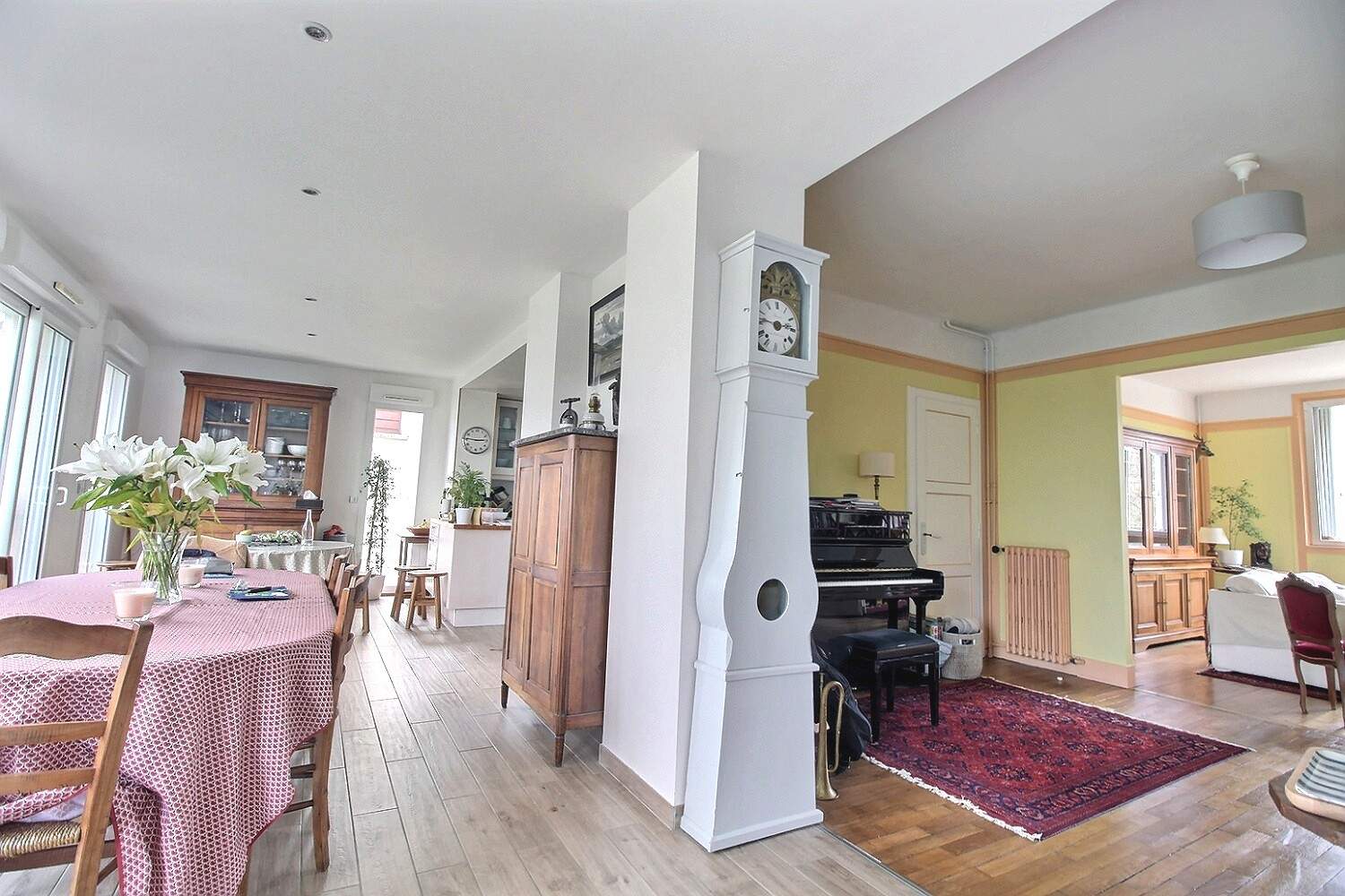 Votre agence Rive Ouest de Clamart vous propose en exclusivité cette maison de 176m², 9 pièces, 6 chambres, sur un terrain de 386m². Idéalement située dans une impasse donnant directement sur le Parc Henri Sellier, cette maison saura vous séduire grâce à son emplacement rare, recherché, et verdoyant. Au calme absolu, sans aucun vis-à-vis, Parc Henri Sellier d'un côté, grand jardin de l'autre, cette maison se compose d'une entrée, d'un double séjour traversant exposé EST OUEST, donnant sur une grande salle à manger exposée EST, d'une cuisine ouverte aménagée et équipée, et de premiers WC indépendants. A l'étage, 4 chambres, dont une parentale donnant sur une grande terrasse, une salle de bain avec WC et des rangements. Au sous-sol (semi enterré), 2 chambres supplémentaires, une salle d'eau avec WC et un grand garage de plus de 36m². Isolation et étanchéité de la toiture réalisées en 2022. Vitrification du parquet et peintures en 2023. Extension réalisée en 2013. Venez découvrir votre prochain coup de coeur! SACHA ABAJO (EI) Agent Commercial - Numéro RSAC : - .