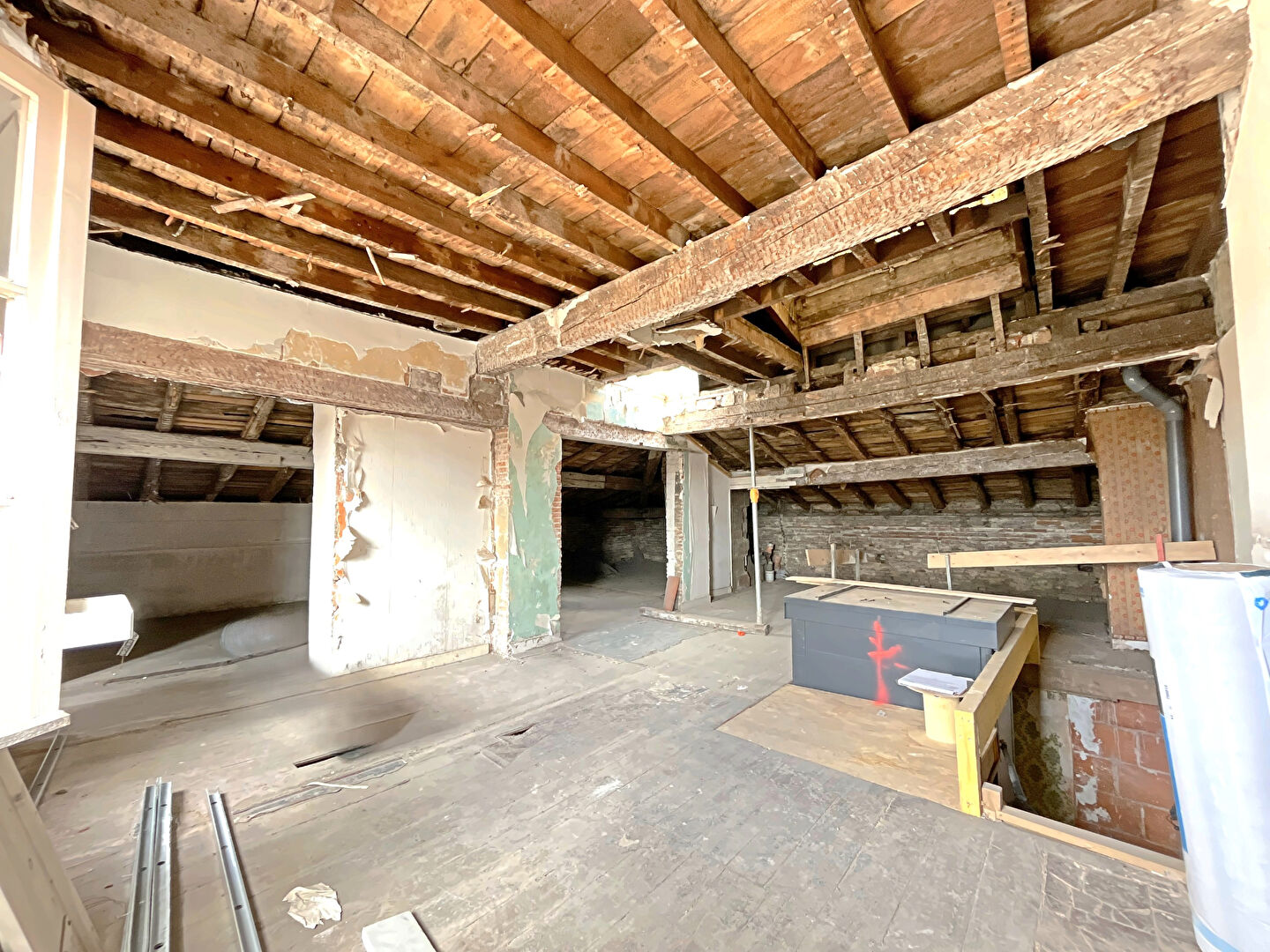 Sur le Boulevard de Strasbourg, avec une vue exceptionnelle sur la Basilique Saint-Sernin, notre agence Paladia a le plaisir de vous présenter à la vente ces combles aménageables situés au 4? et dernier étage d'un superbe immeuble toulousain de caractère. L'immeuble a récemment bénéficié d'une rénovation complète de ses parties communes, lui conférant un standing particulièrement soigné. Un ascenseur neuf vient également d'être installé, offrant un confort rare pour ce type de bien ancien. Ces combles à aménager, baignés de lumière, développent une surface au sol de 104 m², dont 25,80 m² hors loi Carrez, laissant entrevoir de nombreuses possibilités d'aménagement. Les volumes existants permettent d'imaginer un magnifique appartement sous les toits ou encore des bureaux atypiques et de caractère au coeur de la ville. Le bien bénéficie également d'une terrasse de 9,60 m², véritable privilège, offrant une vue imprenable sur les toits de Toulouse et sur la Basilique Saint-Sernin. Un cadre unique qui confère à ce projet un charme et un potentiel remarquables. A 250 mètres du métro Jeanne d'Arc, du marché Victor Hugo et de l'ensemble des commerces de la rue Alsace Lorraine, ce bien constitue une opportunité rare pour les amateurs de projets sur mesure, souhaitant créer un lieu de vie ou de travail unique dans un environnement central et chargé d'histoire. Dossier complet et informations complémentaires disponibles sur demande. Copropriété de 6 lots - dont 4 lots habitation. Charges annuelles : 1200 euros.
