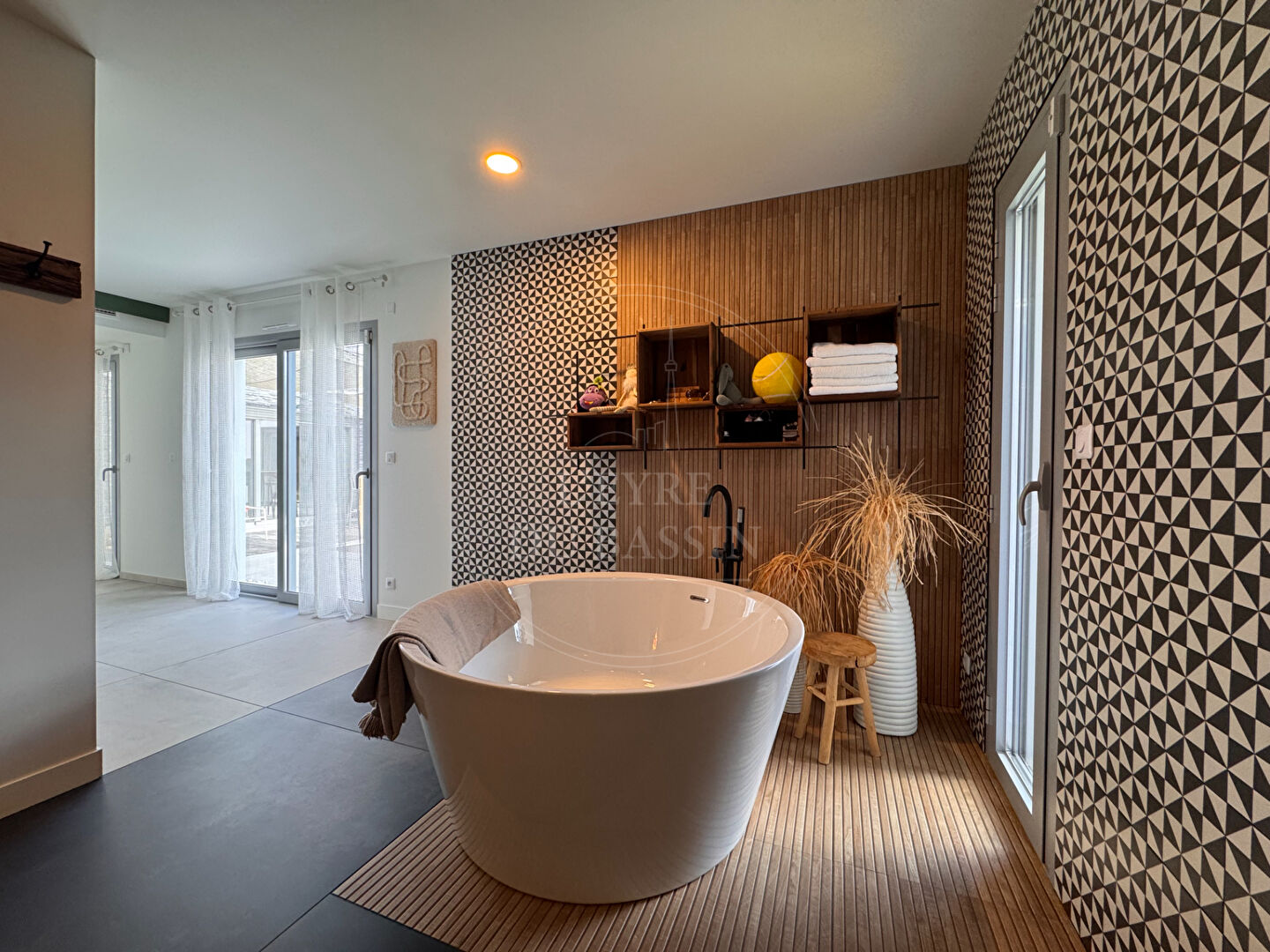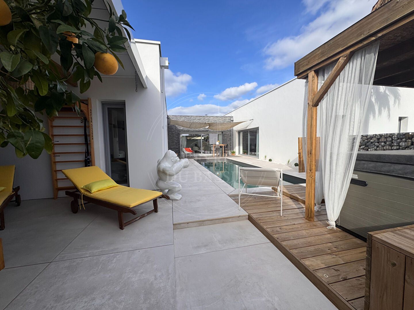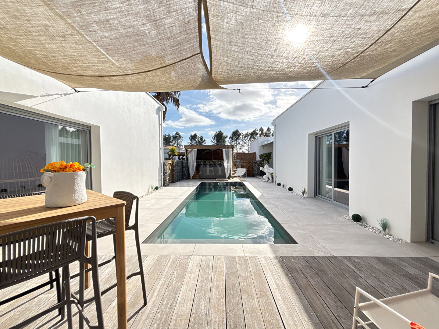 Maison contemporaine d'exception de 165 m² sur 1080 m² de parcelle. L'agence L'EYRE DU BASSIN vous invite à découvrir cette superbe maison contemporaine à l'architecture moderne et épurée, caractérisée par son élégant toit plat et ses volumes généreux. Idéalement située, la propriété bénéficie d'un environnement pratique et recherché : un centre commercial prisé ainsi que les écoles (de la maternelle au collège) sont accessibles à pied, tandis que le centre-ville se rejoint facilement à vélo. Dès l'entrée, vous serez séduits par une magnifique pièce de vie de plus de 80 m² réunissant l'entrée, le salon, la cuisine ouverte et un agréable séjour offrant une vue sur la piscine. Cet espace lumineux et convivial a été imaginé pour offrir un cadre de vie chaleureux et idéal pour recevoir. La partie nuit se compose de trois chambres confortables, dont une suite parentale avec salle de bain d'environ 13 m², offrant un véritable espace privatif. Une seconde salle d'eau, deux WC ainsi qu'un cellier / buanderie viennent compléter l'agencement pratique de la maison. A l'extérieur, tout a été conçu pour profiter pleinement des beaux jours : vous découvrirez une agréable piscine, un jacuzzi propice à la détente, une terrasse couverte, un boulodrome pour partager des moments conviviaux, ainsi qu'un coin détente avec hamac, véritable invitation au repos. Un carport permet également de stationner les véhicules à l'abri. Un garage de 34 m² et un container de stockage complètent ce bien. Cette propriété au style architectural contemporain, aux volumes généreux et aux espaces pensés dans les moindres détails, séduira les amateurs de biens singuliers et de confort moderne. Une belle opportunité à découvrir avec L'agence L'EYRE DU BASSIN Marie SEPULLE (4.10 % honoraires TTC à la charge de l'acquéreur.) Marie SEPULLE (EI) Agent Commercial - Numéro RSAC : 949 817 217 - BORDEAUX.