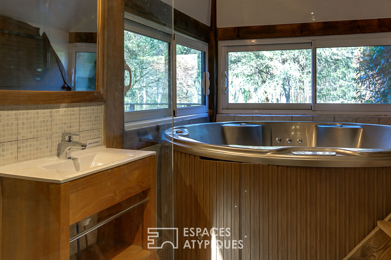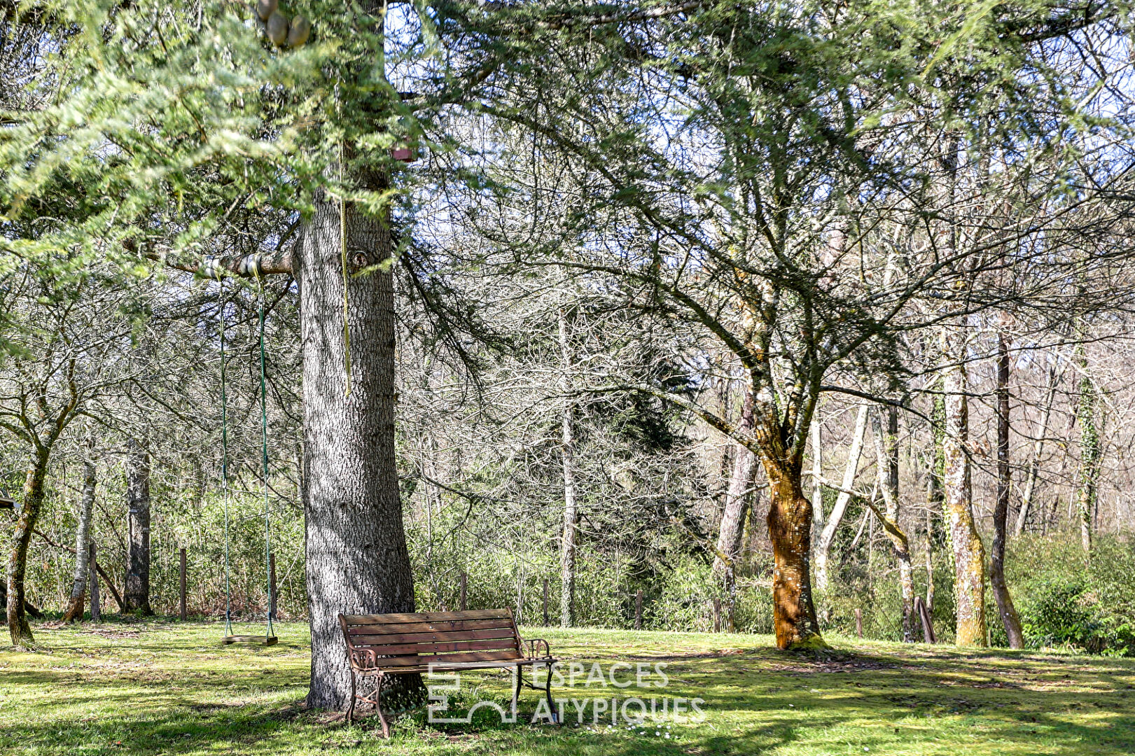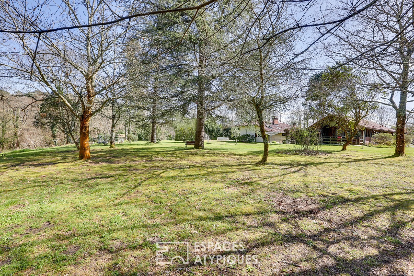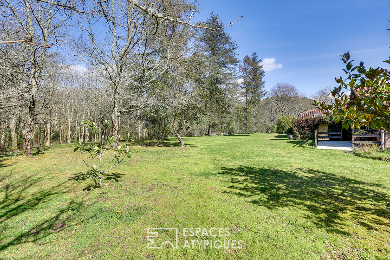 A Magescq, au coeur d'un environnement préservé et à seulement vingt minutes de l'océan, cette ancienne propriété métayère des années 1850 déploie tout le charme de l'architecture landaise sur une parcelle de près d'un hectare. Ce domaine d'exception, véritable immobilier atypique, se compose d'une habitation principale et d'un gîte indépendant, pour une surface habitable totale de plain-pied de 145 m². Bordé par un ruisseau en zone naturelle, le terrain arboré de 9730 m² accueille une piscine chauffée et un grand atelier, offrant un cadre de vie bucolique et privilégié. L'intérieur des bâtiments révèle une rénovation respectueuse qui sublime les structures d'origine. La maison principale s'organise autour d'une salle à manger baignée de lumière, prolongée par un séjour chaleureux agrémenté d'un insert et une cuisine équipée. Deux chambres, une salle d'eau ainsi qu'une véranda viennent parfaire cet espace de vie aux prestations confortables. Le gîte indépendant, quant à lui, séduit par son séjour cathédrale sublimé par une charpente apparente monumentale et réchauffé par un poêle à bois. Il dispose d'une cuisine ouverte, de deux chambres supplémentaires, ainsi que d'une mezzanine dédiée au couchage. Point d'orgue de cet espace dédié à la détente, une salle d'eau intègre un jacuzzi privé. Un bureau avec son entrée indépendante permet une activité professionnelle à domicile. L'extérieur invite à la contemplation et à la douceur de vivre. La vaste parcelle clôturée assure une intimité, entre forêts et cours d'eau. Les installations écoresponsables, telles que les panneaux solaires, s'intègrent à cet ensemble authentique. Proche des commerces du village et des axes menant aux plages de la Côte d'Argent, cette propriété allie le charme d'un refuge naturel à la proximité des services. Ce lieu de vie rare est une invitation à découvrir un patrimoine revisité, idéal pour un projet de résidence familiale ou une activité d'accueil. CLASSE ENERGIE : D / CLASSE CLIMAT : B (pour la maison principale) Montant moyen estimé des dépenses annuelles d'énergie pour un usage standard, établi à partir des prix de l'énergie 2021, 2022 et 2023 : entre 1330 euros et 1800 euros. CLASSE ENERGIE : C / CLASSE CLIMAT : A (pour le gîte) Montant moyen estimé des dépenses annuelles d'énergie pour un usage standard, établi à partir des prix de l'énergie 2021, 2022 et 2023 : entre 1016 euros et 1374 euros. Magali Malbec Contact : au 06 77 52 99 54 RSAC : 490 450 723 DAX MAGALI MALBEC (EI) Agent Commercial - Numéro RSAC : 490450723 - DAX.