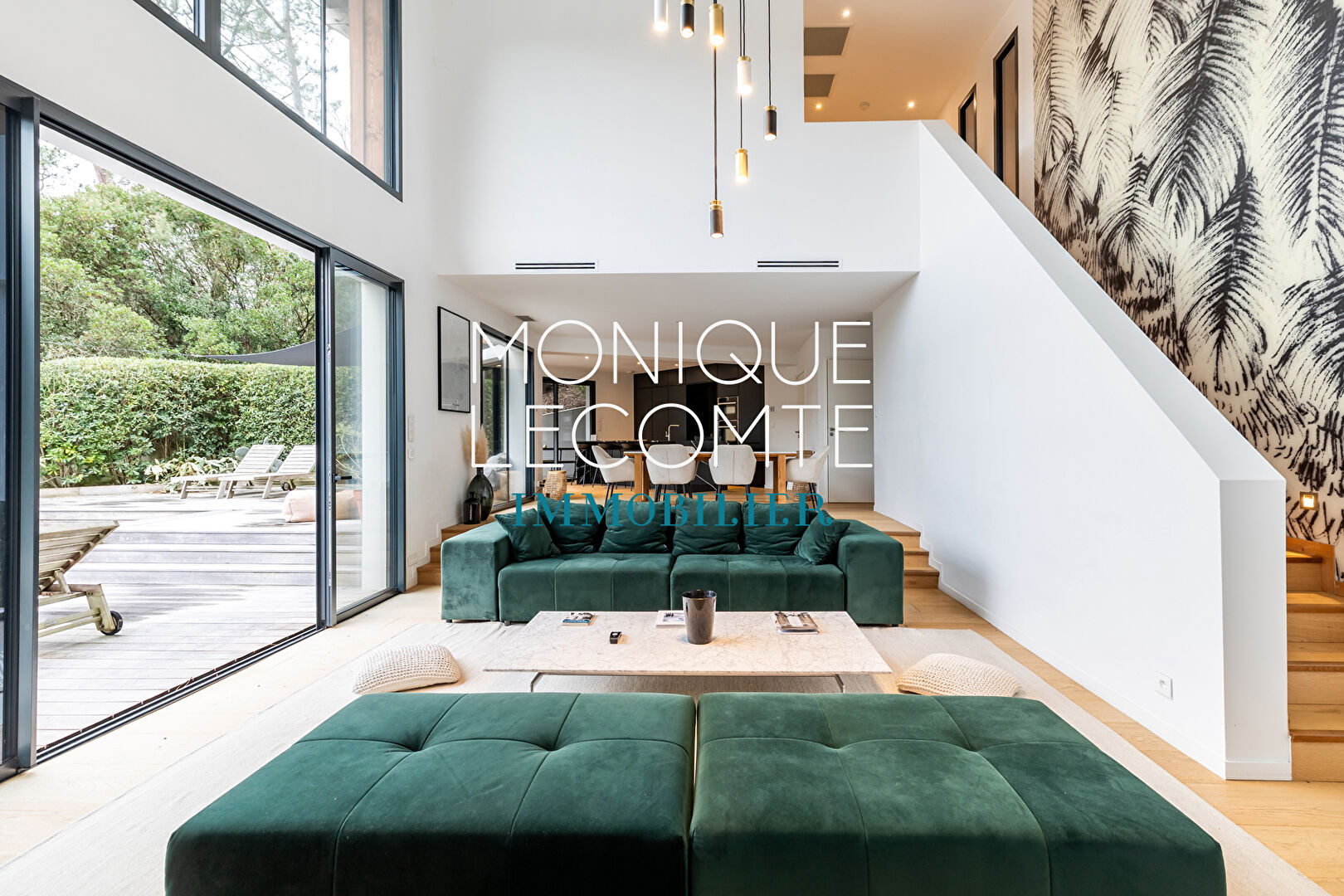 ARCACHON-PYLA-SUR-MER, l'Agence Monique Lecomte Immobilier vous propose cette belle maison d'Architecte d'environ185 M2 sur un terrain arboré de 845 M2 à proximité des plages. Elle se compose d'une entée, d'une vaste pièce de vie avec cuisine ouverte ouvrant sur la terrasse et la piscine, une buanderie et une chambre avec sa salle d'eau. A l'étage se trouvent une suite parentale avec salle de bains complète et dressing ainsi qu'une chambre. En sous-sol une chambre avec salle d'eau, une cave et un garage complètent cette maison située au calme dans le domaine de la Forêt. (4.19 % honoraires TTC à la charge de l'acquéreur.)