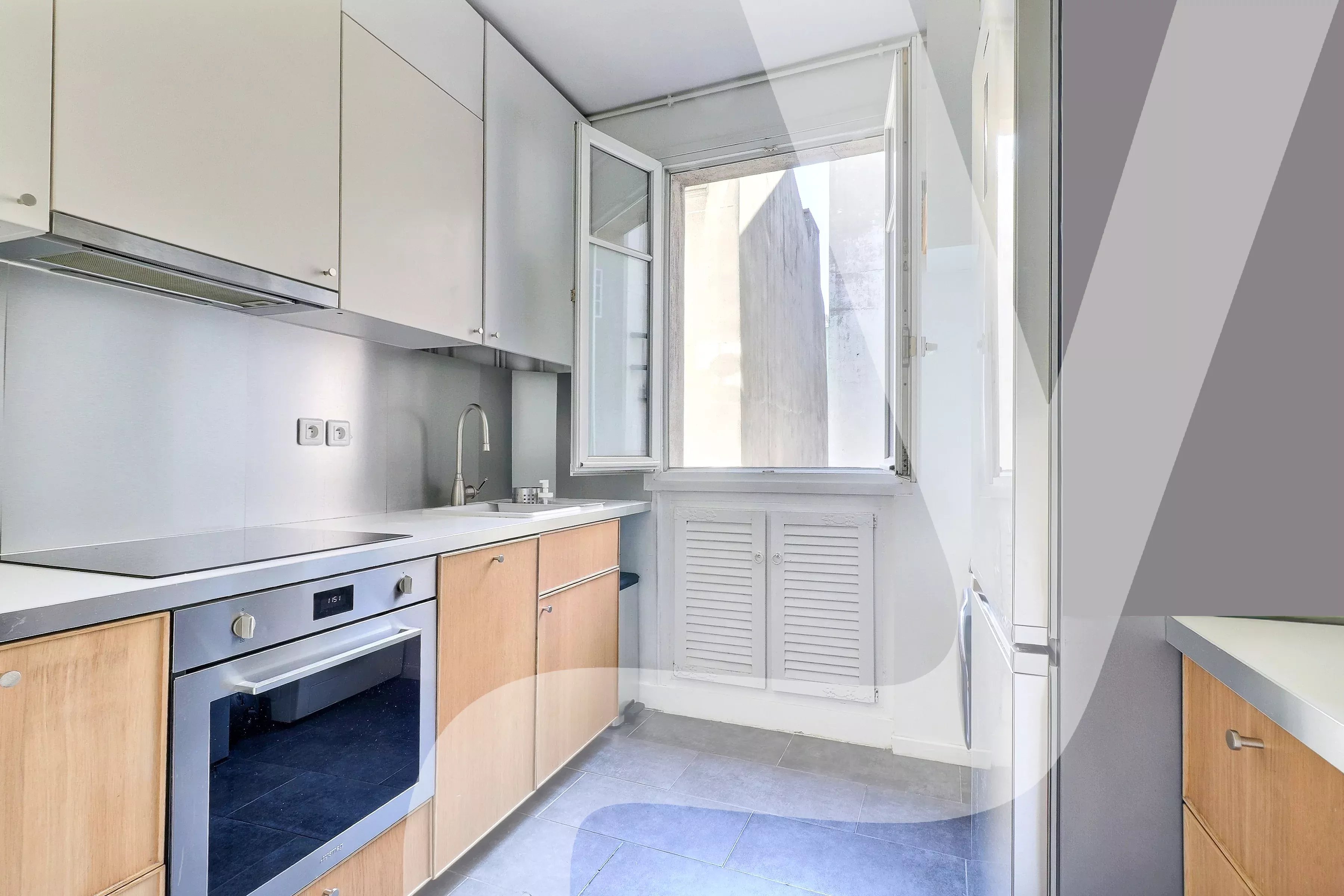 L’appartement dispose également d’une grande cuisine entièrement équipée, offrant de nombreux rangements, des plans de travail confortables ainsi qu’un emplacement pour votre machine à laver.