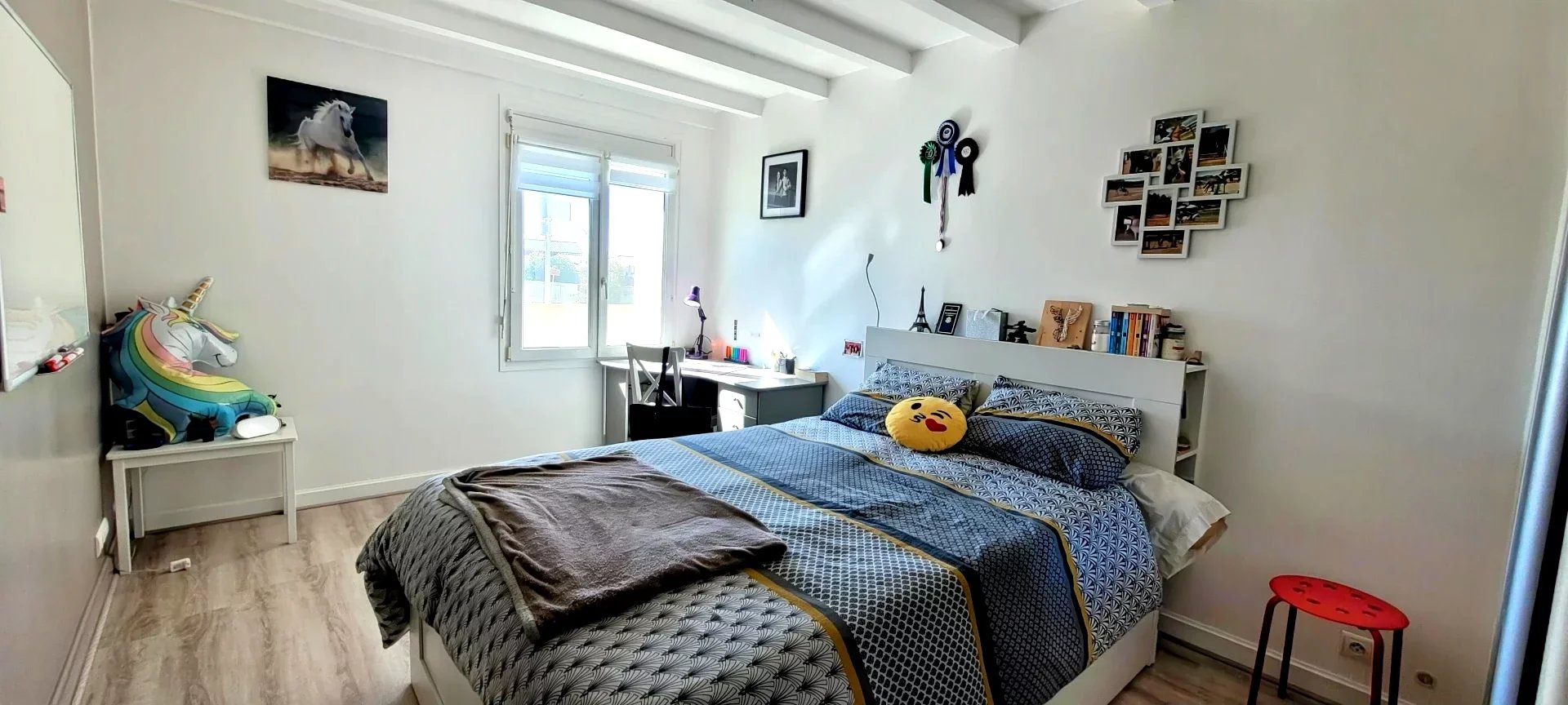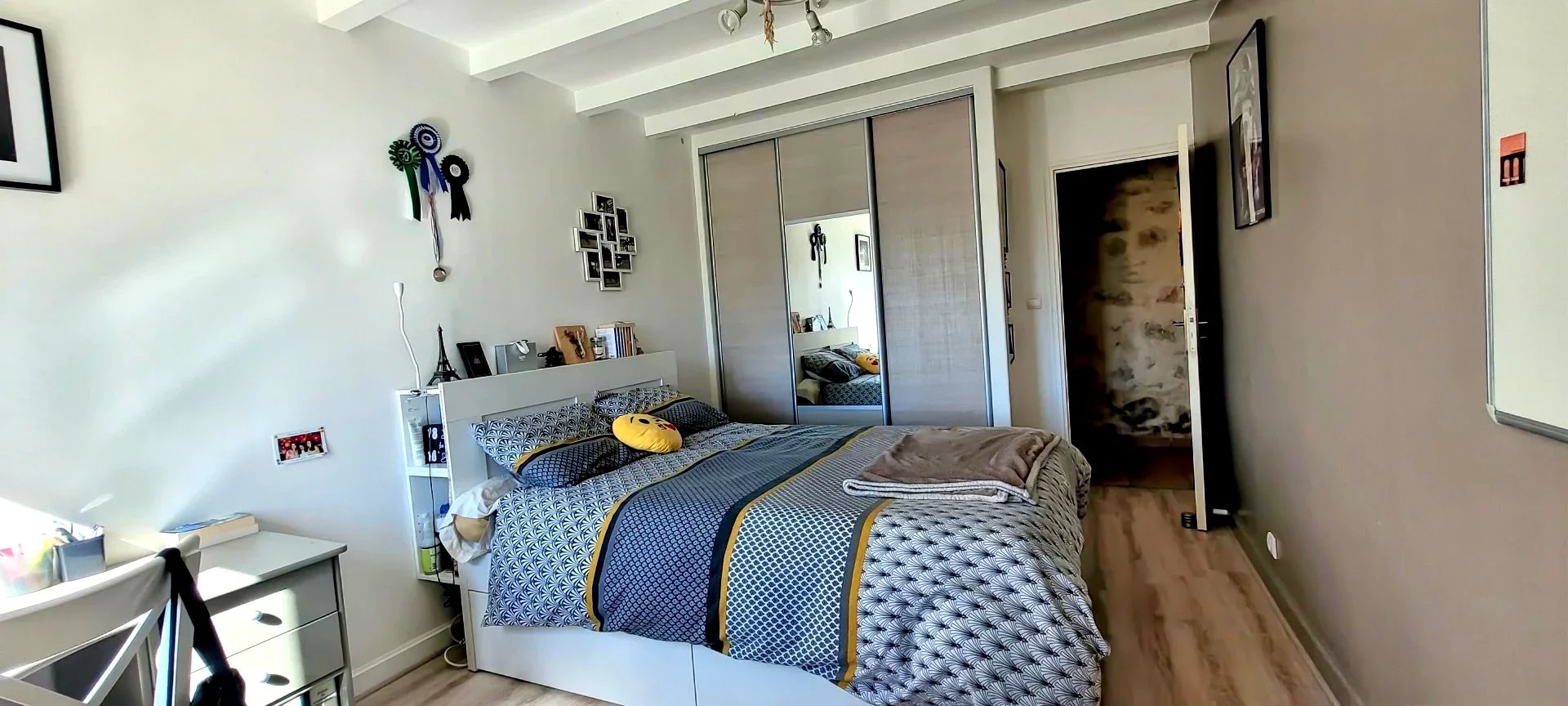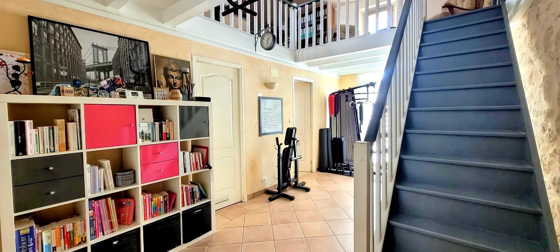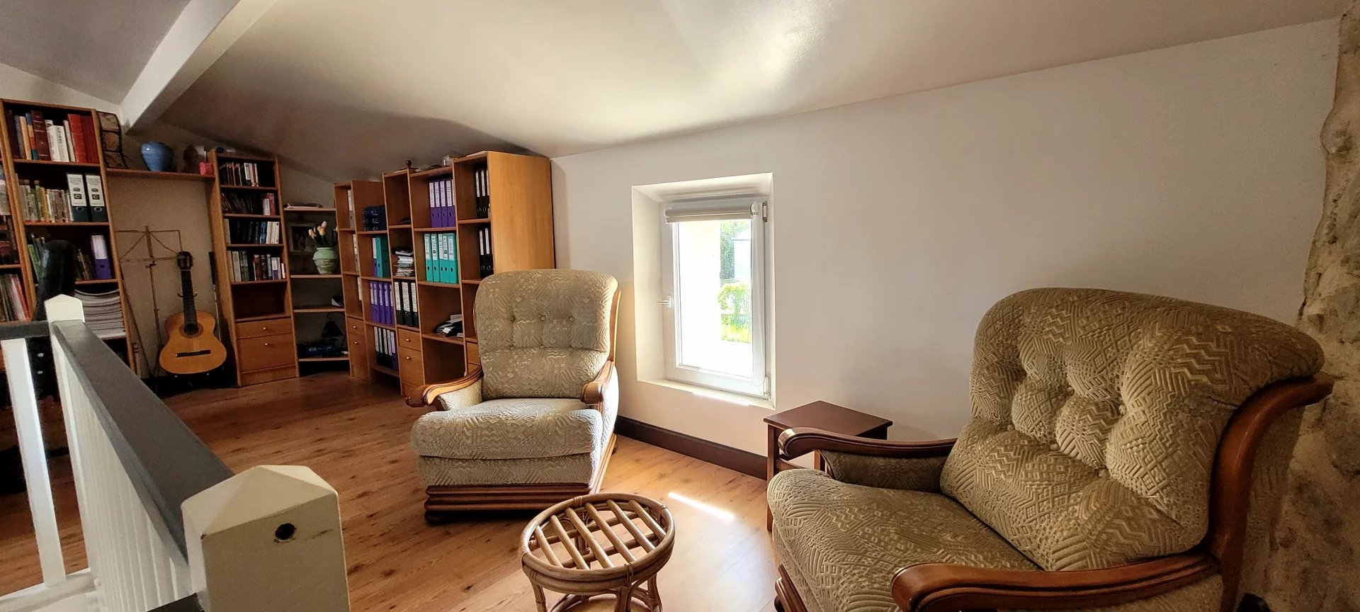 Au premier étage, une vaste mezzanine permet l'installation d'un bureau ou salon télé ou bibliothèque, donnant accès vers 2 chambres supplémentaires et un dressing