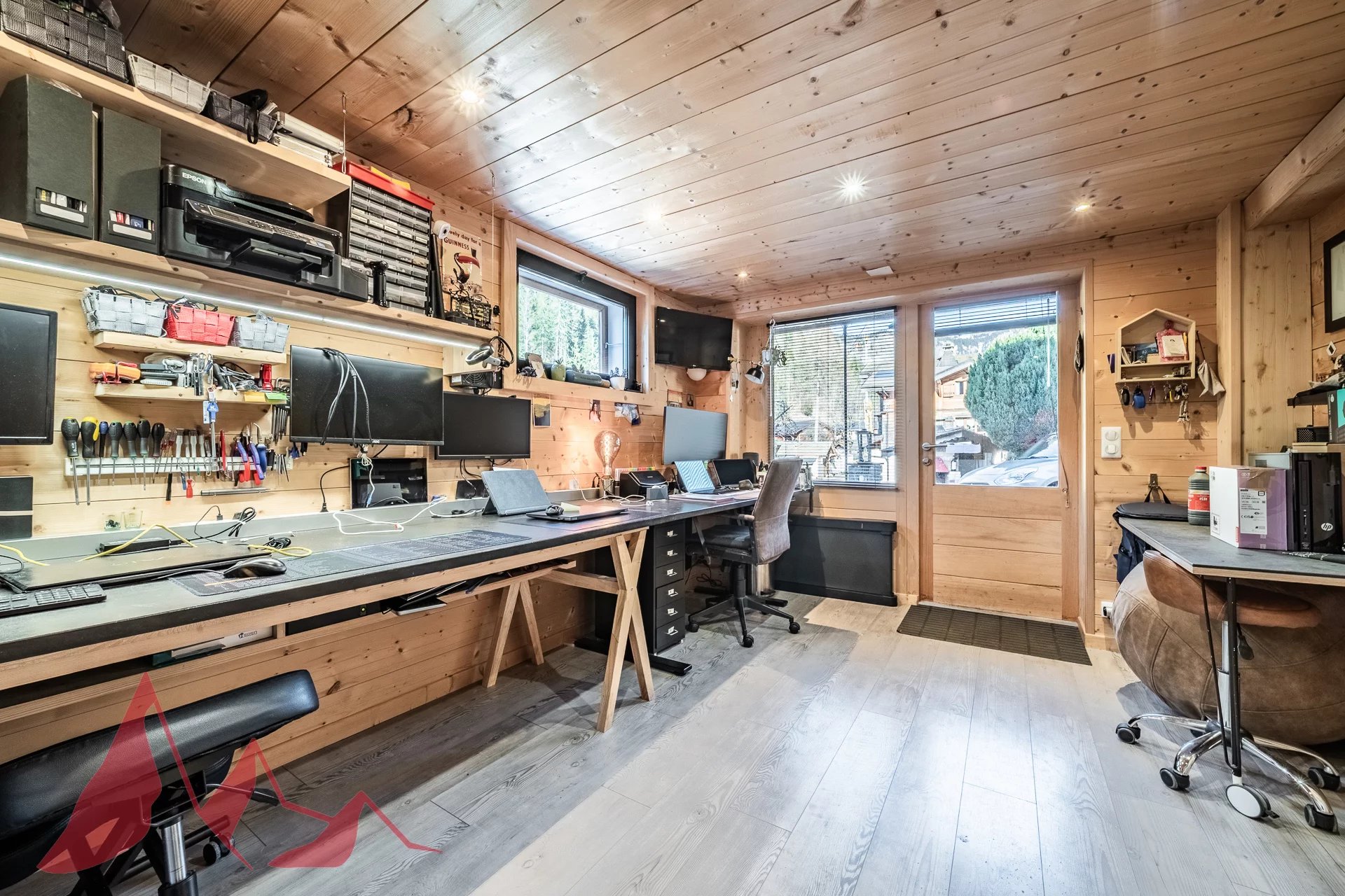 Un grand espace bureau avec accès au jardin (un espace très modulable pouvant servir de salon de jardin supplémentaire ou de salle de jeux pour les enfants)