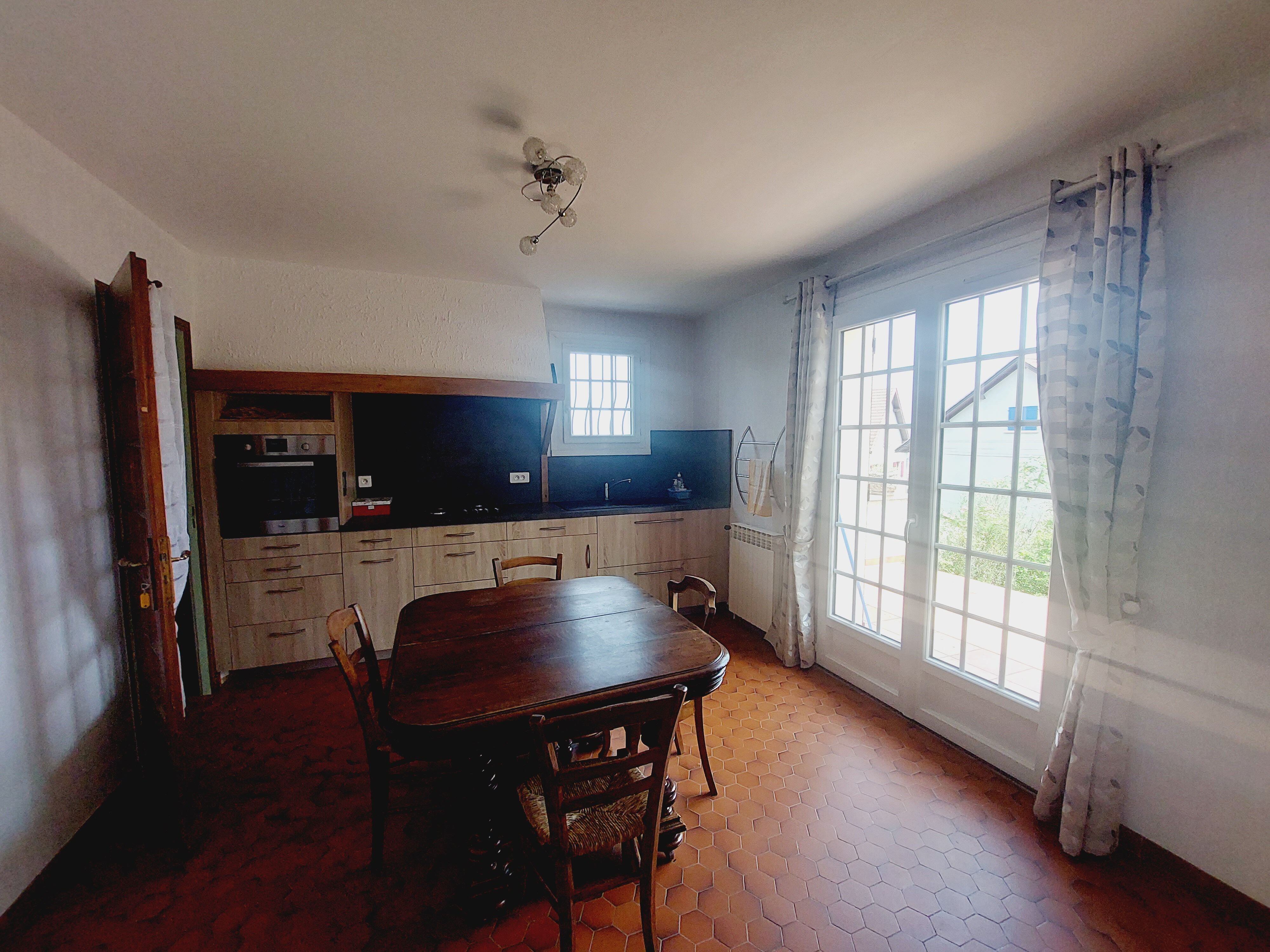 - d'un rdc avec un hall d'entrée donnant sur cuisine équipée ainsi que sur séjour salle à manger, un wc, une salle de bains et 3 chambres.