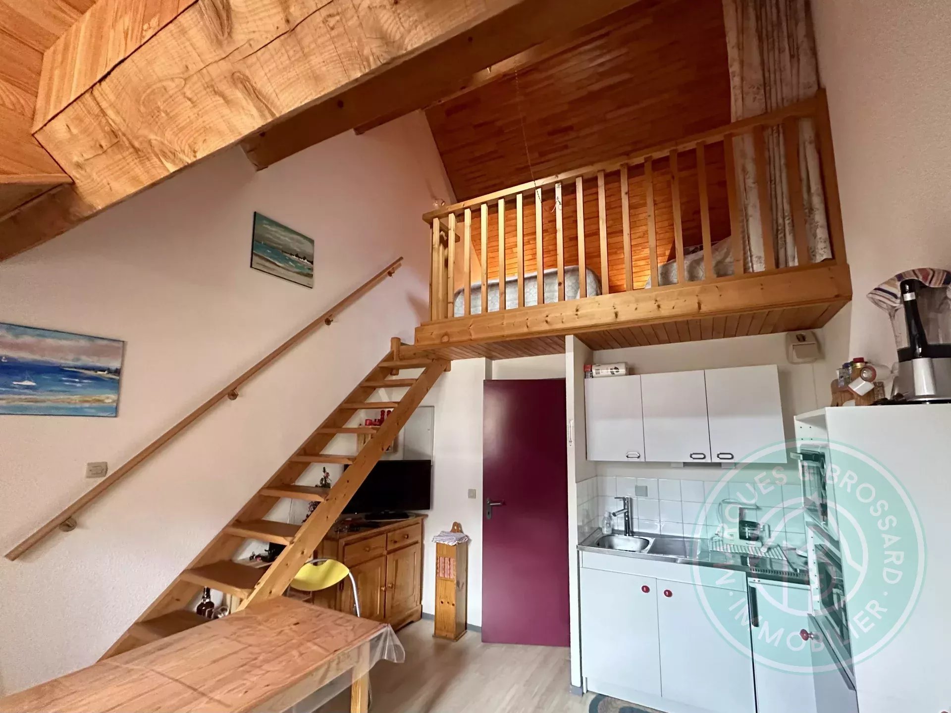 Il se compose d’une entrée avec coin nuit, d’une agréable pièce de vie avec cuisine aménagée et équipée ouverte sur un espace repas, ainsi que d’une mezzanine offrant un espace nuit.