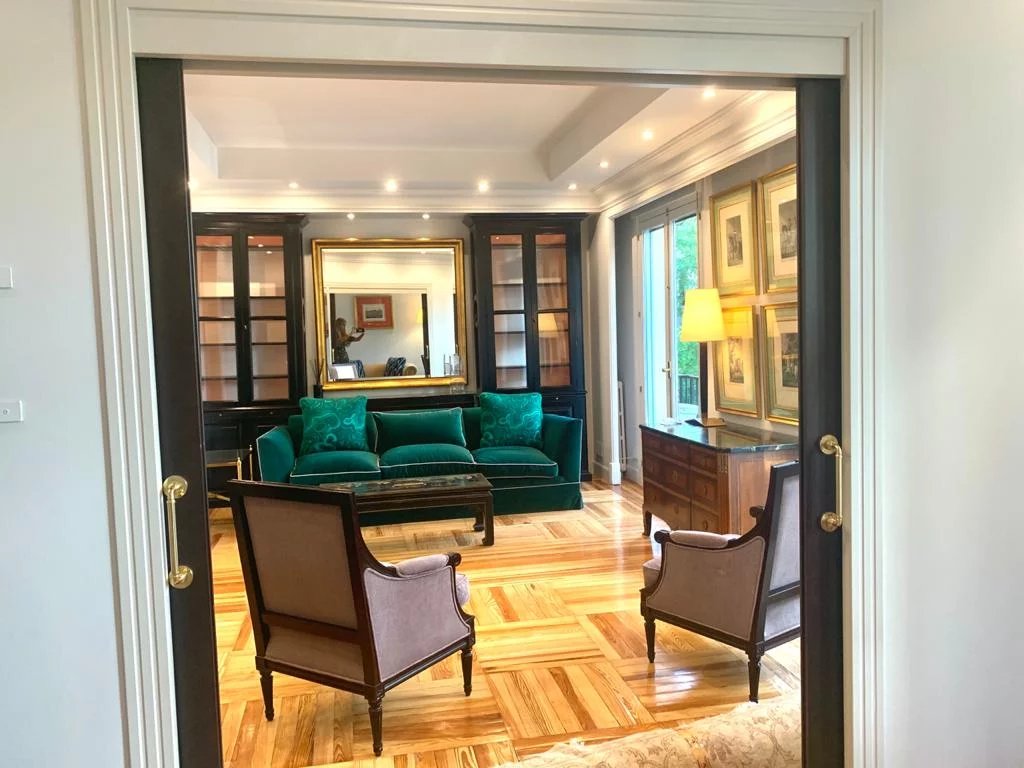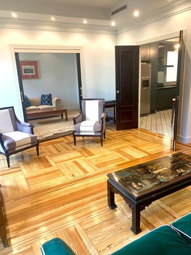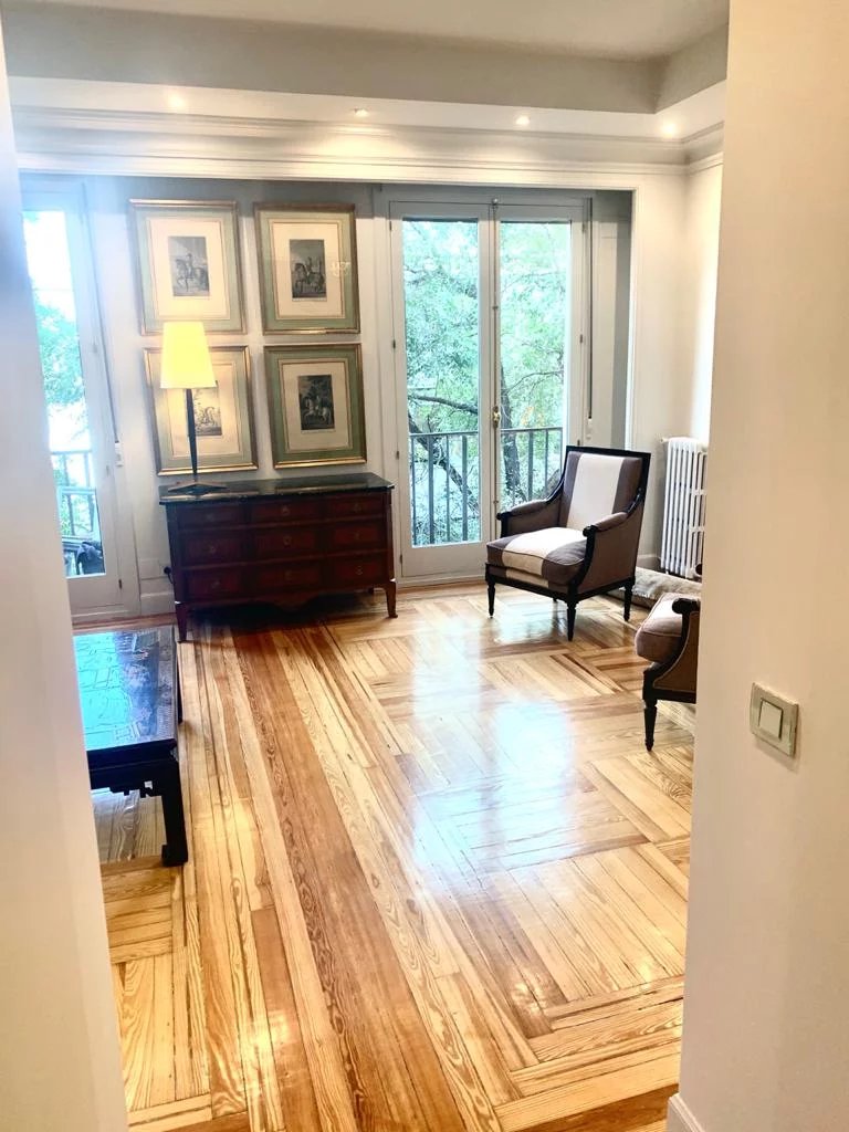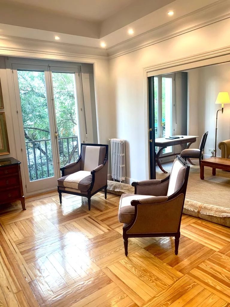 The layout currently includes 2 bedrooms, a study that can easily be converted into a third bedroom, 2 bathrooms, a separate living room and an independent kitchen. The building offers concierge service, central heating and air conditioning, with community fees of approximately €300 per month. A unique opportunity to acquire a character‑filled, light‑flooded property in the heart of Barrio de Salamanca, directly opposite Sanchez Romero Gourmet and surrounded by all amenities.