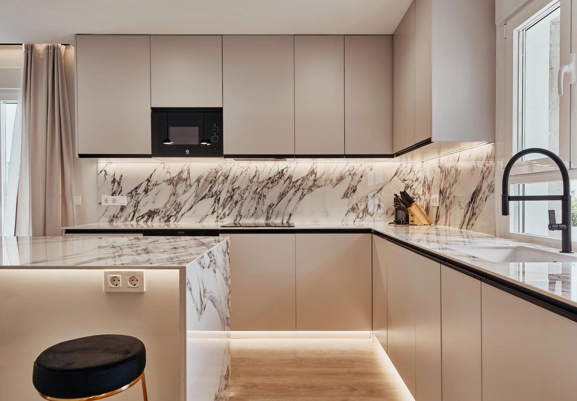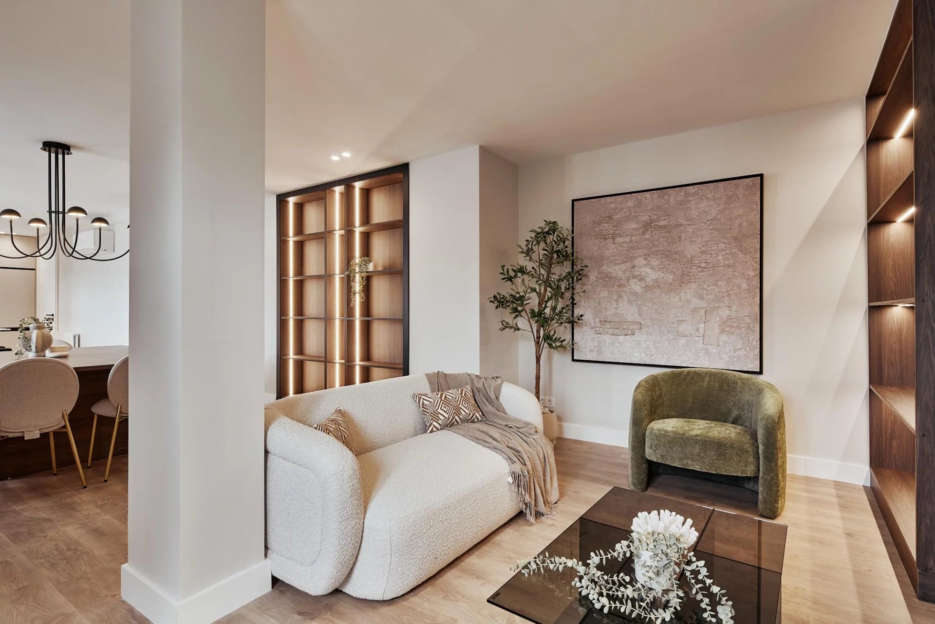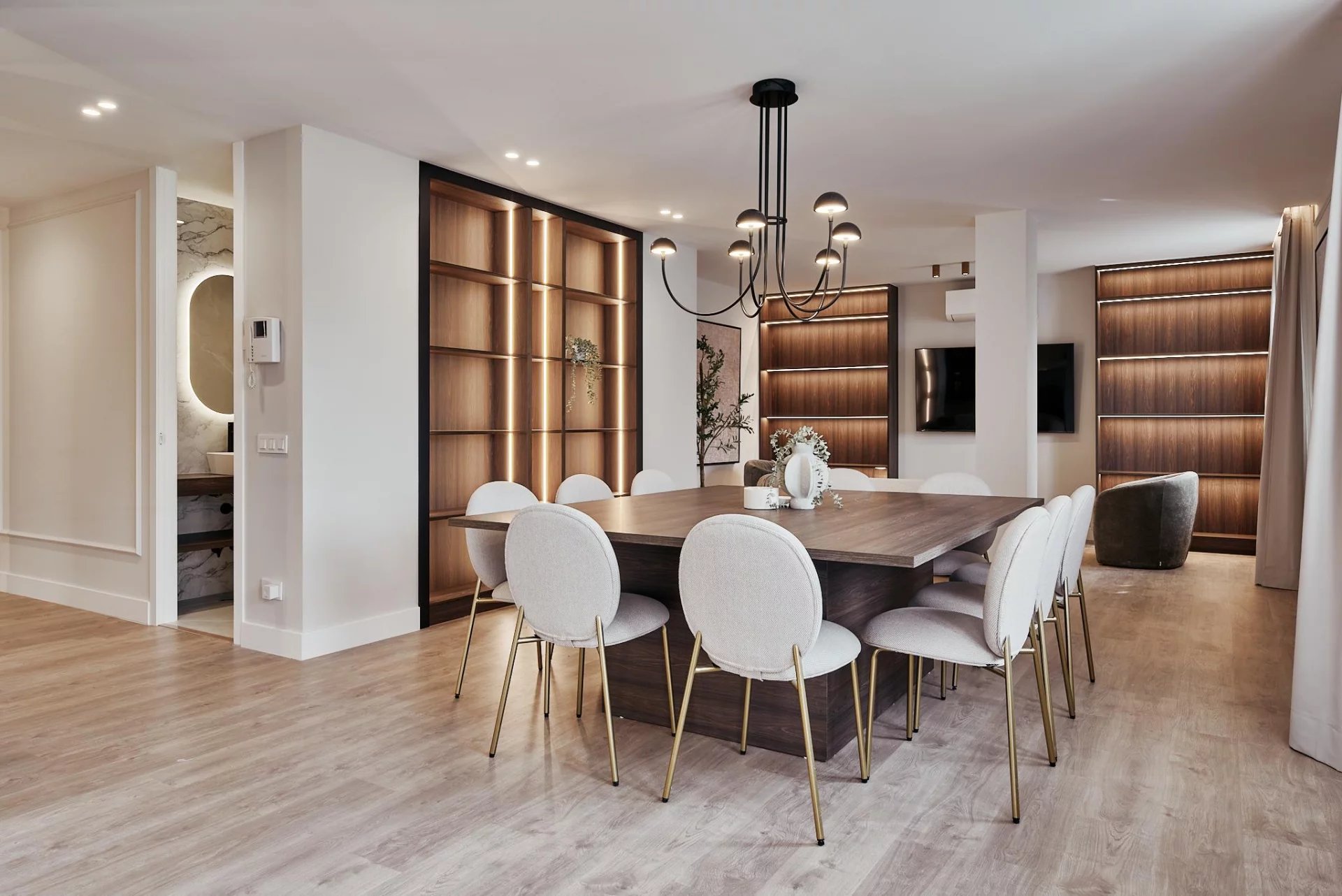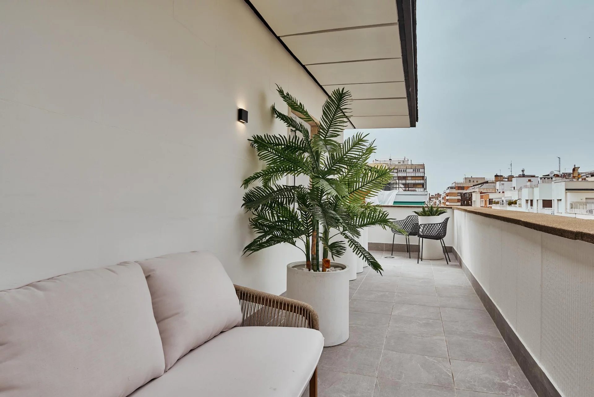 The day area opens to the exterior with a generous living‑dining room that connects directly to the terrace, and a fully fitted kitchen that includes a separate laundry room. The night area comprises three bedrooms and three full bathrooms, plus a walk‑in wardrobe that enhances the property’s comfort and residential feel.