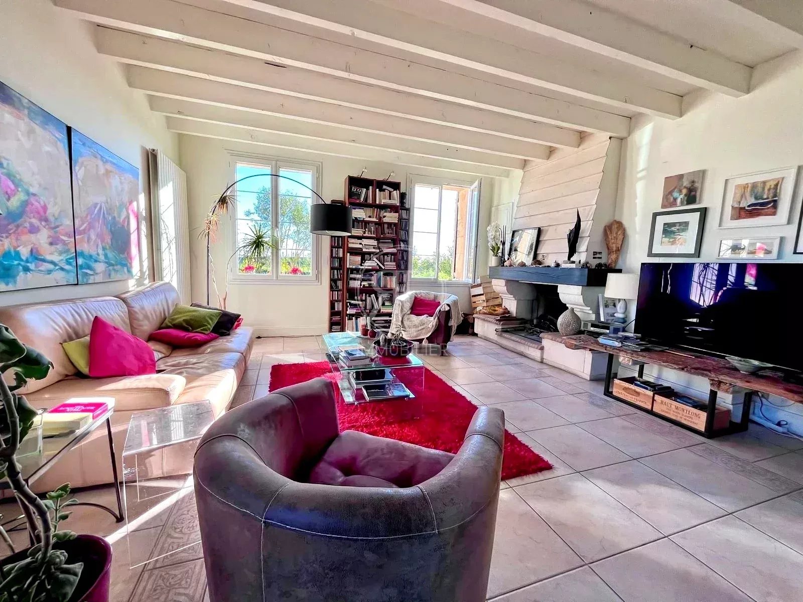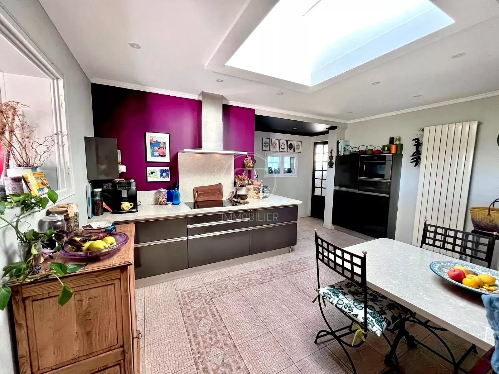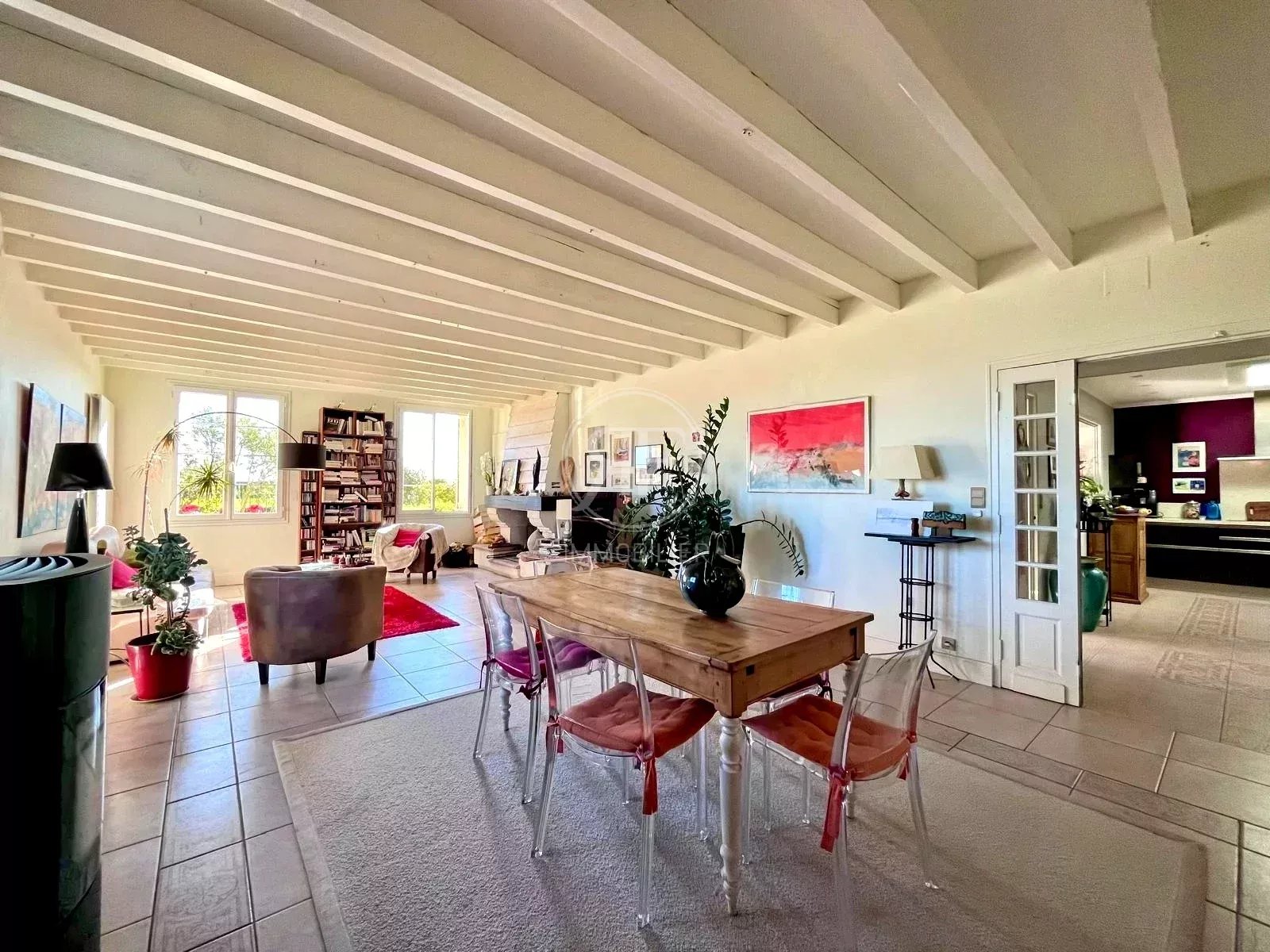 La véranda s'ouvre ensuite sur la cuisine équipée, puis un séjour de plus de 45 m², disposant d'une cheminée et d'un poêle à pellets.