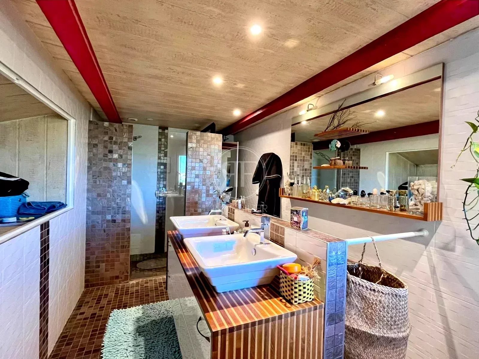 A l'étage, on découvre une grande salle d'eau, trois chambres dont une avec salle d'eau, et un WC séparé.
