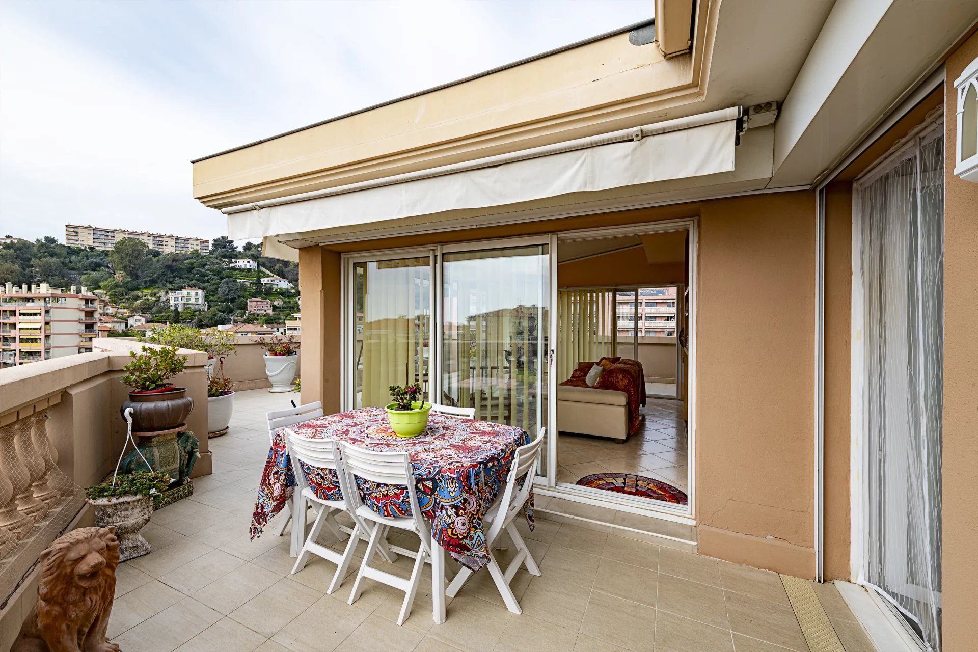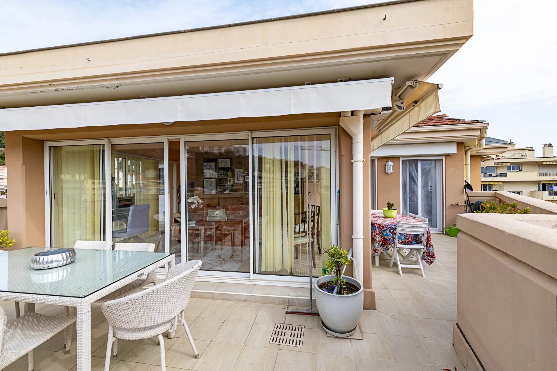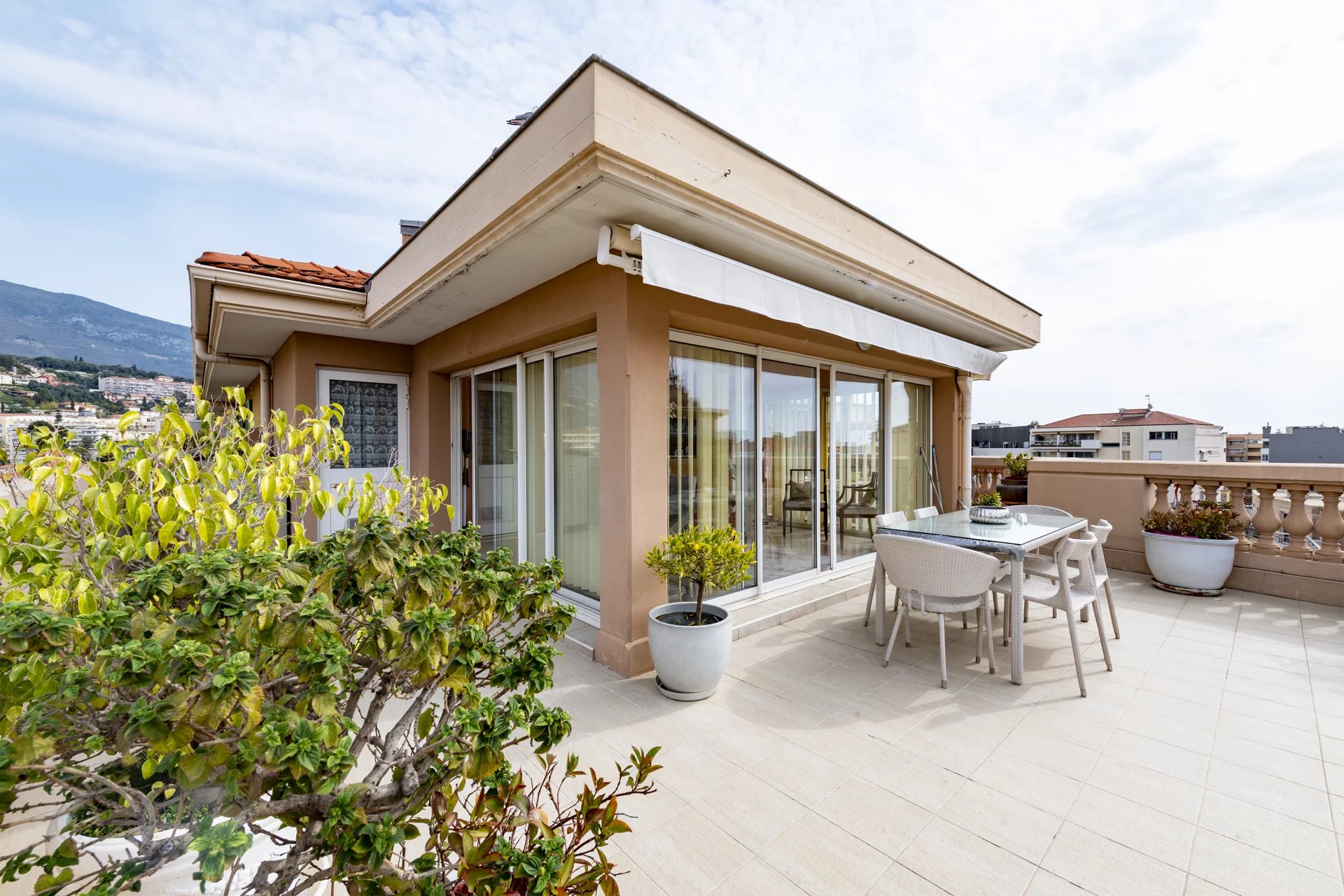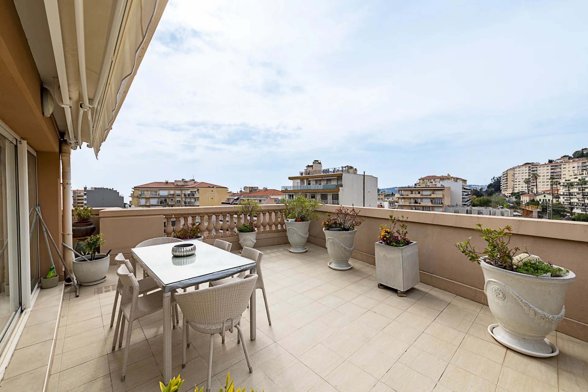 Atout majeur de ce bien : une exceptionnelle terrasse de 60 m² de plain-pied, offrant une vue dégagée avec aperçu mer, idéale pour profiter pleinement du climat azuréen.