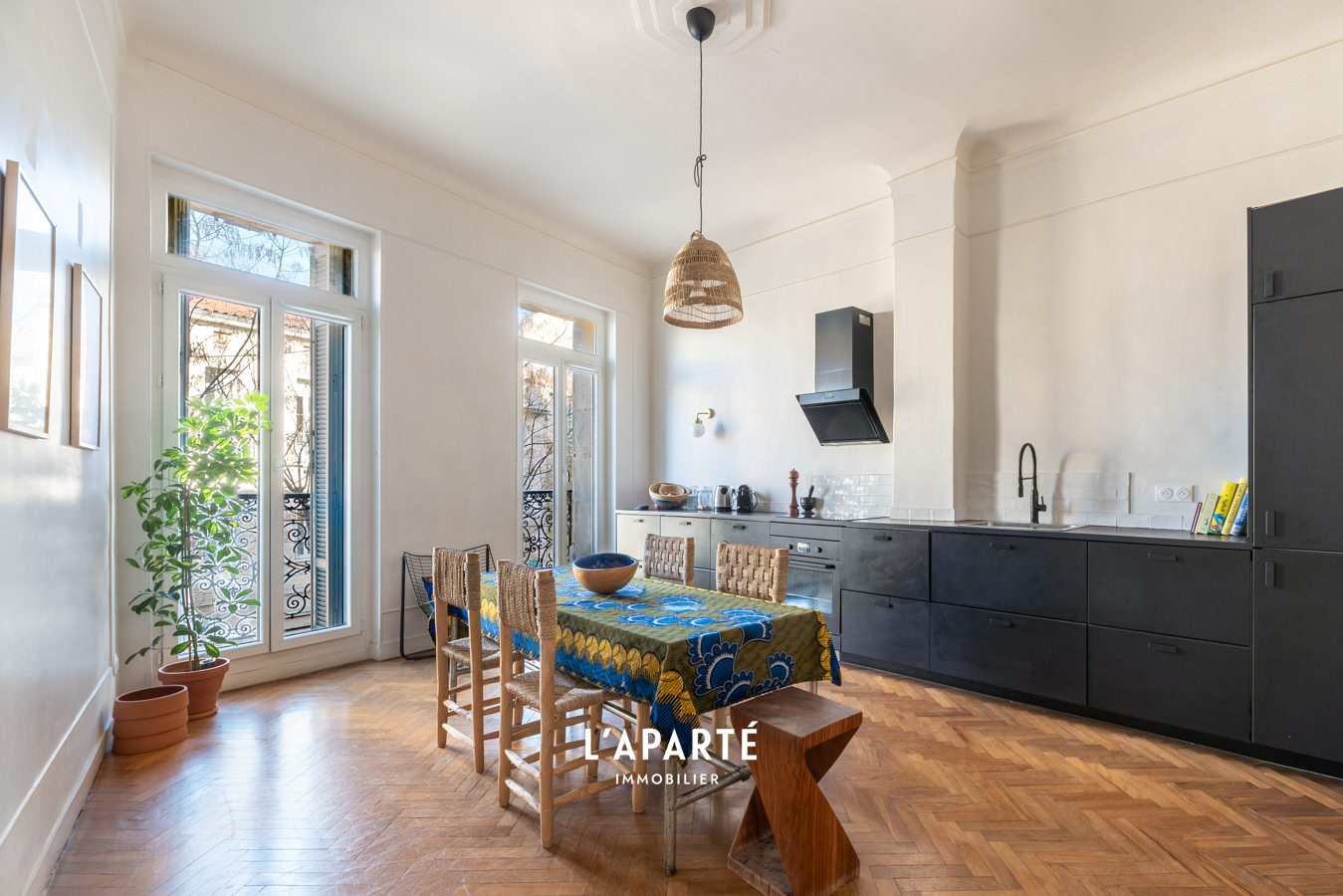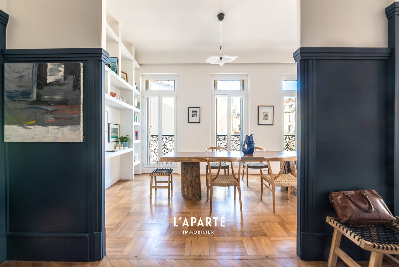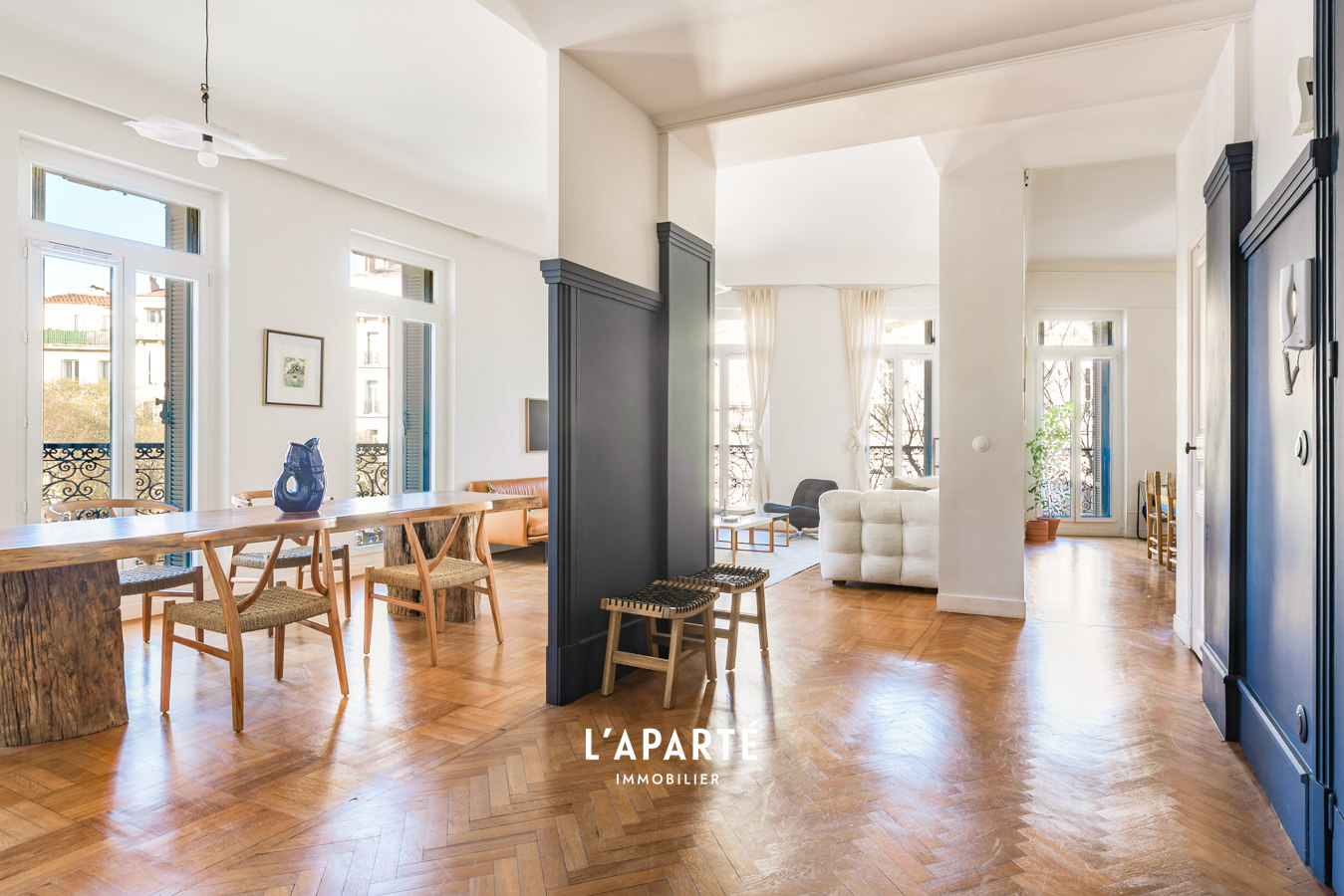 Au coeur de Notre-Dame-du-Mont, l'un des quartiers les plus recherchés de Marseille, l'aparté vous propose aujourd'hui cet appartement T5 de 158 m², entièrement rénové en 2020, alliant le charme bourgeois d'un immeuble du début du XXe siècle et le confort moderne de qualité. Dès l'entrée, vous serez séduit par les volumes généreux et les hauteurs sous plafond qui confèrent à cet appartement une atmosphère noble et spacieuse. La pièce de vie composée d'une belle entrée, d'un salon séjour et d'une cuisine séparée s'étend sur une surface de plus de 60m2 m², et capte la lumière à travers de nombreuses portes-fenêtres. C'est un espace convivial et élégant, parfait pour recevoir.La cuisine séparée, entièrement équipée, est à la fois fonctionnelle et esthétique. Le parquet massif , présent dans tout l'appartement, apporte une touche de chaleur et de raffinement à chaque pièce. Côté nuit, vous retrouverez 4 chambres dont une équipée de sa propre salle d'eau. Une deuxième salle de bains avec baignoire et douche complètent cet espace .Cette configuration offre un confort optimal pour une famille. Au sous sol enfin, une grande cave offre un espace non négligeable de rangement supplémentaire. Un bien d'exception, idéal pour une famille en quête d'espace et de confort. Situé à deux pas des commerces, des écoles ( cours Bastide et autres ) et du métro, cet appartement bénéficie d'un emplacement central et stratégique. Le quartier de Notre-Dame-du-Mont, connu pour son ambiance villageoise et sa proximité avec le centre-ville, offre un cadre de vie idéal pour ceux qui recherchent à la fois praticité et dynamisme. L'appartement a été rénové entièrement et présente des prestations de qualité. En effet la climatisation gainable distribue chaque pièce de l'appartement, le double vitrage est de qualité, l'électricité et la plomberie sont aux normes. Cet appartement se situe dans un immeuble de caractère, témoin de l'architecture marseillaise du début du XXe siècle. Les marqueurs du cachet de cet époque ont été préservés, conférant à ce bien une âme unique. N'hésitez pas à nous contacter pour des informations complémentaires. Honoraires à la charge du vendeur. Foncier : 2500 euros Performance énergétique : B Emissions GES : A Charges de copropriété : 170 euros / mois