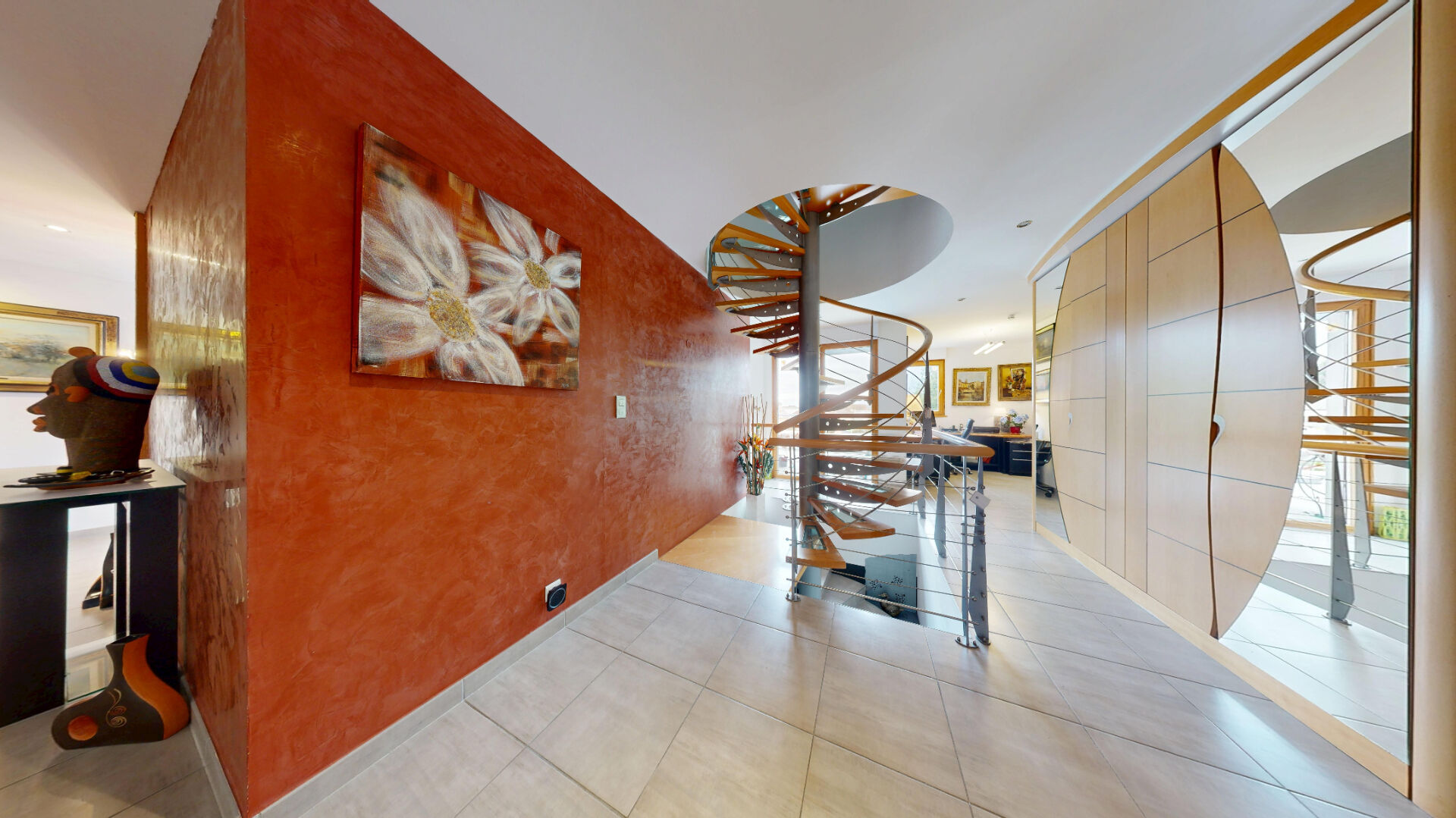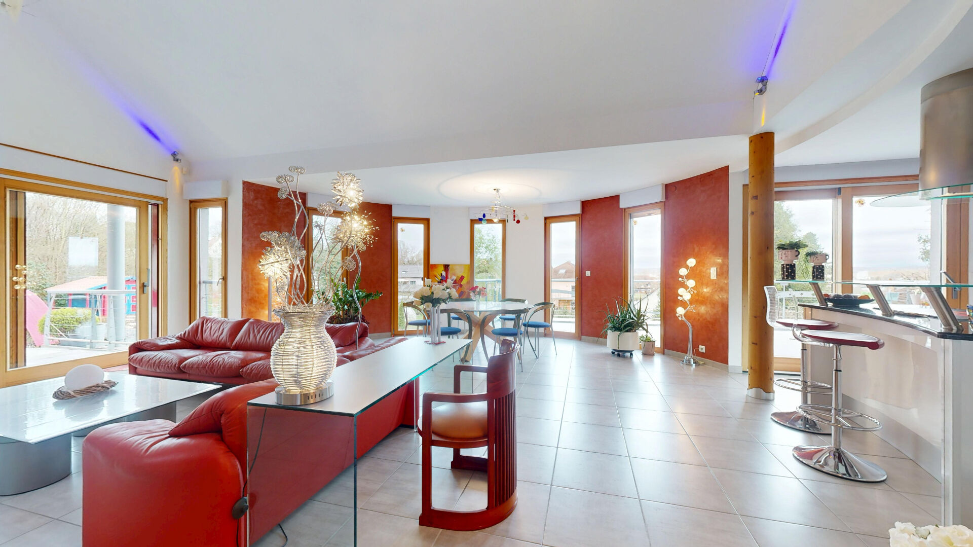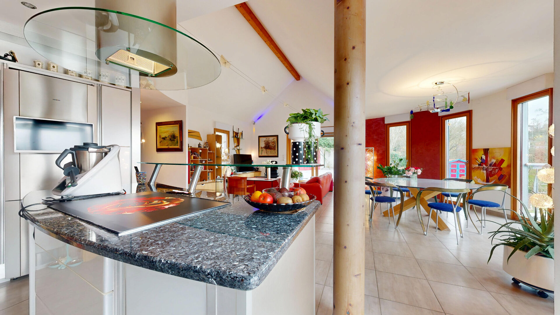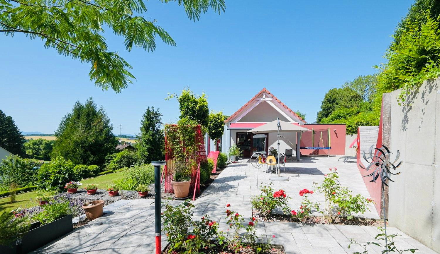 Certaines maisons se décrivent par leurs mètres carrés. D'autres se racontent. A quelques minutes du centre d'Altkirch et à seulement a 30 minutes de Bâle, cette propriété d'architecte dévoile une signature très particulière celle d'une maison où l'art, la lumière et l'architecture dialoguent naturellement. Pensée dès l'origine comme un lieu de vie confortable et élégant, la maison a ensuite été sublimée par l'artiste Paulter Gilbert, ancien menuisier devenu créateur reconnu. Son travail se retrouve dans plusieurs éléments de la maison des portes en bois d'orme réalisées sur mesure, garde-corps, éléments d'agencement et détails architecturaux qui donnent à l'ensemble une identité unique. Le coeur de la maison s'organise autour d'un magnifique espace de vie baigné de lumière, avec plafond cathédrale et larges ouvertures sur le jardin et la terrasse. La cuisine ouverte, conviviale et parfaitement intégrée, s'inscrit naturellement dans cet espace. Développant environ 256 m² habitables, la maison propose 9 pièces, dont 5 chambres et 4 salles de bains, offrant un confort de vie particulièrement recherché. Parmi les nombreux atouts de la propriété : Garage avec accès direct au rez-de-chaussée Chambres au rez-de-chaussée, idéales pour une vie de plain-pied 4 salles de bains, pour un confort familial optimal Salle de sport dédiée Cave à vin d'environ 20 m² Grand espace de vie avec belle hauteur sous plafond Cuisine ouverte contemporaine Menuiseries bois sur mesure Nombreuses baies vitrées donnant sur le jardin Volumes très lumineux Maison parfaitement entretenue Toiture avec étanchéité récemment refaite Chauffage géothermique performant Planchers chauffants Excellente performance énergétique (DPE B 103 kWh / GES A 3 kWh ) Distribution intelligente sur trois niveaux Possibilité d'usage mixte privé / professionnel PRIX : 945 000 euros FAI Référence annonce : 524 Contact : Sophie GLASER Responsable Pole Transaction A l'extérieur, le terrain paysager de 23 ares, entretenu avec soin par un paysagiste, entoure la maison comme un écrin de verdure. La grande terrasse dominante permet de profiter pleinement de l'environnement calme et du panorama dégagé. Cette propriété s'adresse à celles et ceux qui recherchent un lieu de vie singulier, où la qualité de construction, l'architecture et la sensibilité artistique se rencontrent. STABULUM IMMOBILIER MULHOUSE Sophie GLASER (EI) Agent Commercial - Numéro RSAC : - .