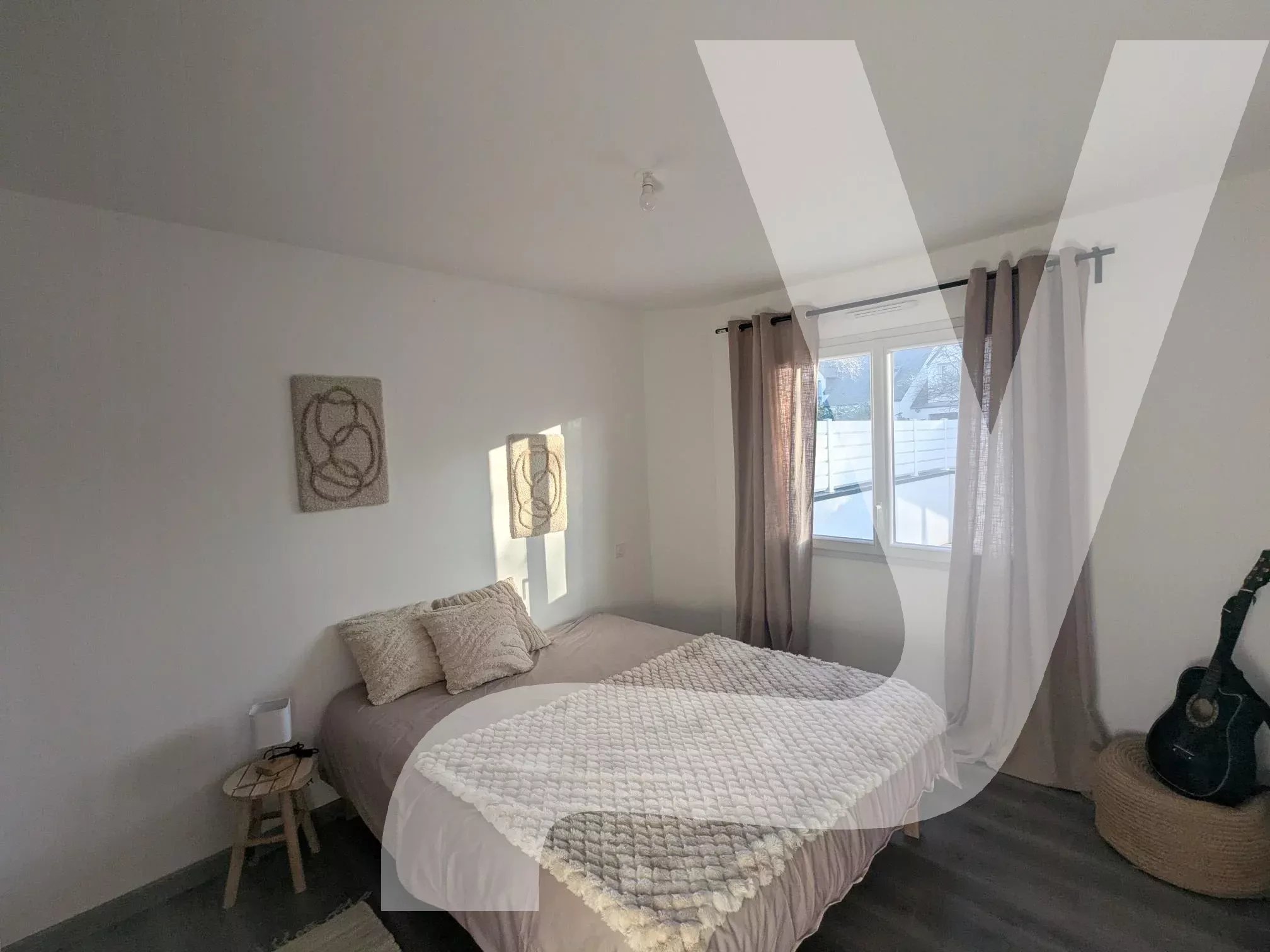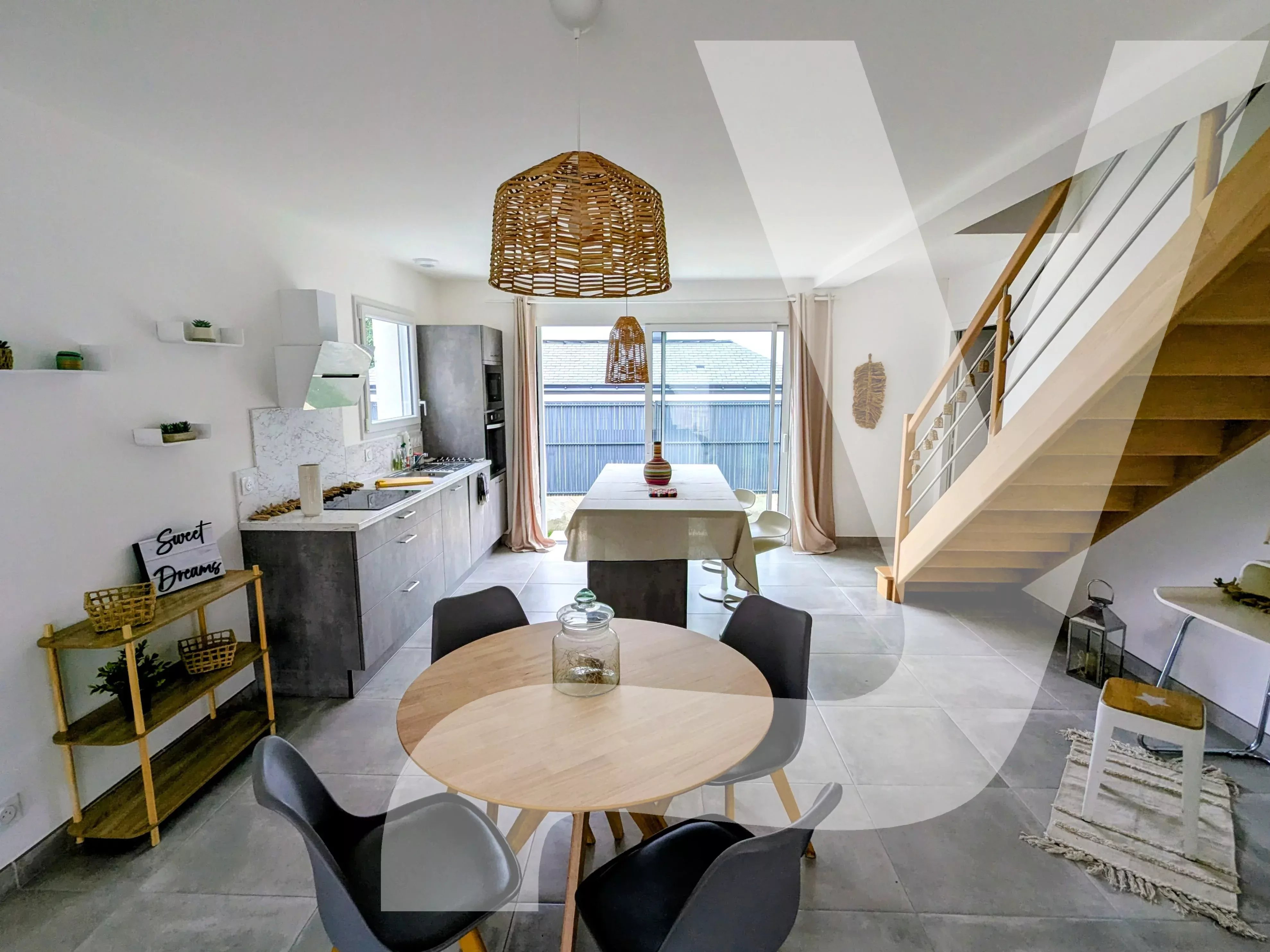 EN EXCLUSIVITÉ CHEZ CITYLIFE NANTES NORD Idéalement située en plein cœur de Vigneux-de-Bretagne, à proximité immédiate des commerces, écoles, transports, services de santé et infrastructures sportives, cette maison récente de 118 m², construite en 2023, bénéficie d’un emplacement privilégié dans une rue calme à sens unique, en retrait de la route, offrant un cadre de vie à la fois central et paisible. Dès l’entrée indépendante, un espace fonctionnel avec deux placards intégrés vous accueille et mène à une agréable pièce de vie traversante lumineuse d’environ 45 m². Le salon-séjour s’ouvre sur une spacieuse terrasse de plus de 45 m² exposée plein sud, sans vis-à-vis, idéale pour recevoir famille et amis en toute tranquillité. La cuisine aménagée et entièrement équipée (plaque à induction, hotte, four, micro-ondes, lave-vaisselle intégré) s’organise autour d’un îlot central modulable et offre un accès au jardin clos, agrémenté d’un charmant puits en pierre fonctionnel. Une buanderie/arrière-cuisine avec de nombreux rangements et un espace bureau sous l’escalier viennent optimiser l’organisation de ce niveau. Toujours de plain-pied, une suite parentale conforme aux normes PMR dispose de son dressing et de sa salle d’eau privative. Un WC visiteurs aux normes PMR avec lave-mains et rangement complète également ce niveau. À l’étage, l’espace nuit se compose de trois chambres aux dimensions agréables, sur parquet, avec chacune leur espace dressing, d’un WC indépendant et d’une salle de bains familiale équipée d’une baignoire, d’une douche, d’une double vasque et de rangements. Fonctionnelle et confortable, cette maison bénéficie d’une mitoyenneté uniquement par le garage, garantissant tranquillité et intimité. Elle est clé en main, prête à accueillir votre projet de vie. Quelques avantages supplémentaires : grand garage, grenier, porte sectionnelle motorisée, distribution optimisée, nombreux rangements intégrés, chauffage au sol réglable par zone, performance énergétique très économique, domotique qui pilote les volets roulants électriques, fenêtres oscillo-battantes dans WC, cuisine et buanderie, assurance dommages-ouvrage valable pendant 7 ans, proximité immédiate de toutes les commodités nécessaires au quotidien. La commune : Vigneux-de-Bretagne est une commune à taille humaine offrant un cadre de vie privilégié : infrastructures scolaires et sportives de qualité, vie associative dynamique, nombreux espaces naturels et accès rapide à Nantes ainsi qu’au bord de mer.