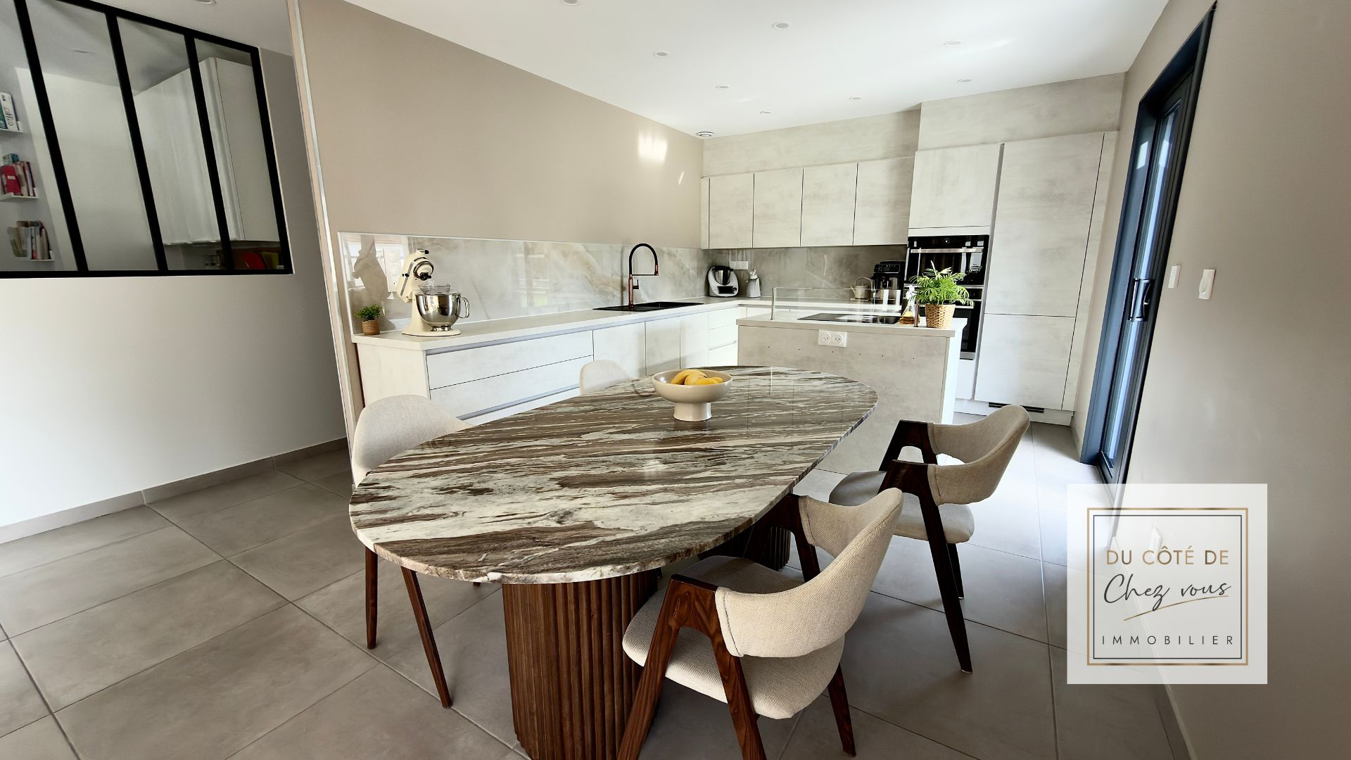 Dans la cuisine comme dans le salon, les baies vitrées à galandage offrent une ouverture totale vers l'extérieur et renforcent la sensation d'espace et de lumière.