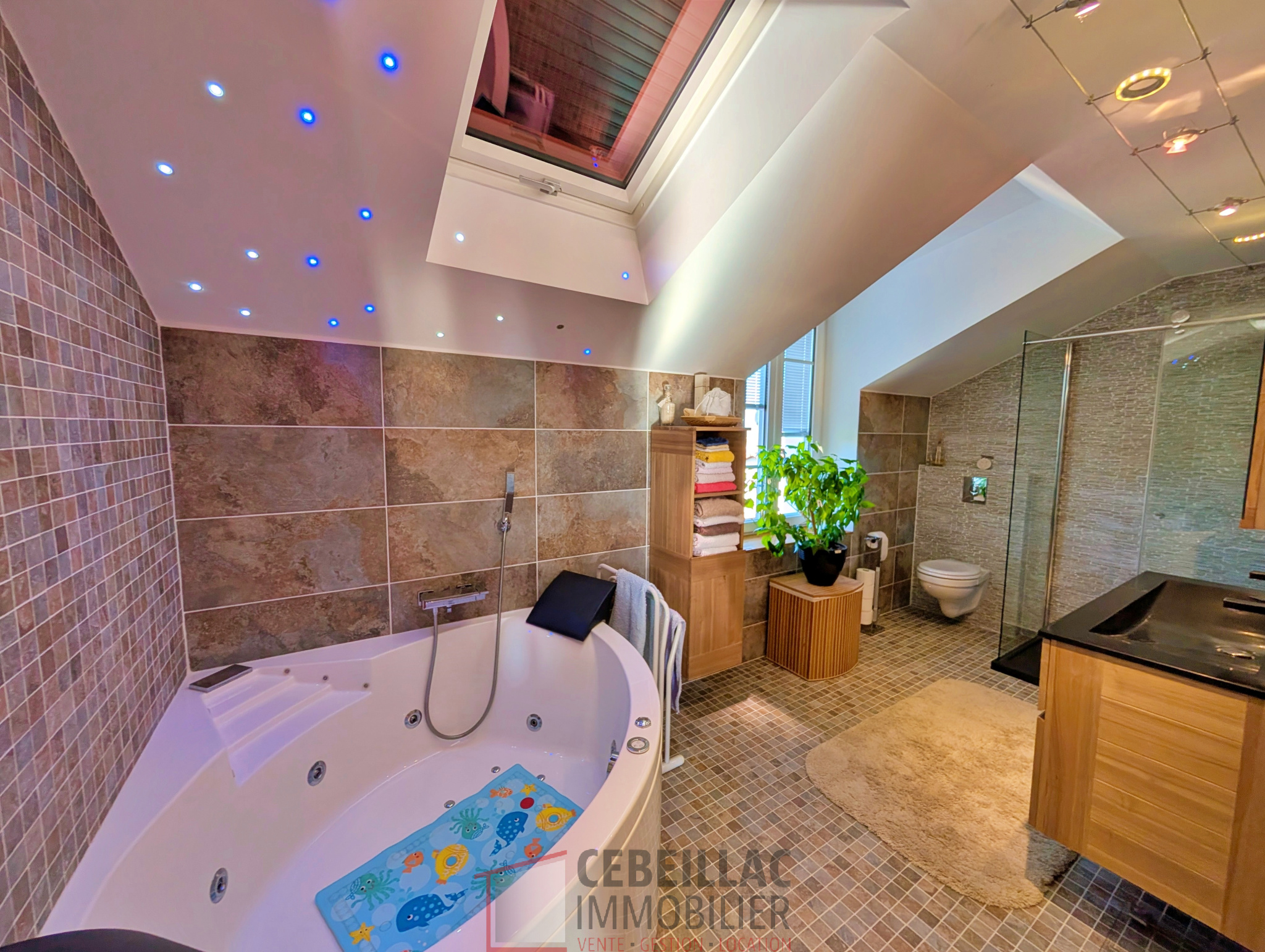 Spacieuse salle de bain de plus de 10 m2 avec baignoire balnéo, douche à l'italienne et vasque
