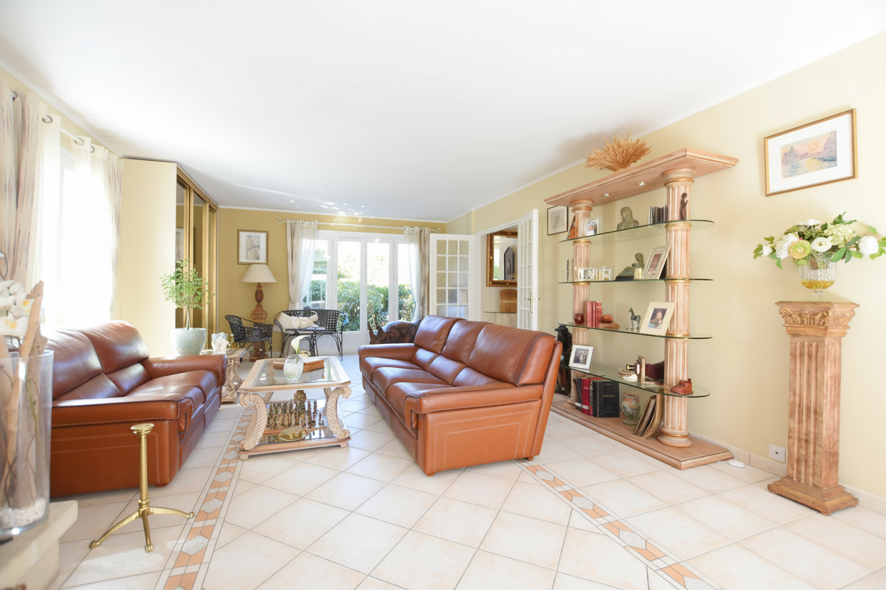SEJOUR TRIPLE volume lumineux de 52 m2 avec cheminée centrale + triple exposition grâce à 4 grandes baies vitrées -> vue imprenable sur le jardin