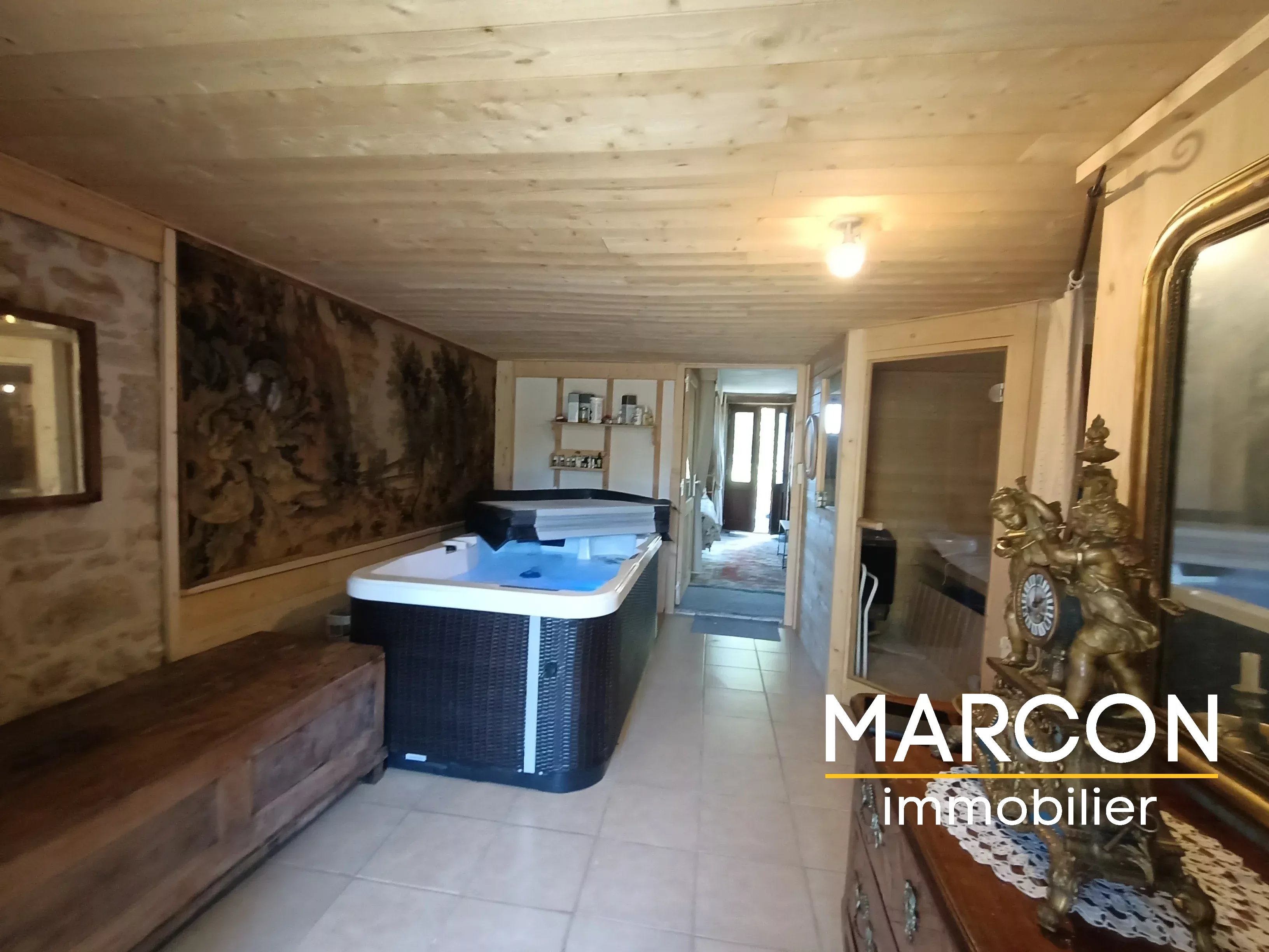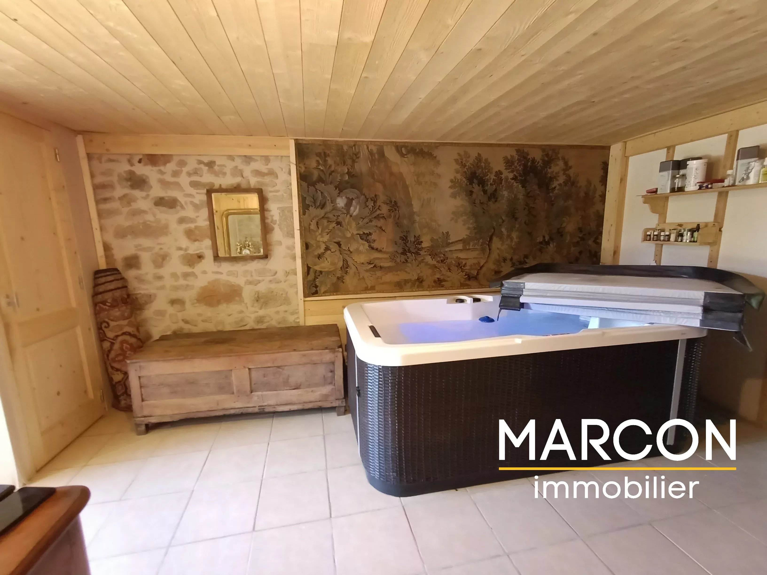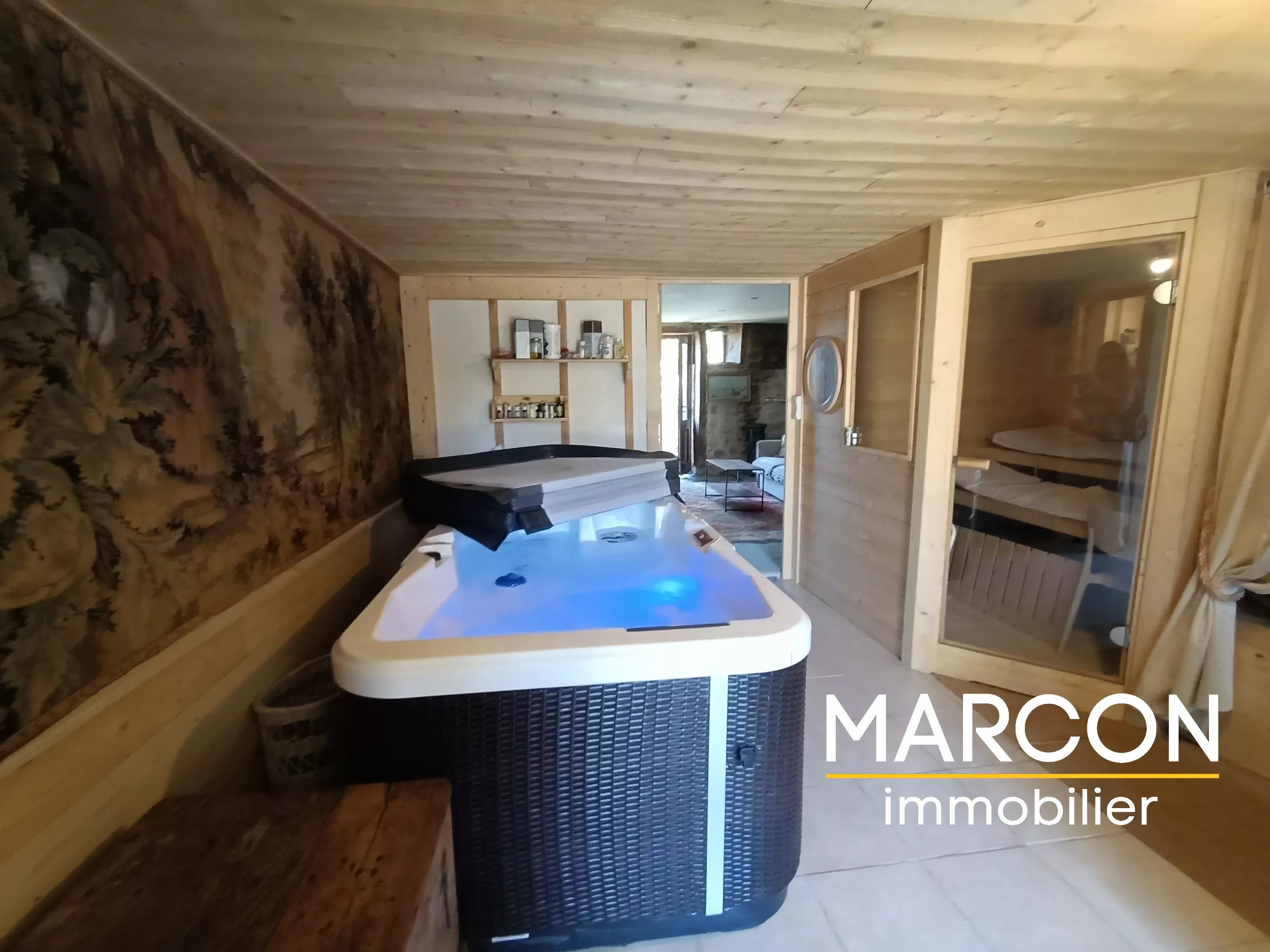 Complété par une grange non attenante, aménagée sur un côté d'un véritable espace bien-être comprenant un sauna, un jacuzzi, une kitchenette avec cuisinière à bois ainsi qu’une chambre avec douche et poêle à bois, offrant un cadre idéal pour recevoir ou se détendre en toute sérénité.