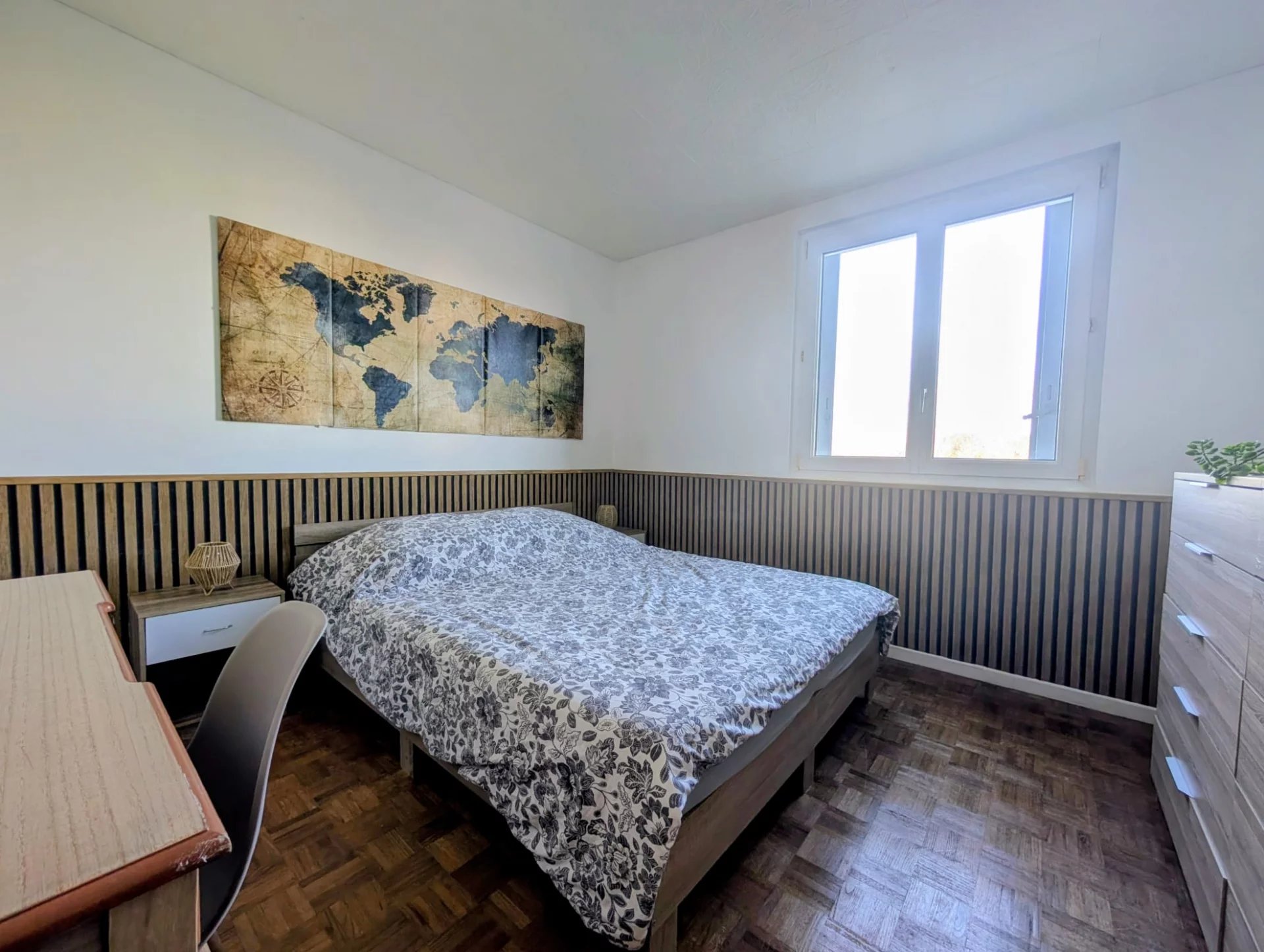 Il se compose d'une vaste entrée avec placards, d'une cuisine équipée avec cellier (ou buanderie), d'un séjour - salle à manger de plus de 30m2 (Possibilité 3ème chambre) , de deux chambres , une salle de bains avec baignoire et WC séparé.