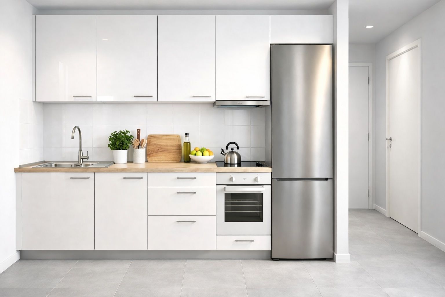 La cuisine, moderne et déjà équipée, est neuve y compris l'électroménager (réfrigérateur-congélateur, plaques, hotte).