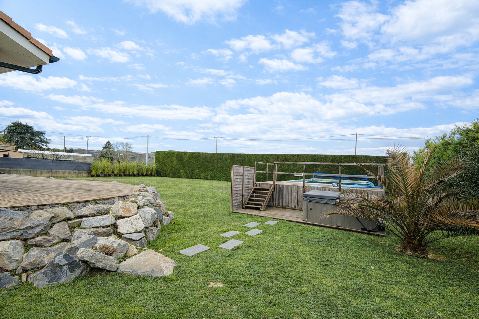 À l'extérieur, vous profitez d'un grand terrain plat, avec un espace pool house, four à pizza et barbecue, ainsi qu'une piscine hors-sol et d'un jacuzzi.