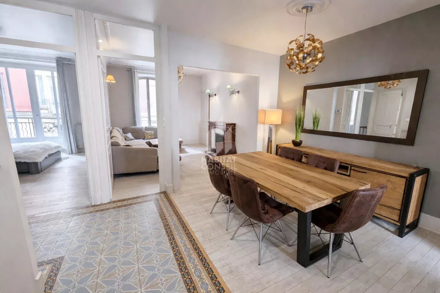 L'appartement se compose d'un généreuse pièce à vivre incluant un espace salle à manger, un espace salon idéal pour se détendre face à l'ancienne cheminée en marbre et d'une cuisine totalement équipée. Le tout dans un espace convivial et moderne