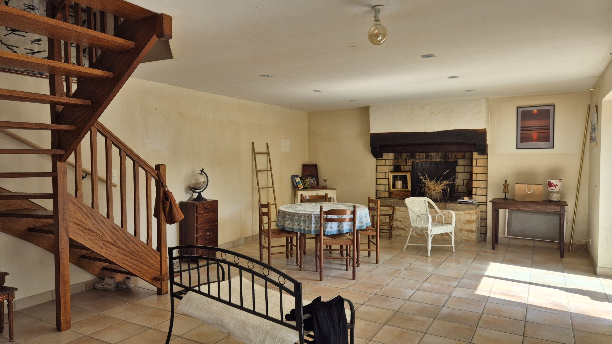Elle comprend une entrée sur séjour avec cheminée, une cuisine ouverte aménagée, une buanderie, un WC.