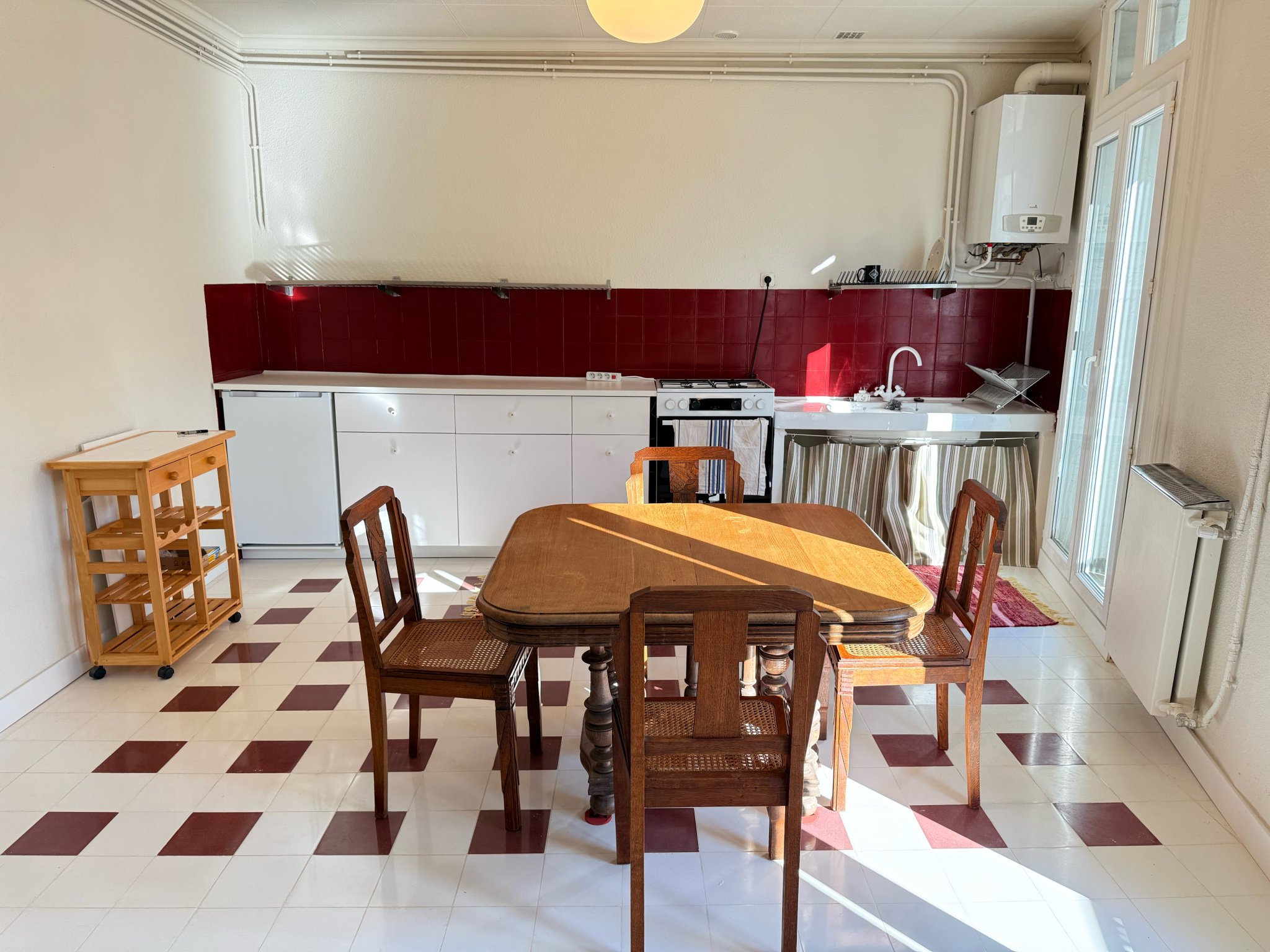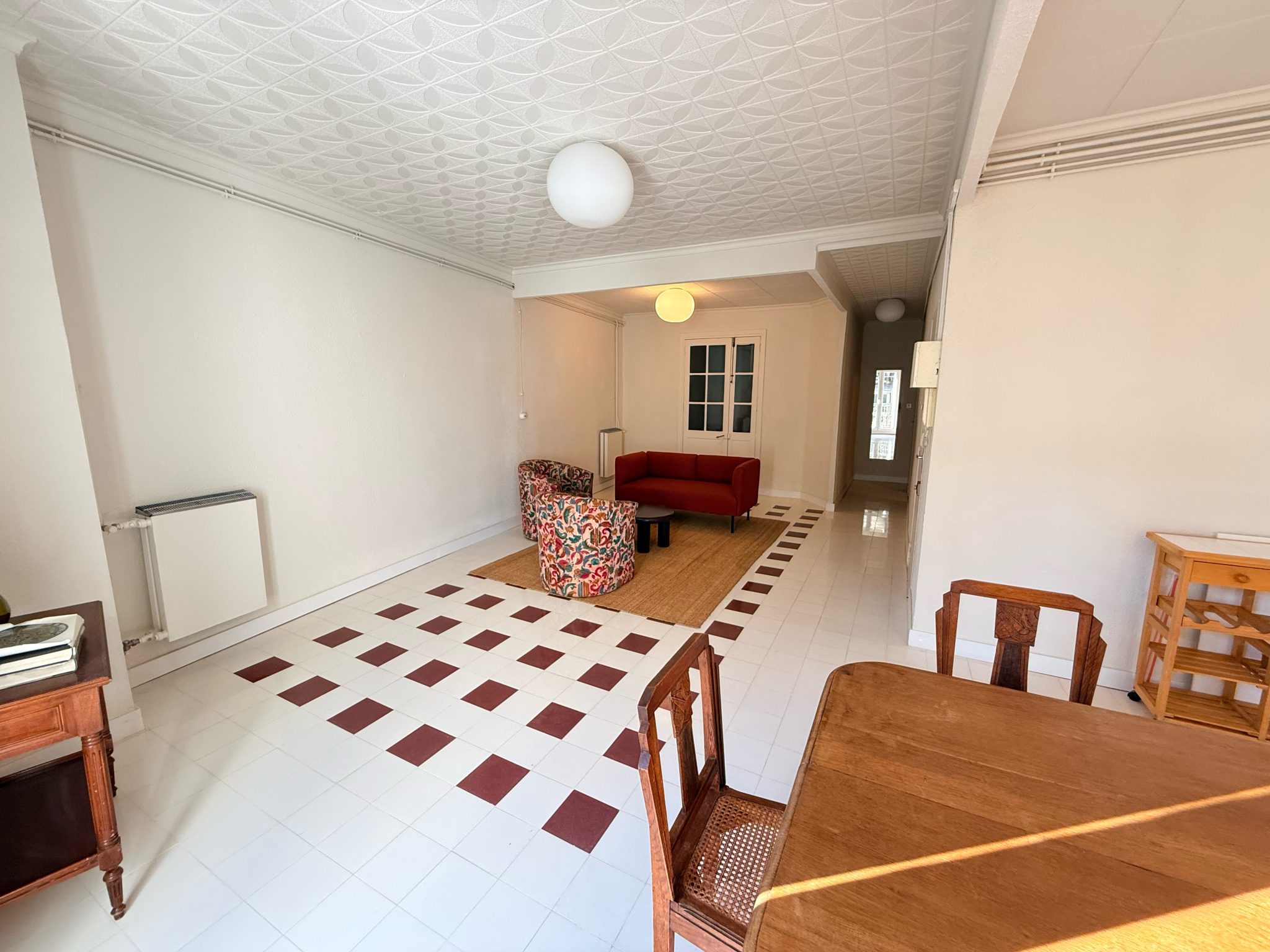Appartement au 1er étage rénové, il se compose d'un spacieux séjour lumineux avec cuisine équipée (four, plaque, frigo).