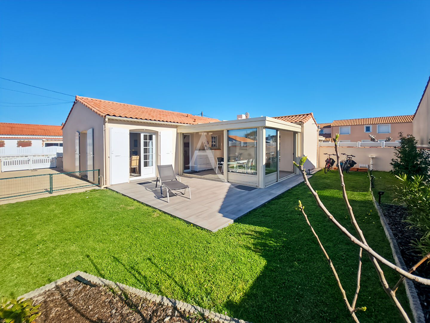 A vendre en EXCLUSIVITE -SAINT HILAIRE DE RIEZ - Située dans un quartier résidentiel calme et recherché à seulement 200 m de la plage, cette charmante maison édifiée sur un terrain entièrement clos et parfaitement entretenu de 300 m², offre un cadre de vie idéal, aussi bien pour une résidence principale que pour une maison de vacances Elle se compose d'un salon séjour, avec cuisine aménagée et équipée, très lumineux, Un couloir desservant 1 chambre, une salle d'eau et un wc. Une véranda qui fait la jonction de la 2ème chambre dont une salle d'eau avec wc. Petit cellier pratique pour le lave-linge, le sèche-linge et pour le rangement. Garage disposant d'une recharge pour véhicule électrique avec mezzanine et portail électrique. Véranda de 19.86 m² avec baies coulissantes, encore sous garantie, terrasse extérieure dallée exposée Sud-Ouest. Ravalement fait en 2022 - toiture neuve 2022 - Aucun gros travaux à prévoir. Réf. 10993 Pour toute information complémentaire ou visite, contactez-nous au 02.51.58.01.74 ou par mail stjean261@ladresse.com (5.50 % honoraires TTC à la charge de l'acquéreur.)