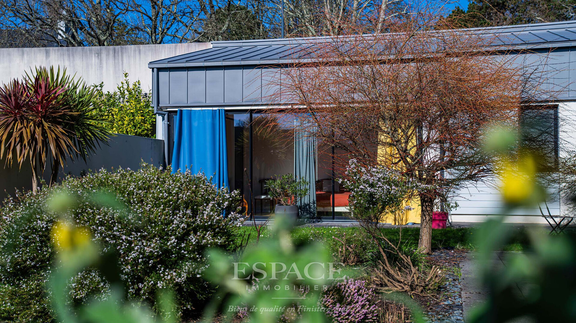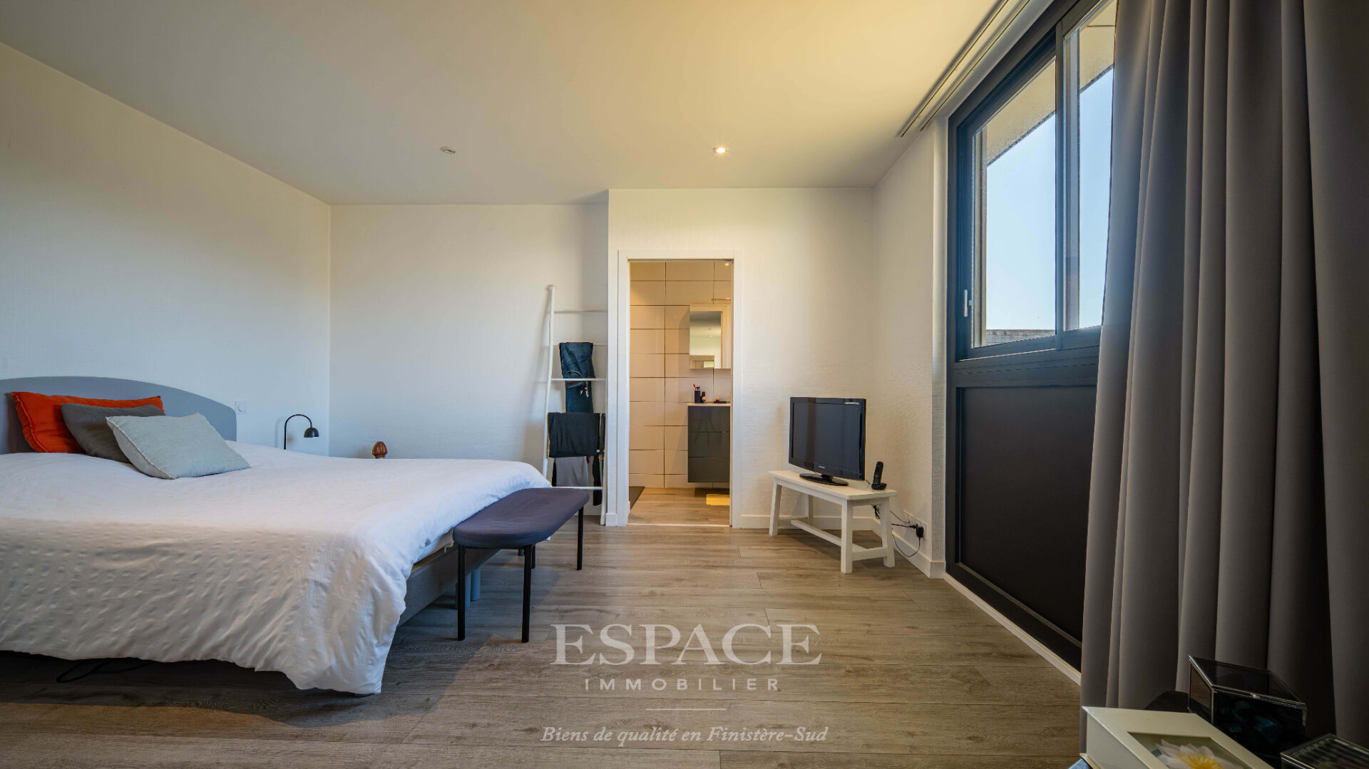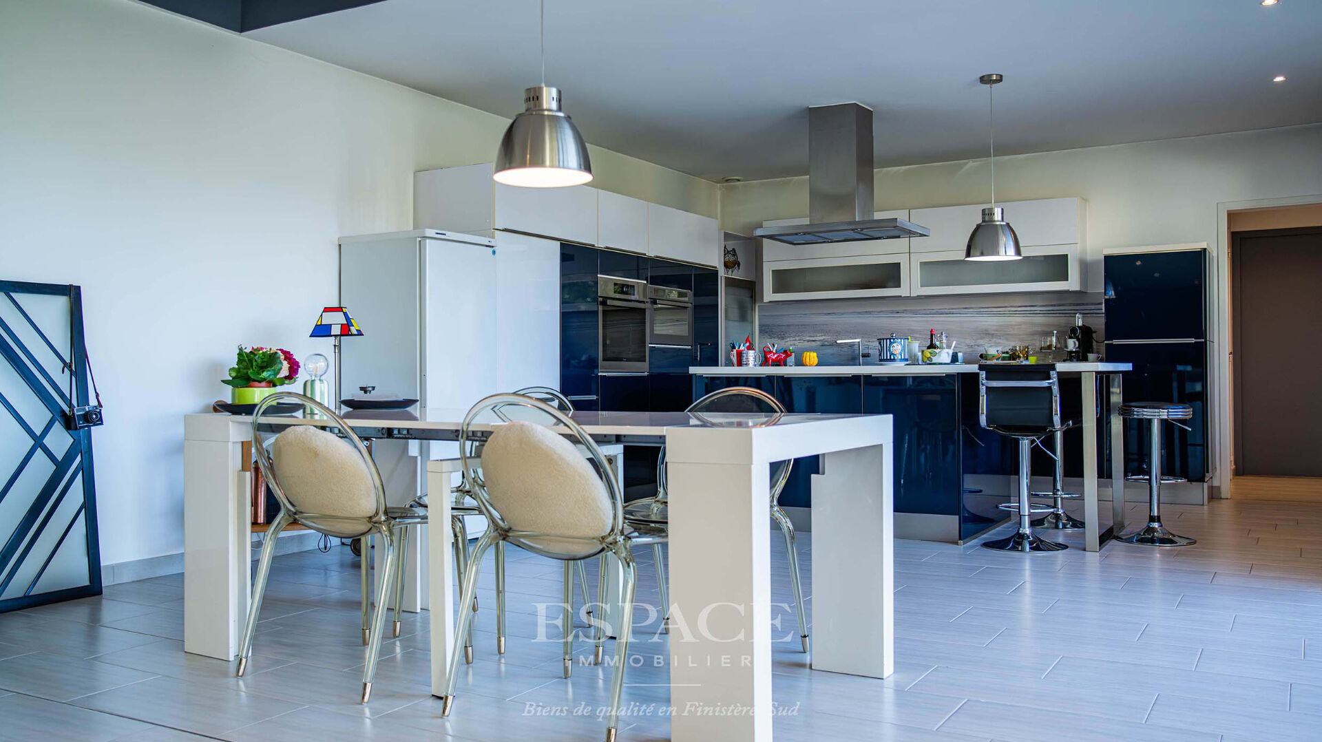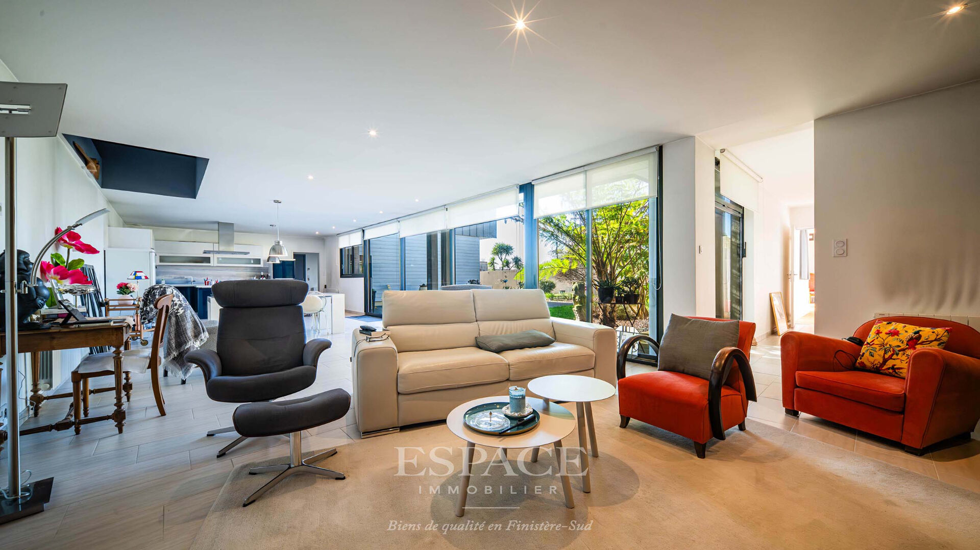 Située à pied du centre-ville de Concarneau et à l'abri des regards, cette maison entièrement de plain-pied développe une surface habitable de 156 m². Elle s'organise autour d'une pièce de vie de 71 m², ouverte sur un jardin ensoleillé et préservé de tout vis-à-vis, grâce à de larges baies vitrées qui prolongent naturellement les espaces de vie vers l'extérieur. La cuisine ouverte et entièrement équipée s'inscrit dans une atmosphère conviviale et contemporaine. La partie nuit se compose de deux chambres confortables, chacune disposant de sa salle de douche privative, garantissant confort et indépendance. Un espace bureau ainsi qu'un cellier viennent compléter l'ensemble. Ce bien se distingue enfin par un garage / atelier exceptionnel de 160 m², bénéficiant d'une belle hauteur sous plafond et offrant un potentiel rare pour une activité artisanale, du stockage, une collection de véhicules ou encore des projets professionnels. Par sa situation recherchée, ses volumes généreux et la singularité de son garage / atelier, ce bien constitue une opportunité rare sur le marché concarnois, à découvrir en exclusivité avec l'agence ESPACE IMMOBILIER, spécialiste des belles maisons et des beaux appartements en Finistère Sud. Les diagnostics immobiliers sont en cours de réalisation. Les informations sur les risques auxquels ce bien est exposé sont disponibles sur le site Géorisques : www.georisques.gouv.fr. (3.87 % honoraires TTC à la charge de l'acquéreur.)