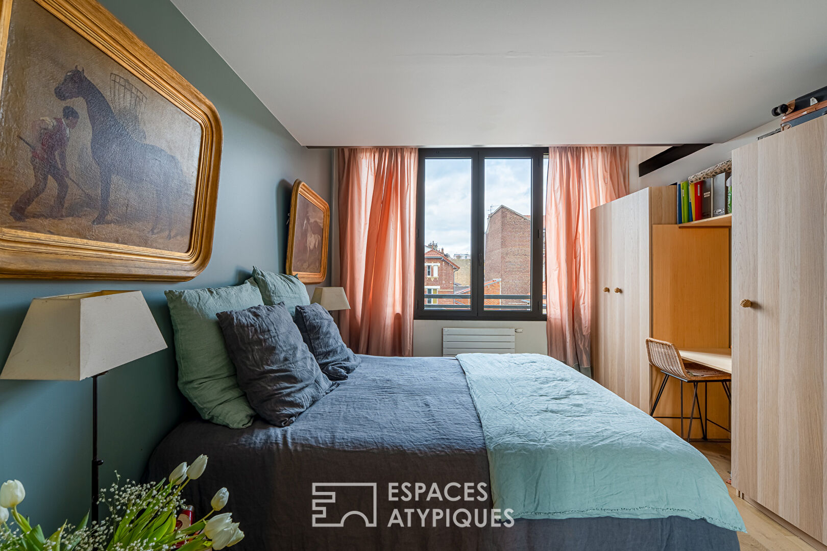 Niché au dernier étage d'une ancienne parfumerie réhabilitée, ce loft d'exception de 105 m² au sol (87,36 m² carrez) conjugue charme industriel et confort contemporain. Situé en plein coeur d'Asnières, dans un quartier calme et recherché, il offre un cadre de vie unique à seulement quelques minutes des commerces, écoles et transports. Dès l'entrée, le regard est immédiatement attiré par la hauteur sous plafond de 5 mètres et la belle luminosité de la pièce de vie. Le séjour, la salle à manger et la cuisine s'harmonisent dans un espace décloisonné de plus de 47m², sublimé par un parquet massif et une baie vitrée qui inonde l'ensemble de lumière naturelle. La cuisine sur mesure, entièrement équipée avec des matériaux et électroménagers haut de gamme, séduit par son élégance et sa fonctionnalité. Une vaste chambre de plus de 13m² avec sa propre salle de bains et des toilettes séparés complètent ce niveau. A l'étage un couloir surplombant la pièce de vie mène à deux chambres mansardées baignées de lumière zénithale grâce à leurs grands velux. Chaque espace a été optimisé grâce à des rangements sur mesure, offrant praticité et esthétisme. Une salle de bains avec toilettes vient parfaire cet étage intimiste, propice à la sérénité. L'immeuble de caractère, témoin du passé industriel du quartier, s'intègre parfaitement dans son environnement urbain. A proximité immédiate, les commerces de centre-ville, le marché, les restaurants et les établissements scolaires (sectorisation RPC Gilbert puis Michelet) assurent un quotidien agréable et dynamique. La gare de Bois-Colombes (ligne J) et le métro Gabriel Péri (ligne 13) permettent de rejoindre Paris en quelques minutes. Possibilité d'acquérir une place de stationnement en sus. Ce loft atypique séduira les amateurs de volumes, de lumière et de prestations de qualité, offrant un cadre de vie unique entre esprit industriel et modernité. Bien soumis au régime de la copropriété, 37 lots dont 18 lots d'habitation, procédure en cours. CLASSE ENERGIE : D / CLASSE CLIMAT :D. Montant moyen estimé des dépenses annuelles d'énergie pour un usage standard, établi à partir des prix de l'énergie de l'année 2021 : entre 900 euros et 1 260 euros. Les informations sur les risques auxquels ce bien est exposé sont disponibles sur le site Géorisques : https://www.georisques.gouv.fr Contact : Sophie YON- 06 18 36 65 84 - EI - Agent Commercial - RSAC : 837 580 166 Nanterre. Copropriété de 37 lots - dont 18 lots habitation. (Procédure en cours). Charges annuelles : 5704 euros. Sophie YON (EI) Agent Commercial - Numéro RSAC : 837 580 166 - Nanterre.