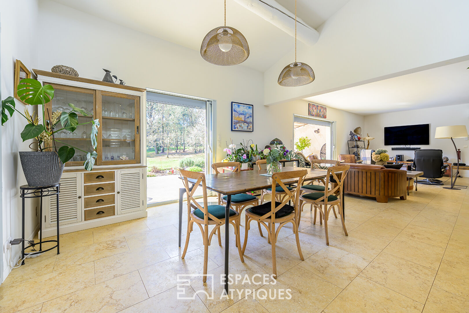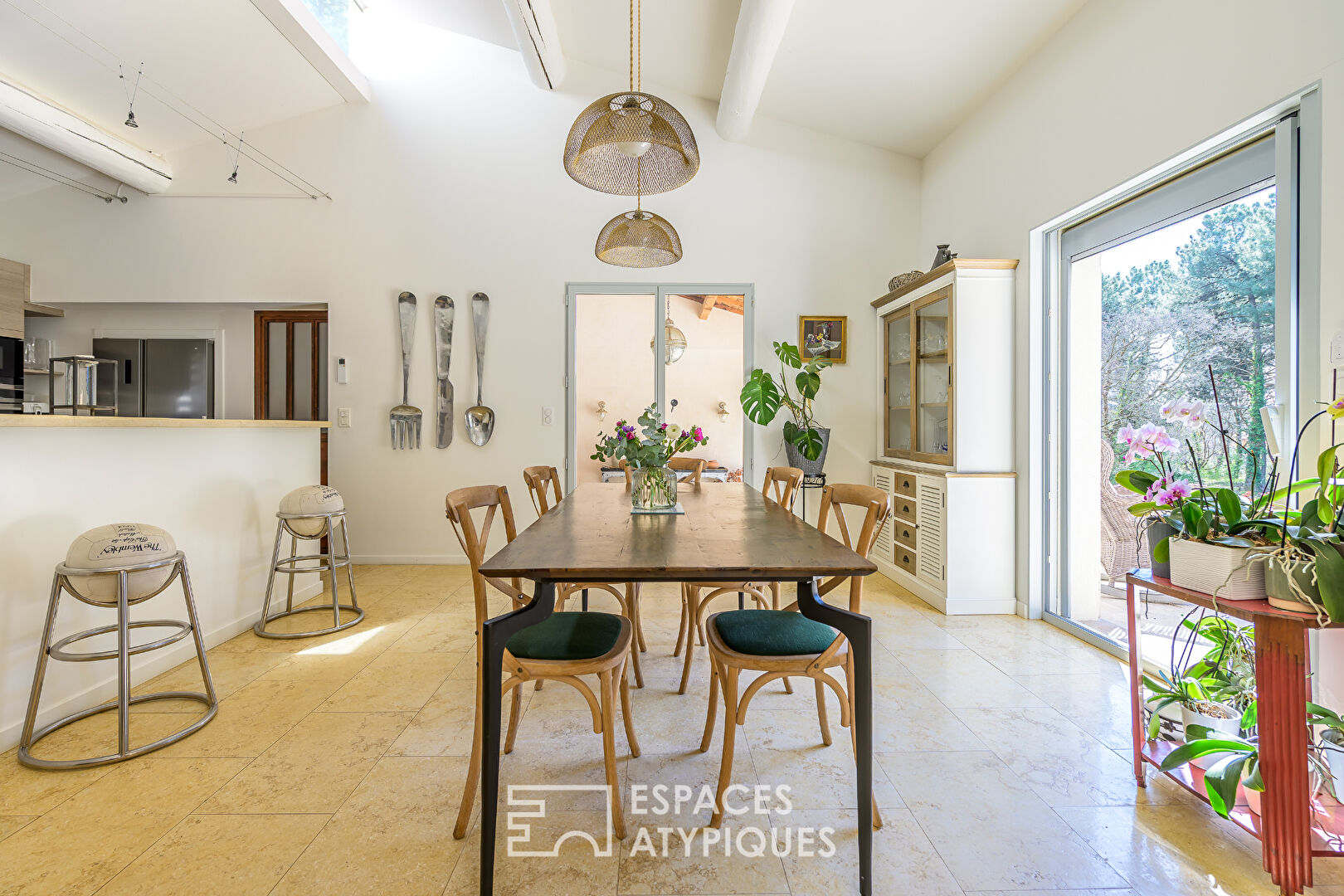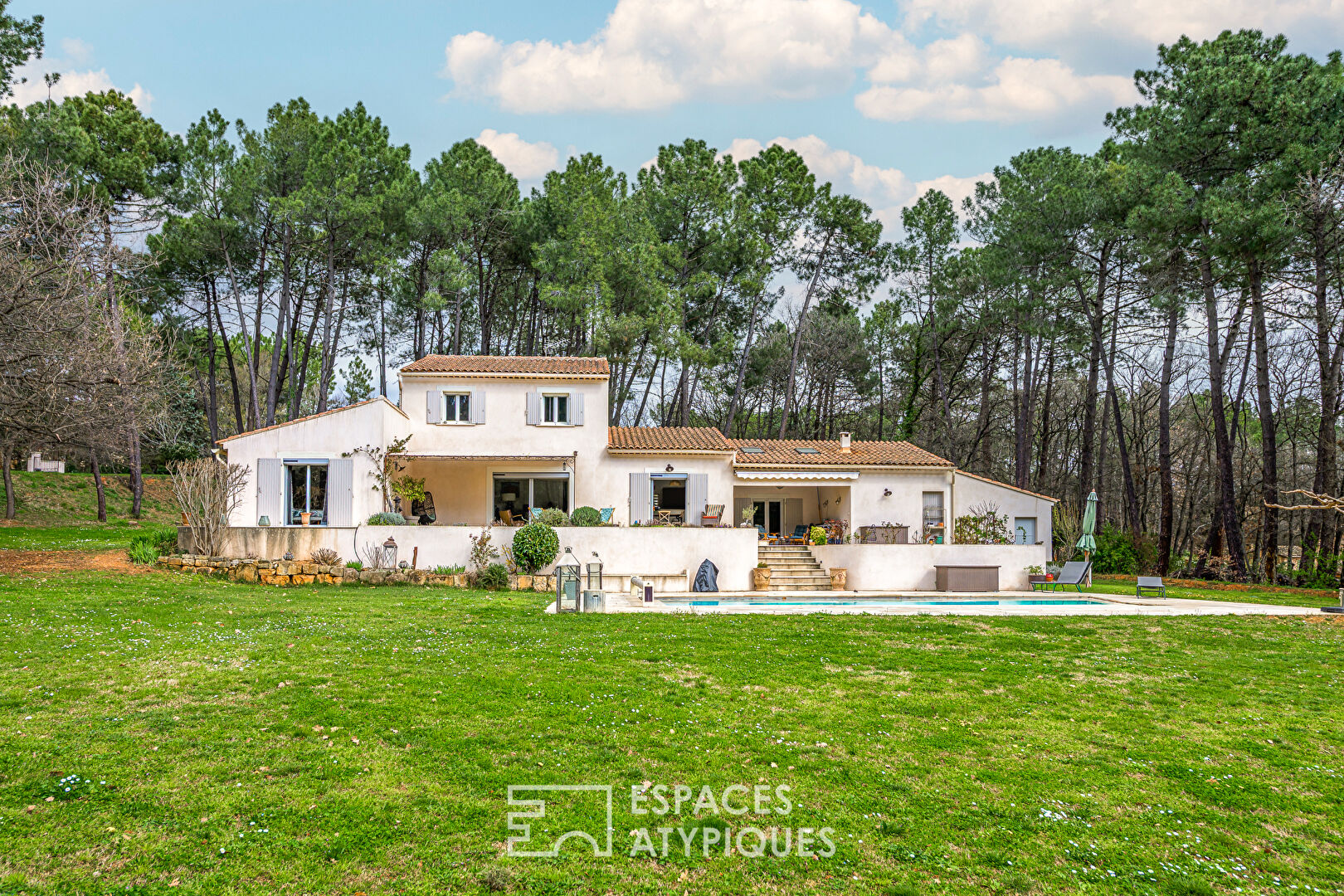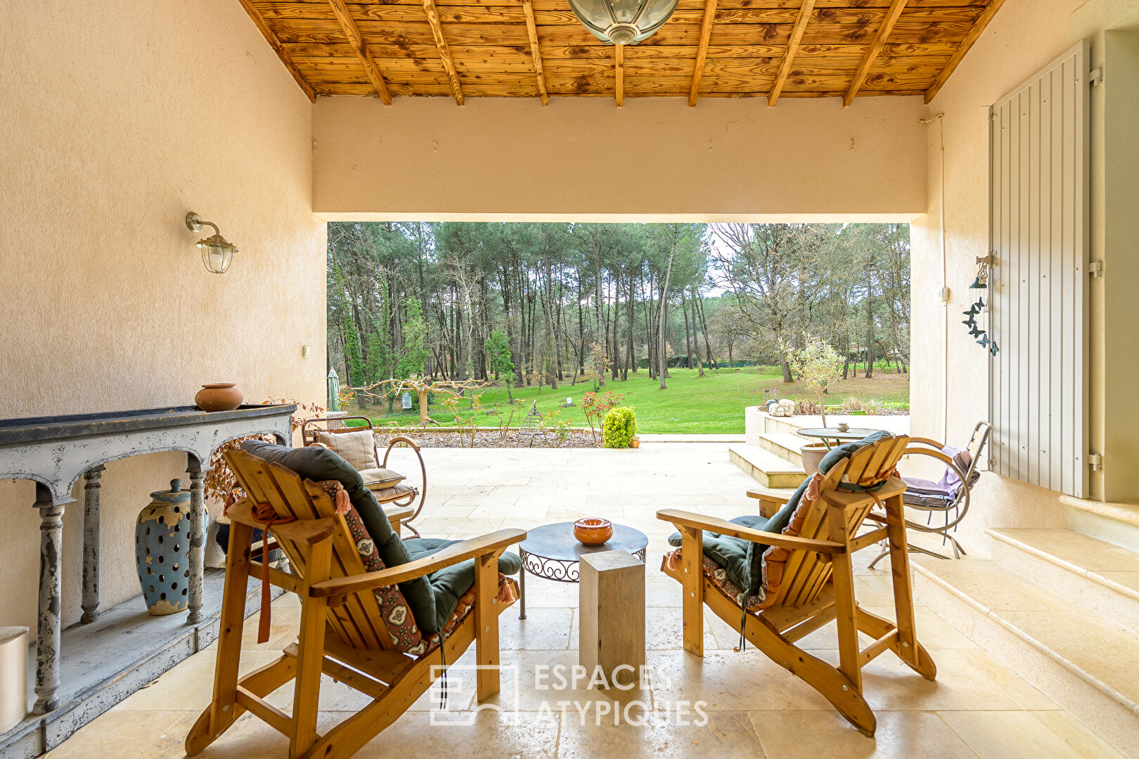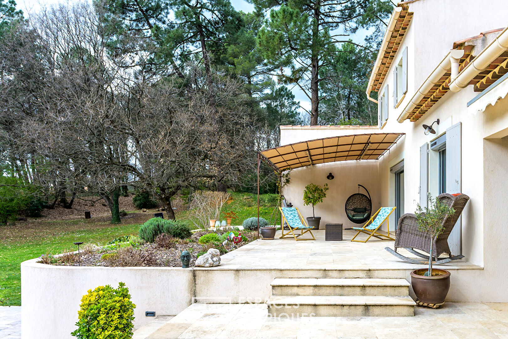 Située à Roussillon, dans le cadre privilégié d'une zone naturelle protégée, cette propriété de 222m² s'érige sur un terrain arboré de près de 7 500 m². Alliant confort moderne et environnement naturel préservé, ce bien dispose d'une piscine généreuse de 11x5 m et d'une vue dégagée sur un bois invitant à la détente. Passé l'entrée, le volume du séjour de 50 m² impressionne par sa luminosité. Ce coeur de vie, doté d'une cheminée et d'un chauffage au sol, communique avec une cuisine ouverte. Le rez-de-chaussée propose une organisation fluide : une vaste suite parentale avec dressing fermé et salle d'eau, une seconde chambre avec accès direct à l'extérieur ainsi qu'une salle d'eau. L'étage complète l'espace nuit avec trois chambres confortables, une salle de bain et un toilette indépendant. La transition intérieur-extérieur est assurée par une terrasse de 45 m², prolongée par un auvent permettant de profiter du jardin en toute saison. Côté technique, la villa affiche un excellent DPE grâce à une pompe à chaleur et une climatisation réversible. Un garage, un atelier, un carport et une buanderie viennent parfaire les prestations. Entre les sentiers des Ocres et le calme absolu de la pinède, ce lieu de vie offre une expérience résidentielle singulière au sein du Luberon. CLASSE ÉNERGIE : B / CLASSE CLIMAT : A Prix moyens des énergies indexés sur les années 2021, 2022, 2023 (abonnements compris) : entre 1670 euros et 2260 euros. Les informations sur les risques auxquels ce bien est exposé sont disponibles sur le site Géorisques : www.georisques.gouv.fr Laëtitia VALERO (EI) Agent Commercial - Numéro RSAC : 994 627 941 - AVIGNON.