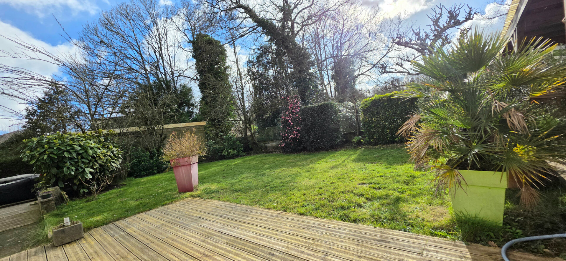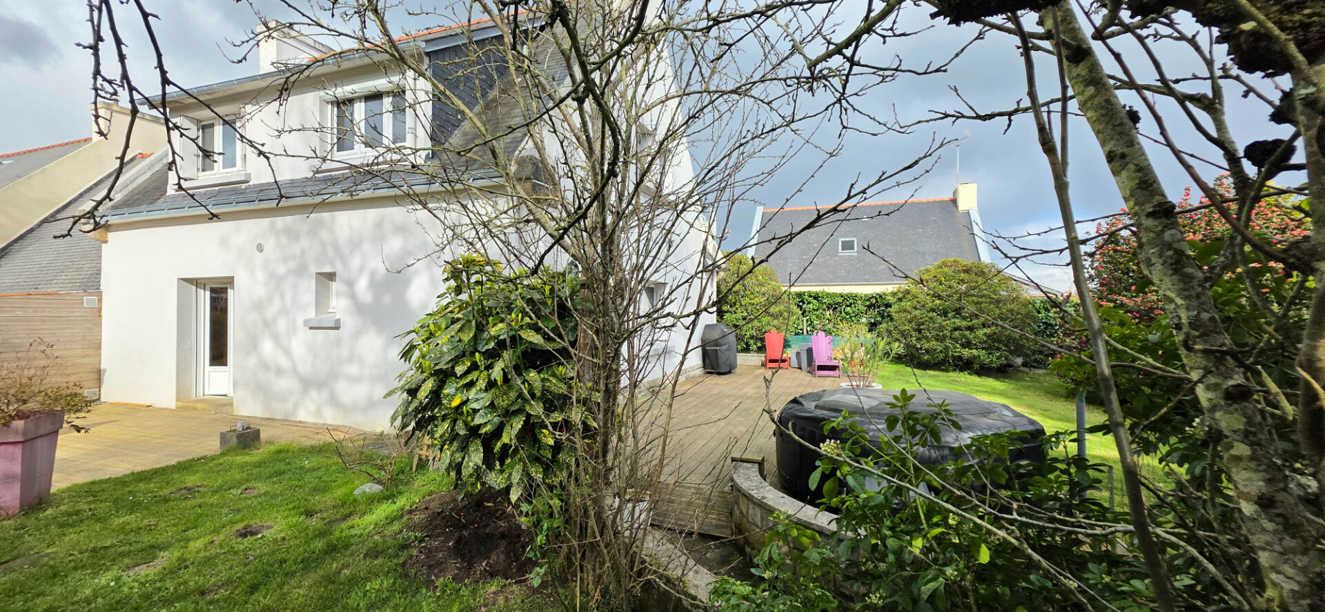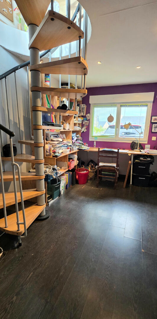 Pluguffan à proximité de Quimper. Lumineuse , au calme sans vis à vis sont les caractéristiques de cette maison des années 1970 . Elle dispose d'une entrée, vaste salon séjour (avec poêle à bois ) donnant accès directement sur la jardin , cuisine aménagée équipée ouverte, un bureau, wc. A l'étage , 3 chambres, salle de de bain et un second bureau avec un accès indépendant . le tout sur un terrain de 600 m 2 ,clos et arboré, avec un appentis et une pergola (6.00 % honoraires TTC à la charge de l'acquéreur.)