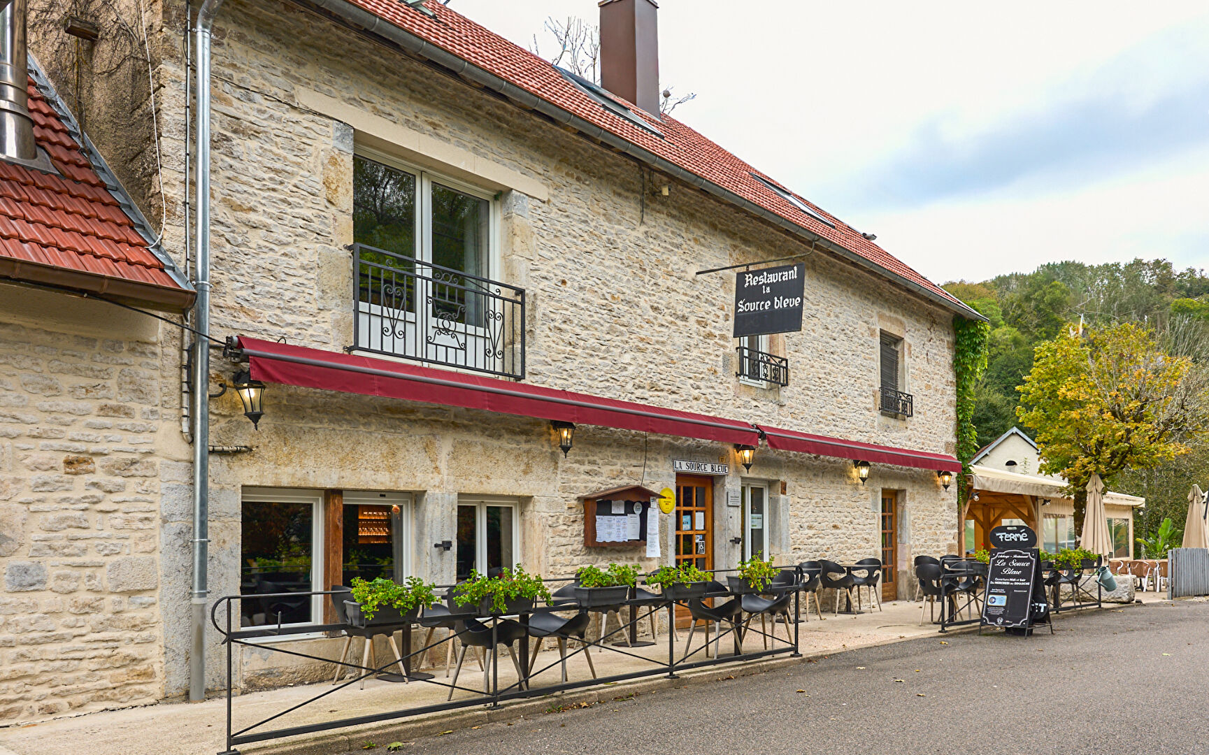 L'AUBERGE de la SOURCE BLEUE Ancien Relais de diligences datant de 1826, superbement restauré en 2019, en bord direct de CUSANCIN, (rivière à truites première catégorie), l'Auberge-Restaurant de la Source Bleue vous attend. A usage actuel de chambres d'hôtes-restaurant gastronomique, cette solide ferme en pierres du pays conviendrait également à une vaste maison familiale. A 11km de BAUMES-LES-DAMES et moins d'1/2h de VALDAHON. INTERIEURS CHALEUREUX ET EXTERIEURS D'EXCEPTION La porte de cette belle bâtisse en pierres franchie, l'ambiance chaleureuse des lieux vous gagne... et le superbe bar en place vous accueille d'emblée avec une bière spéciale maison. Et la cave à vins n'est pas loin ! Entre bar et salle de restauration, un insert réchauffe encore l'ambiance, dès l'automne. Cette salle de restaurant accueille jusqu'à 56 couverts actuellement. Une impressionnante terrasse couverte, construite en 2019 en prolongement de cette salle, permet en saison de monter jusqu'à 150 couverts supplémentaires. Une cuisine professionnelle (piano LOTUS et four RATIONAL) avec sa plonge séparée concocte actuellement de la fine cuisine locale 5 jours sur 7. Elle vous est proposée, tout comme la Licence IV en place, dans la valeur du Fonds, en OPTION. Dépendances et garage complètent ce niveau. Aux étages: cinq superbes suites se louent à un très bon taux d'occupation annuel, un bureau, une buanderie. Une de ces suites pouvant bien entendu passer en appartement privé. Plus de 400m² au total, sur ces trois niveaux. Du côté des extérieurs, c'est le cadre enchanteur du Val de CUSANCE qui s'offre à vous, entre rivière et falaise voisine. Les espaces verts qui bordent le Cusançin, (rivière à truites bien connue !) sont ici tous en pleine propriété, comme le droit d'eau fondé en titre, avec le canal d'amenée qui vous permettrait d'y faire un bassin à truites ou même une carpière. Plus de 80 ares au total, entre la bâtisse, les dépendances, et les berges de Cusançin. Un vrai paradis, pour le plaisir des yeux, et des papilles ! Parking 30 véhicules en prolongement de la terrasse du restaurant. Et jacuzzi qui surplombe l'ensemble, vue sur la falaise voisine. Licence IV et matériel professionnel (pour valeur de 58.000 euros) compris dans la valeur du Fonds de 168.000 euros, avec possibilité de reprendre le prêt en cours. Très bon Chiffre. Bilans à disposition. Vente cause maladie. Idéal, juste pour les vacances en famille, ou reprise de l'activité existante de chambres/tables d'hôtes, ou de restauration. Alors à bientôt, en bord de CUSANCIN, pour les beaux jours ? Sylvie du WELZ (EI) Agent Commercial - Numéro RSAC : 493 231 039 - BESANCON.