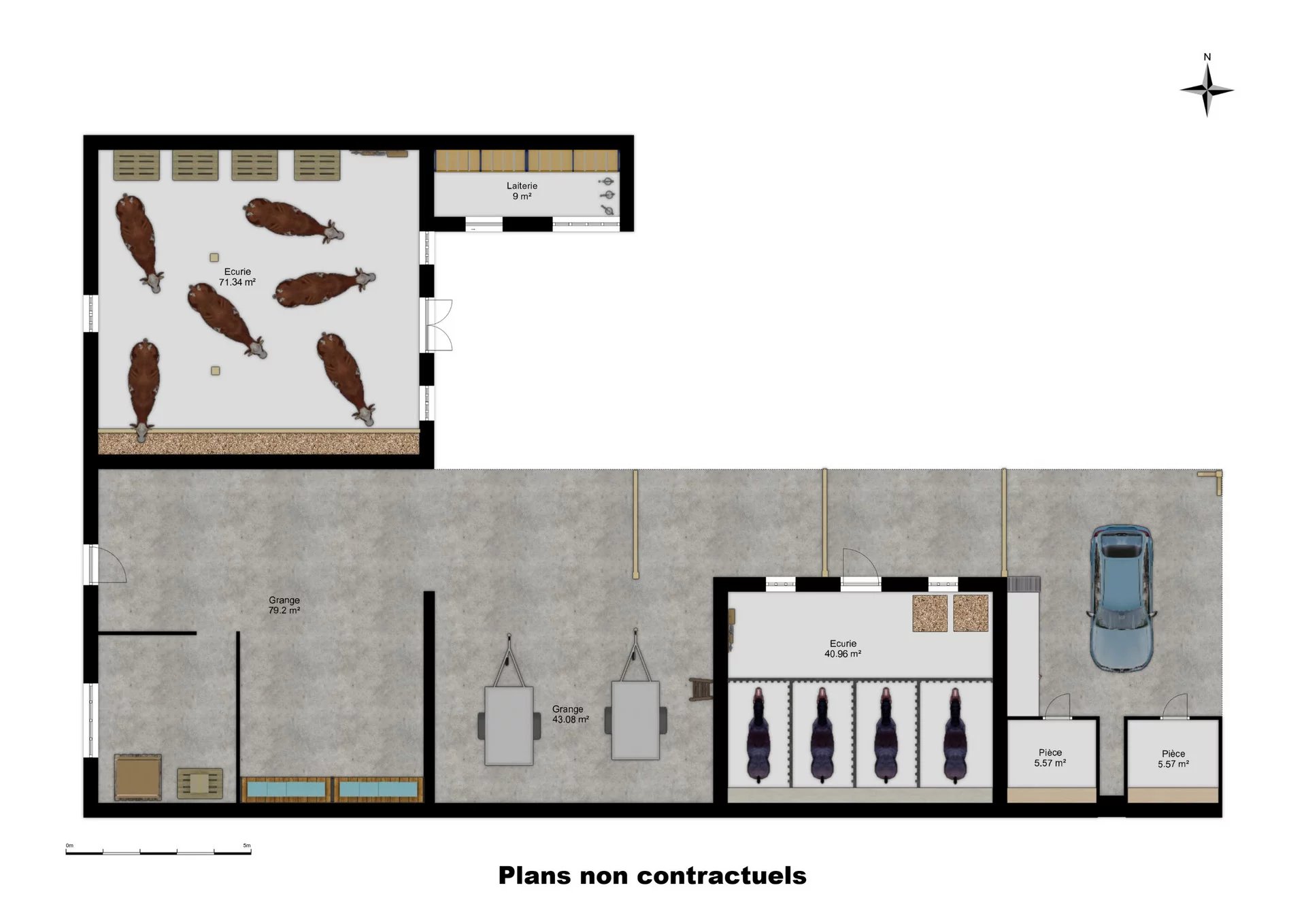 Nombreuses dépendances ( laiterie , 2 écurie , 2 grange , 1 hangar ) pour une superficie de 290 m² , grande cour intérieure de 640 m² et jardin de 275 m² .