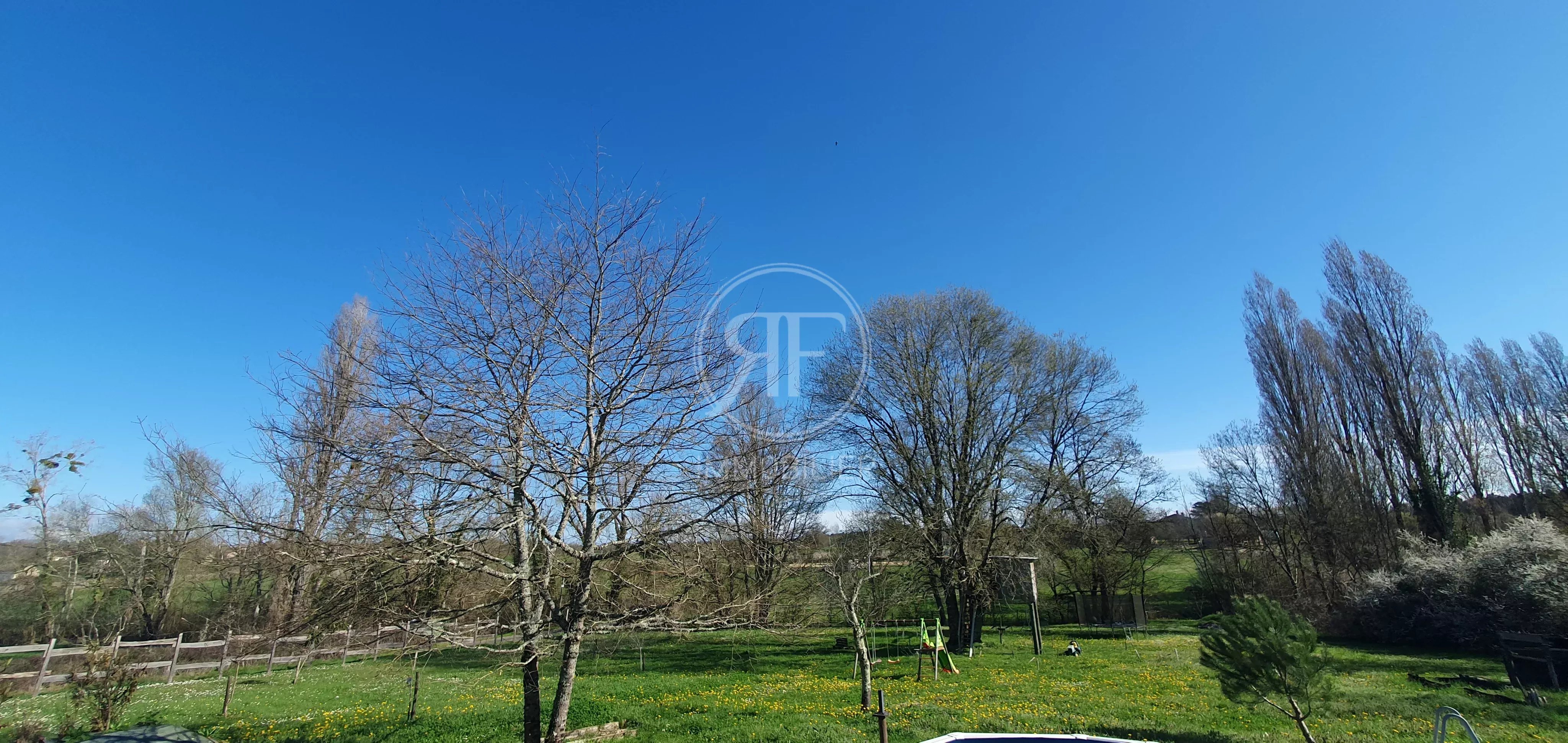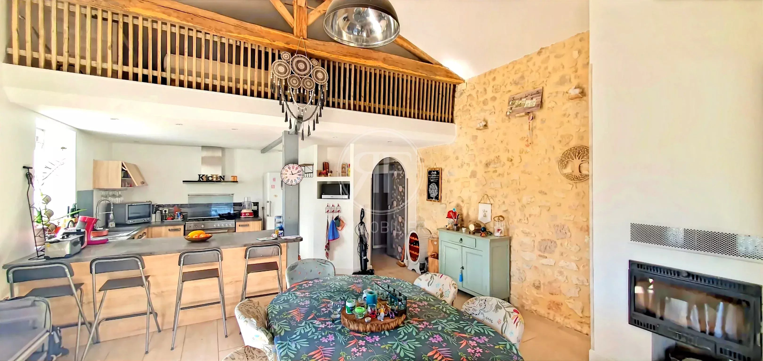 Elle se compose d'une belle pièce de vie cuisine/salle à manger de 35m² avec insert à bois, d'une mezzanine donnant sur cet espace, d'un salon lumineux de 20m² ouvrant sur une grande terrasse couverte dominant le jardin.