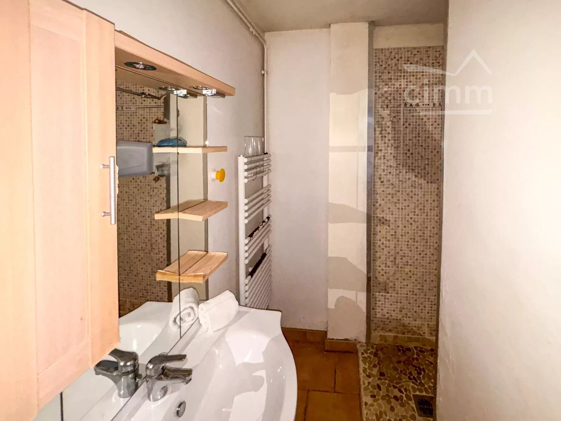 🔹 Une salle d'eau avec douche avec receveur plat et meuble simple vasque