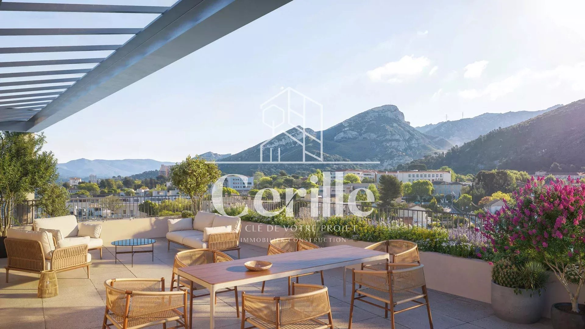 Cet espace de réception unique s'ouvre de plain-pied sur une première Terrasse de 32 m², pour des apéritifs sous le ciel marseillais.