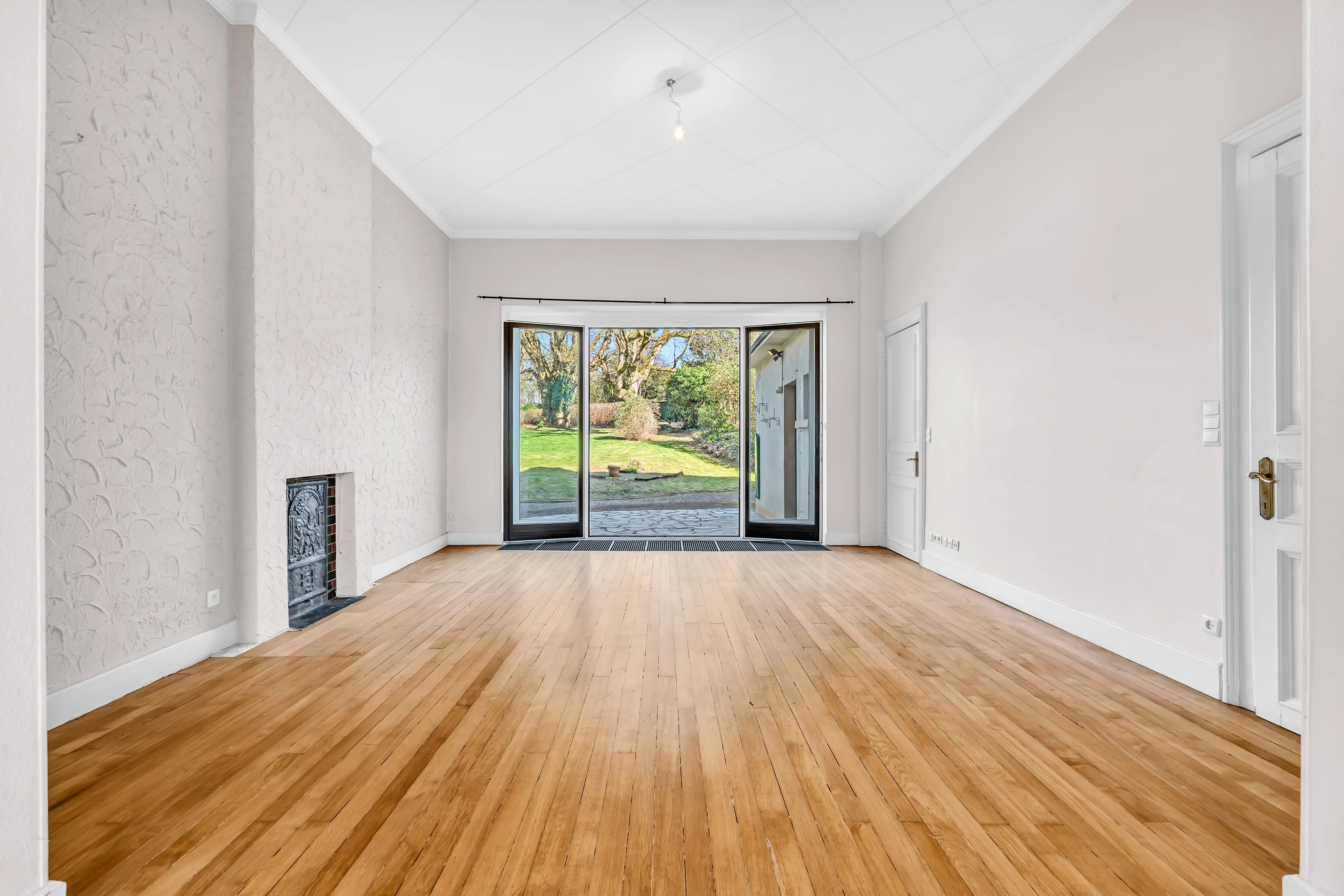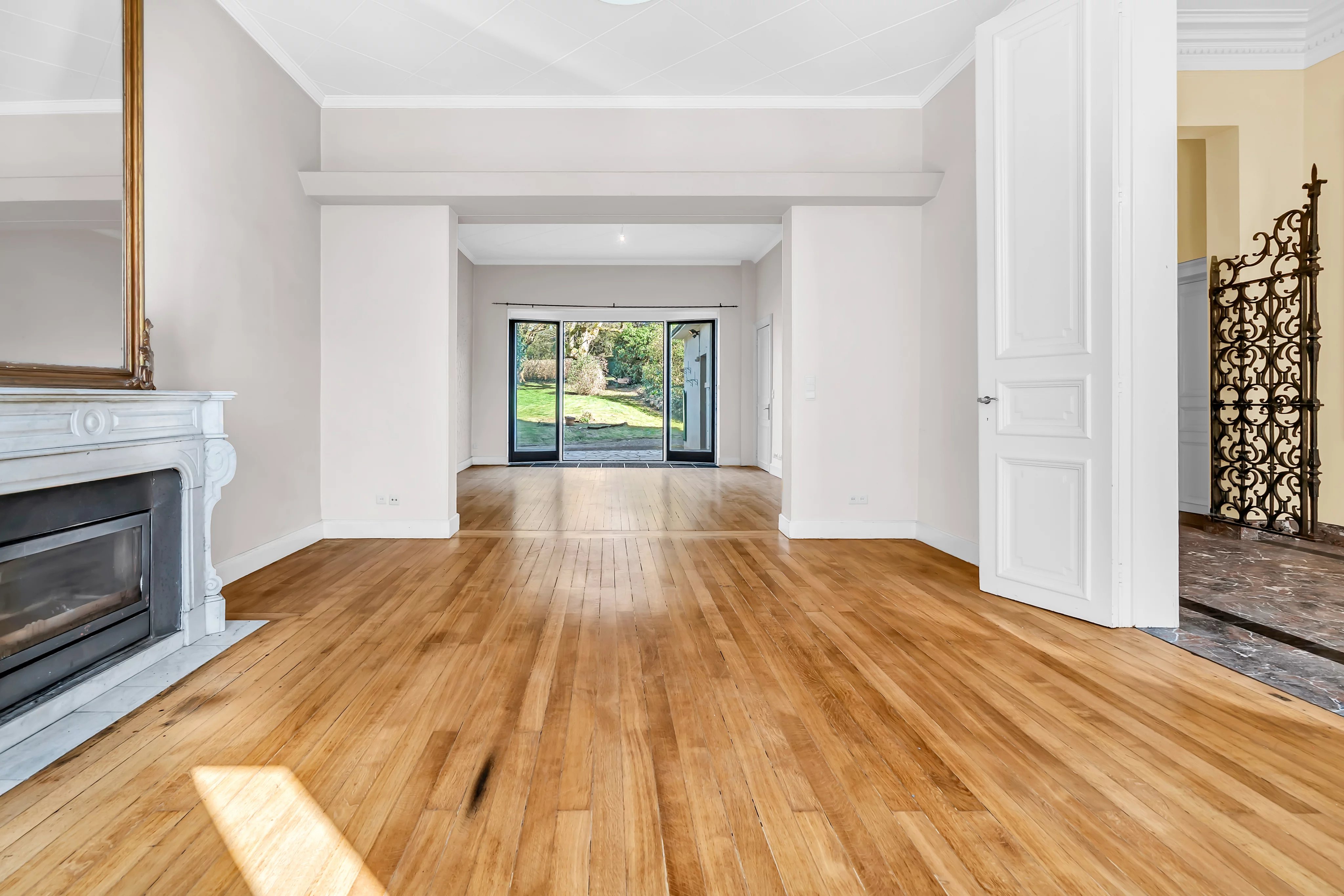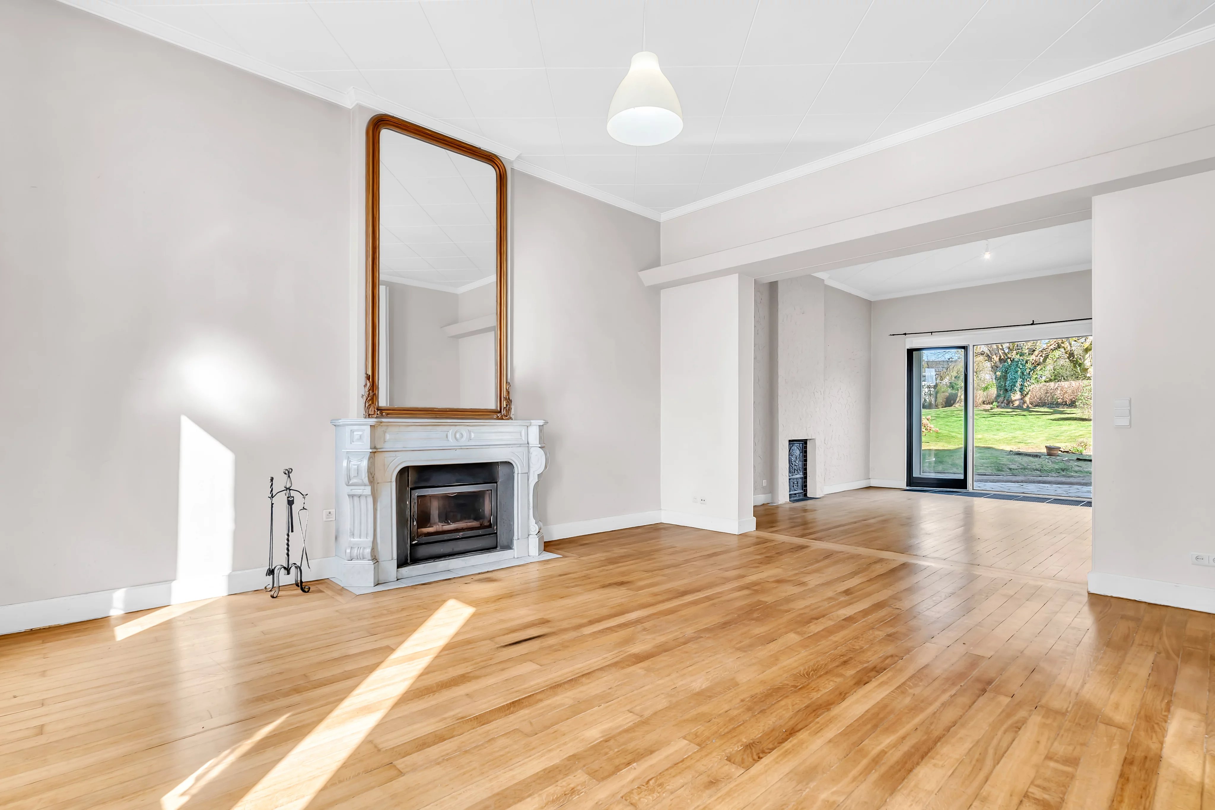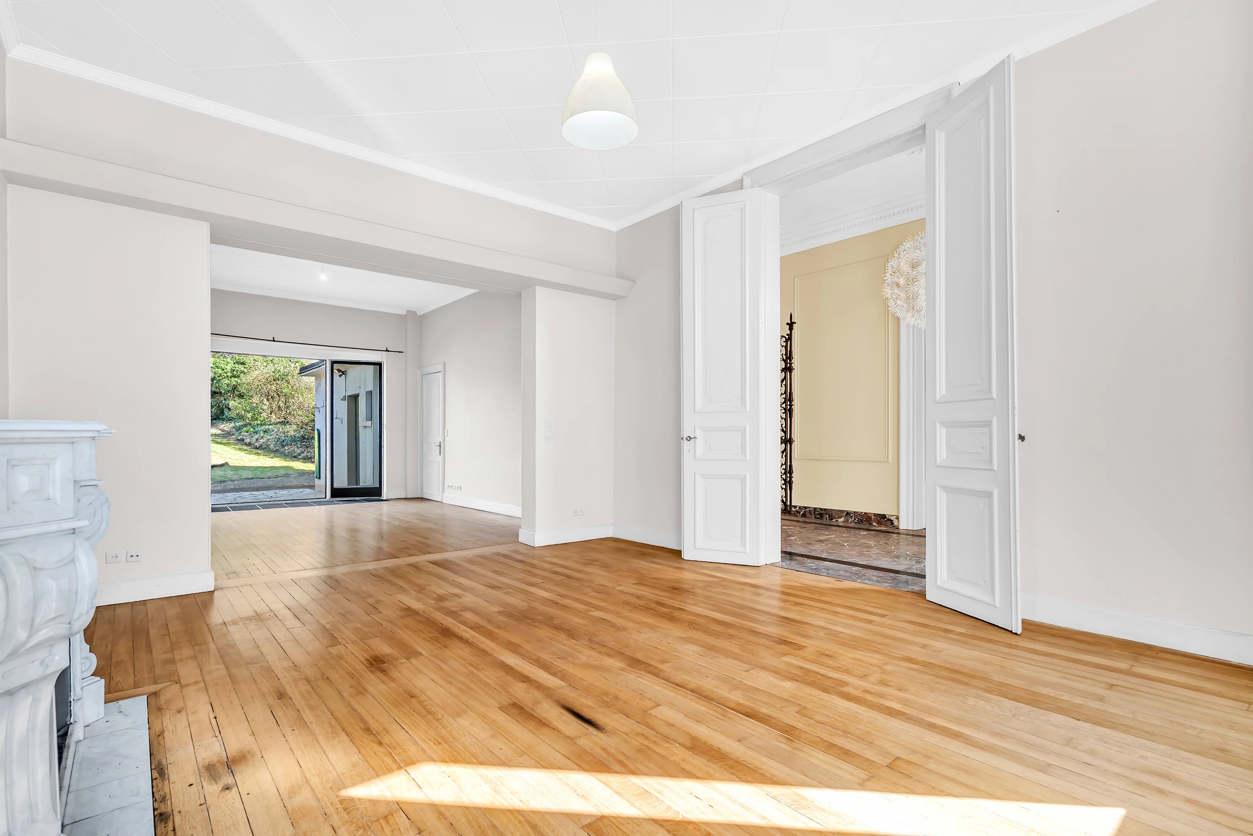 Dès l’entrée, vous serez accueilli par un hall majestueux avec une hauteur sous plafond de 4 mètres, mettant en valeur le caractère et les volumes généreux de la maison. Le rez-de-chaussée se compose d’un double séjour lumineux avec parquet et cheminées en marbre, offrant un accès direct à une terrasse avec vue dégagée sur le jardin arboré. Une cuisine séparée entièrement équipée complète cet espace.