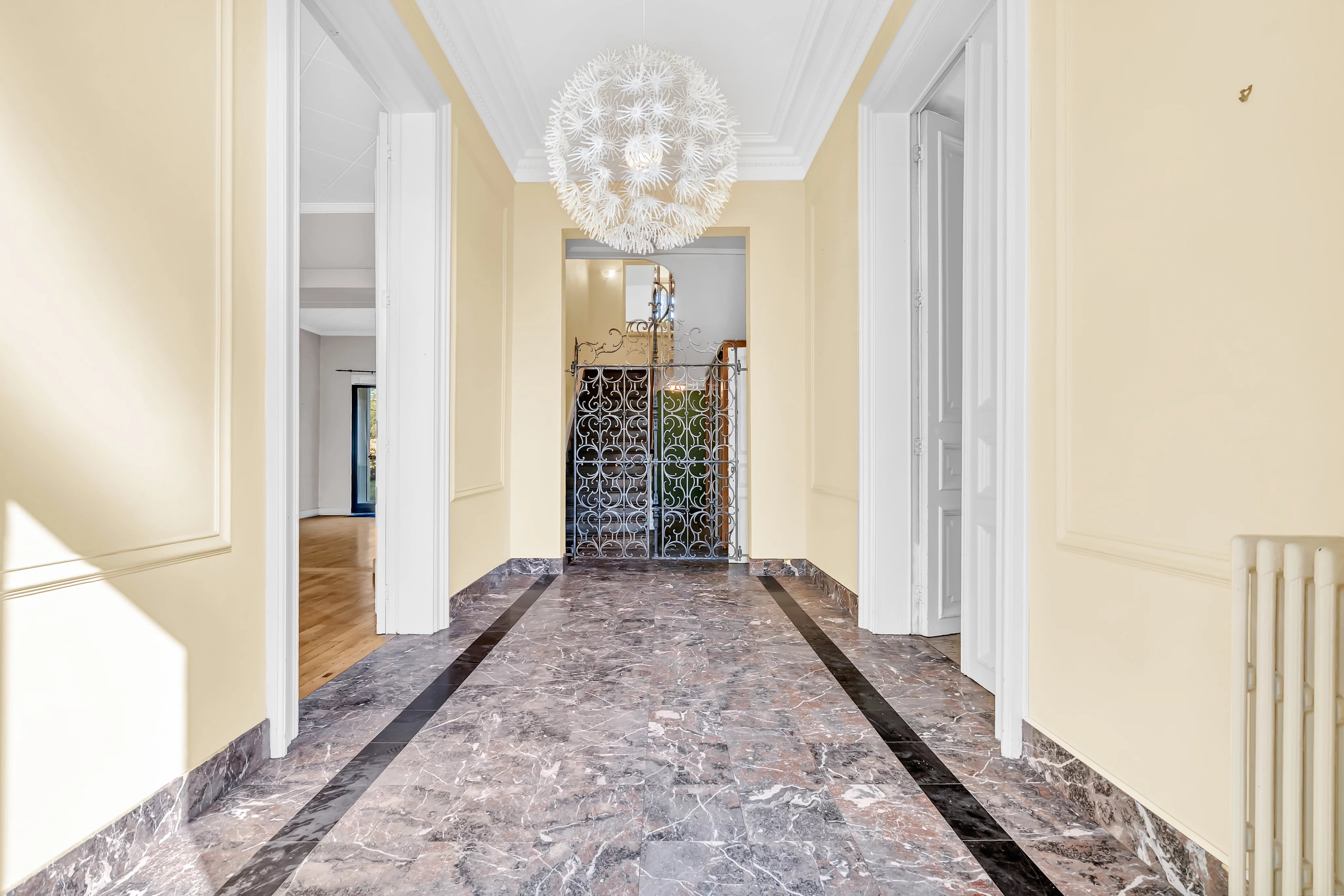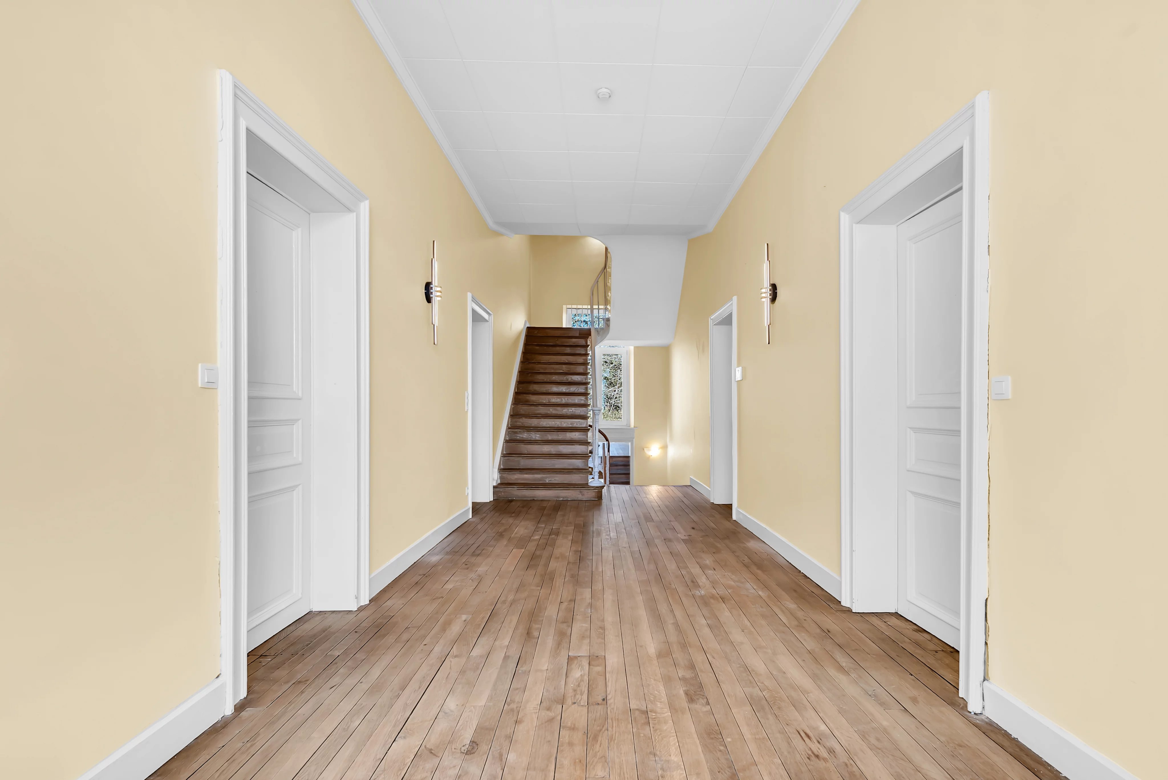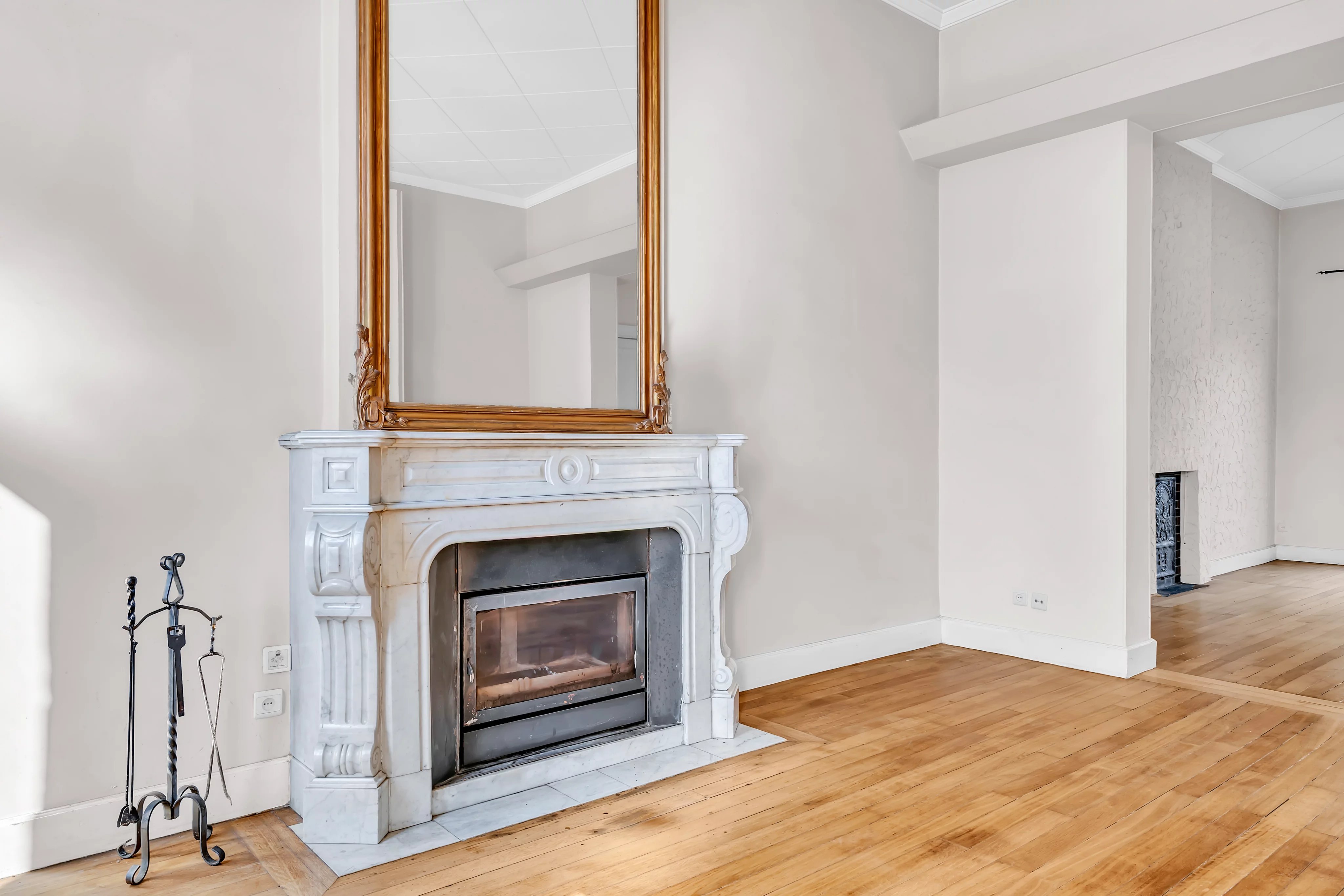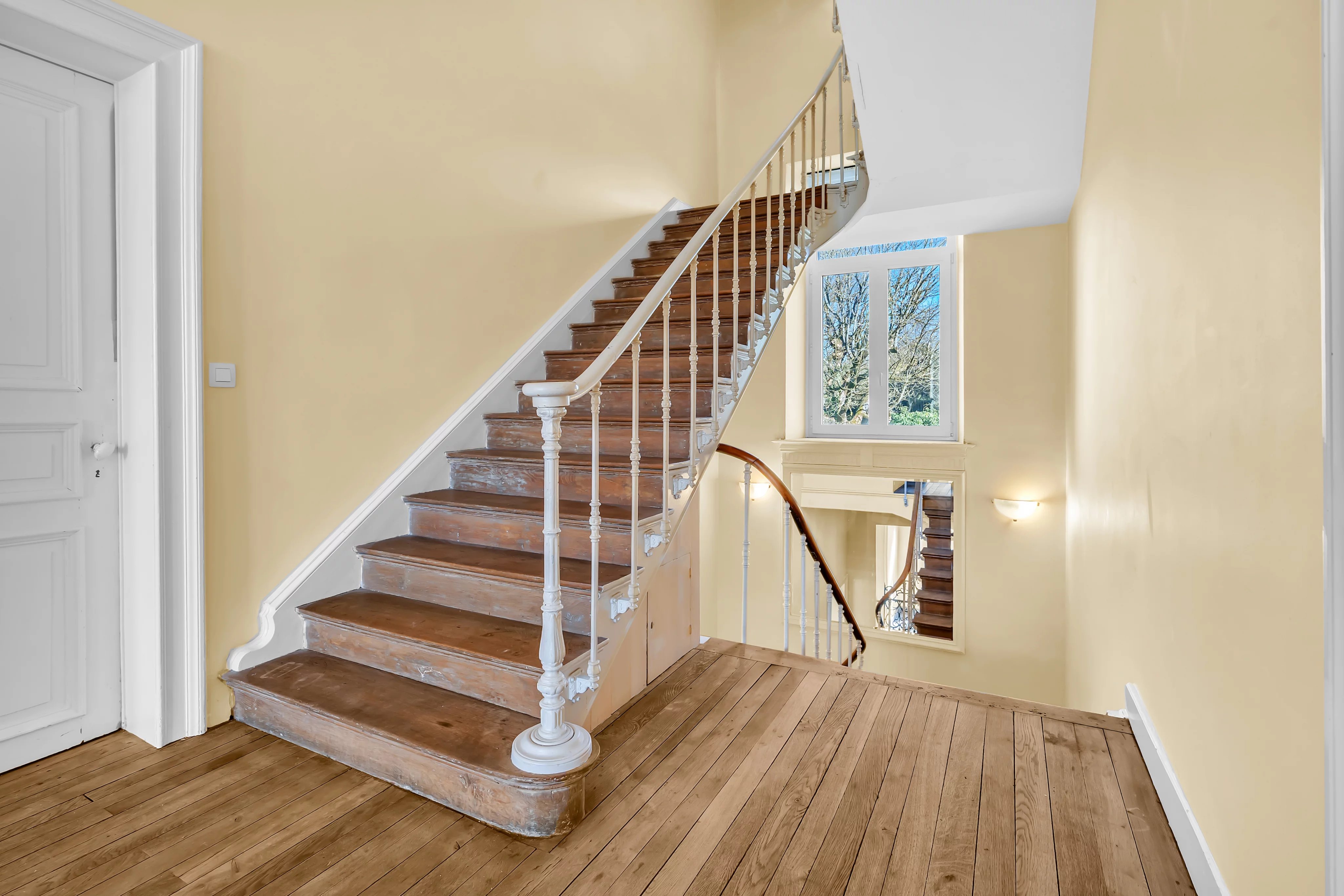 Dès l’entrée, vous serez accueilli par un hall majestueux avec une hauteur sous plafond de 4 mètres, mettant en valeur le caractère et les volumes généreux de la maison. Le rez-de-chaussée se compose d’un double séjour lumineux avec parquet et cheminées en marbre, offrant un accès direct à une terrasse avec vue dégagée sur le jardin arboré. Une cuisine séparée entièrement équipée complète cet espace.