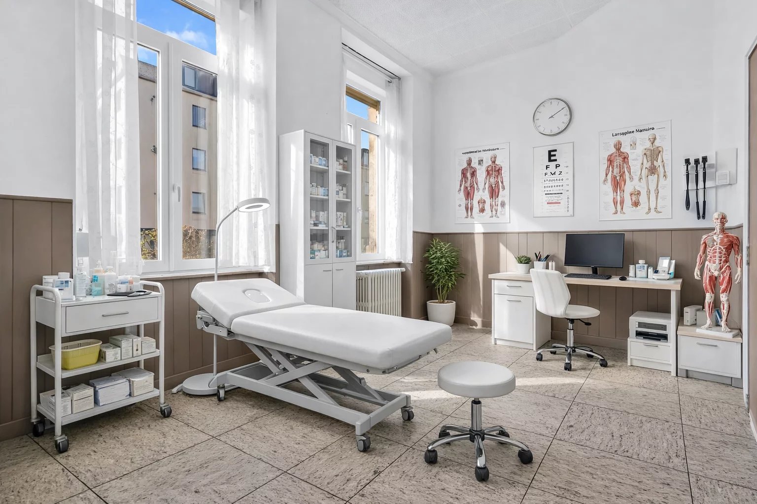 Un espace professionnel indépendant comprend un bureau de consultation, une salle d’attente, une seconde cuisine ainsi qu’un WC.