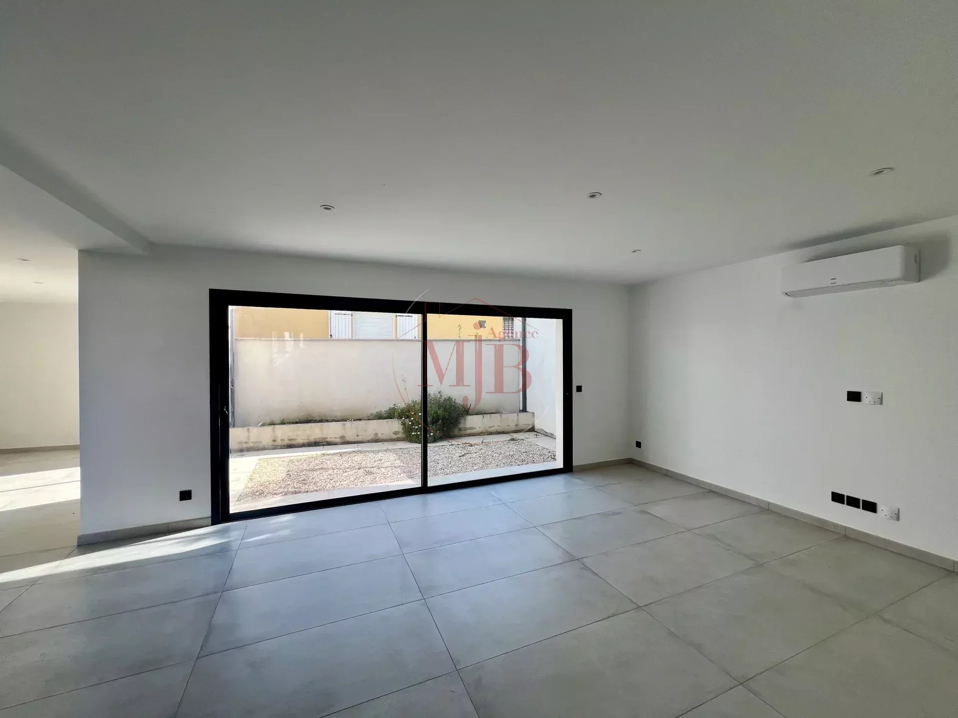 Une belle pièce de vie lumineuse avec salon, séjour et cuisine ouverte, donnant sur un patio extérieur privatif, une arrière-cuisine ainsi qu’un WC indépendant.