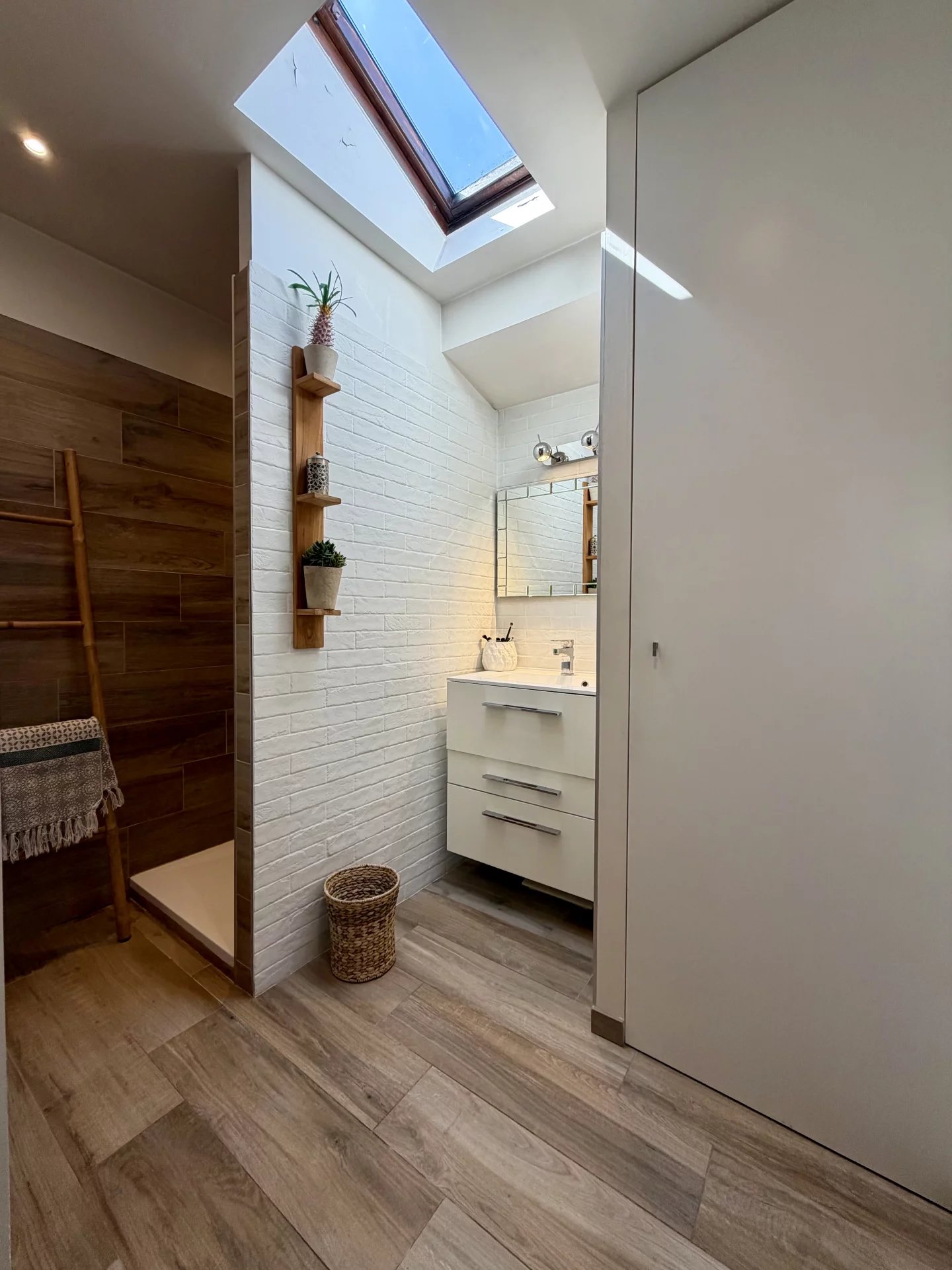 A l'étage, vous trouverez 2 chambres avec de nombreux rangements ainsi qu'une salle d'eau et un wc indépendant.