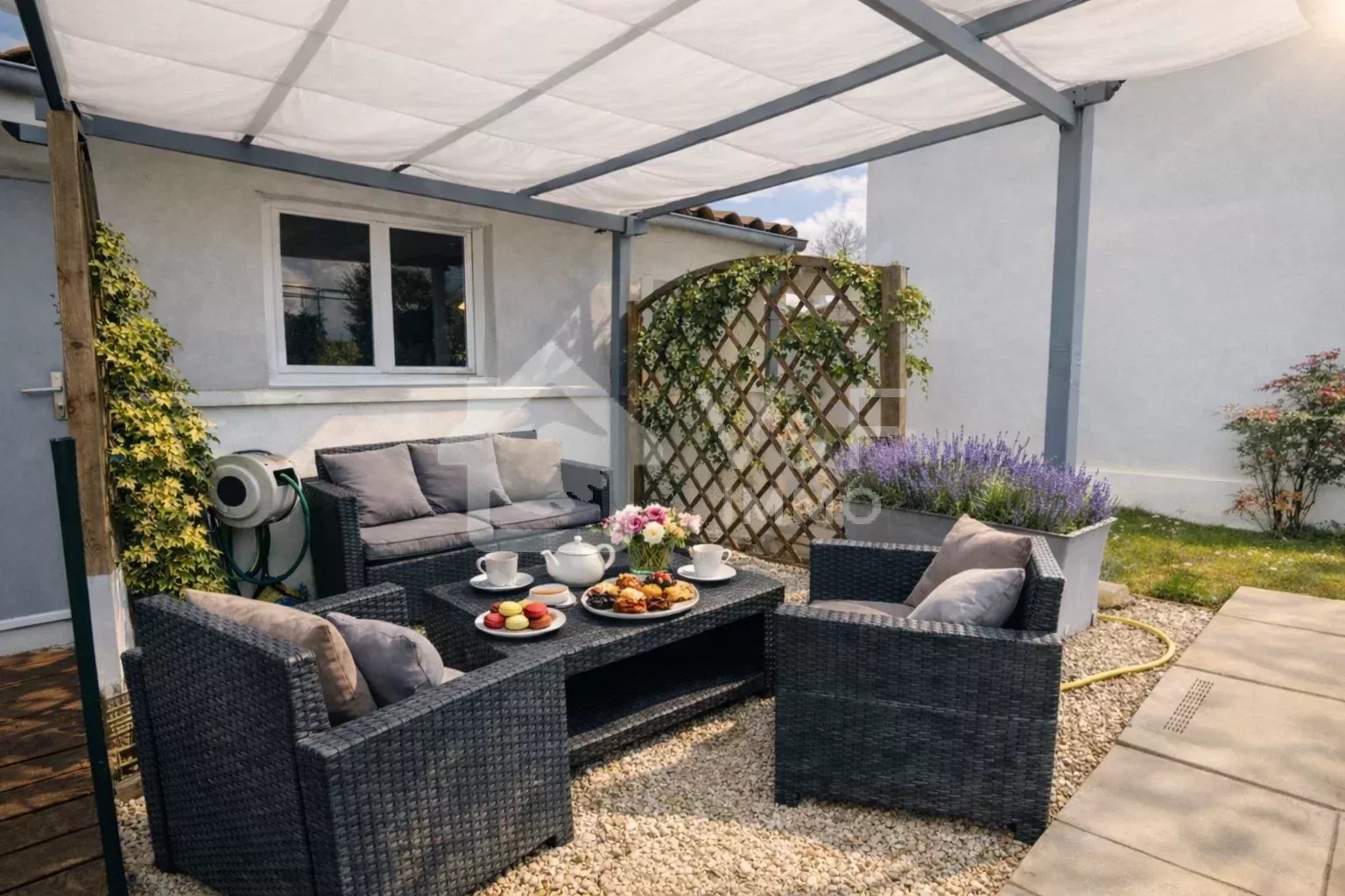 Je vous invite à venir vous prélasser sur la magnifique terrasse de 19m² ombragée par une tonnelle en bois réalisée par un artisan local puis à plonger dans la très belle piscine chauffée et profiter des belles pièces à vivre du rdc et de l'étage.