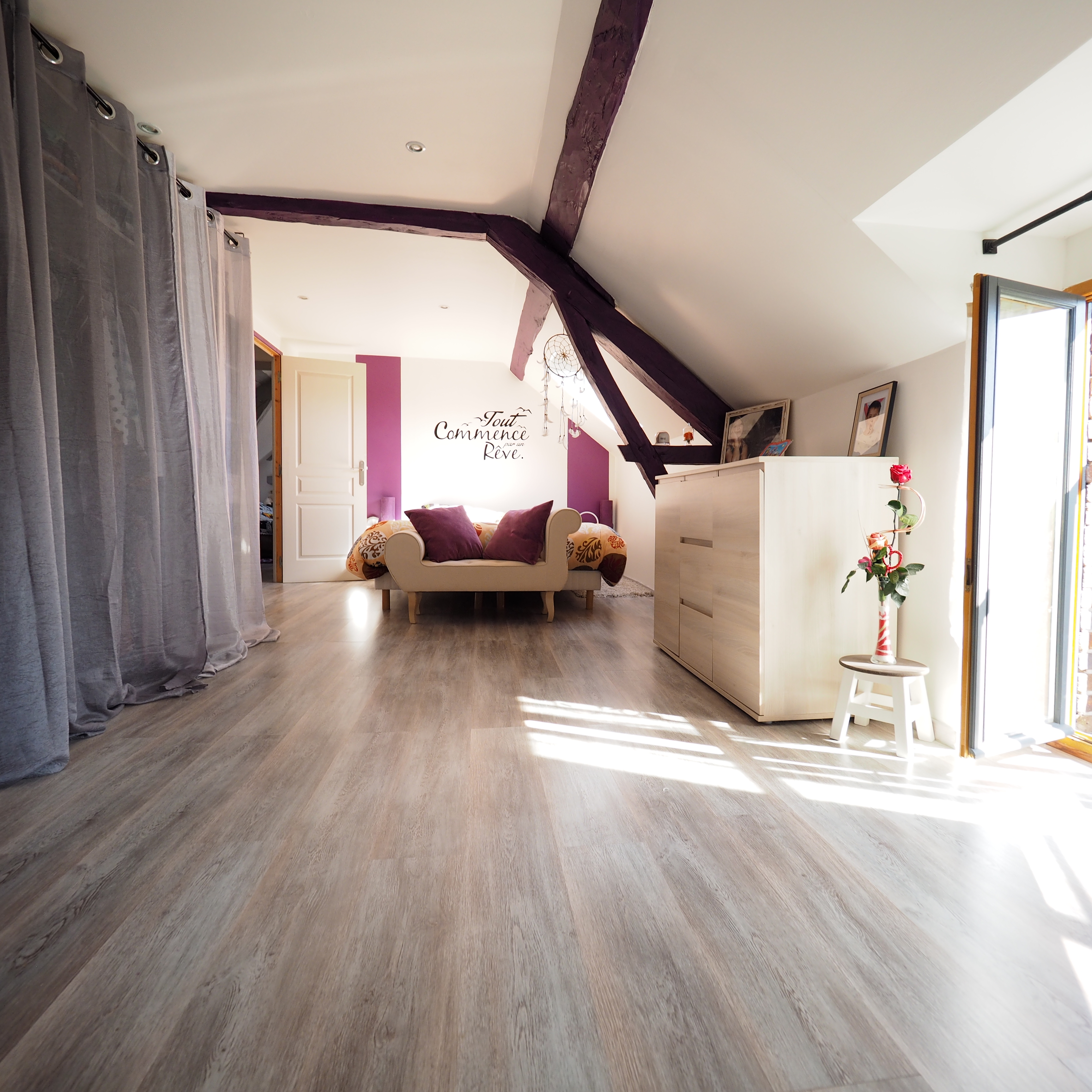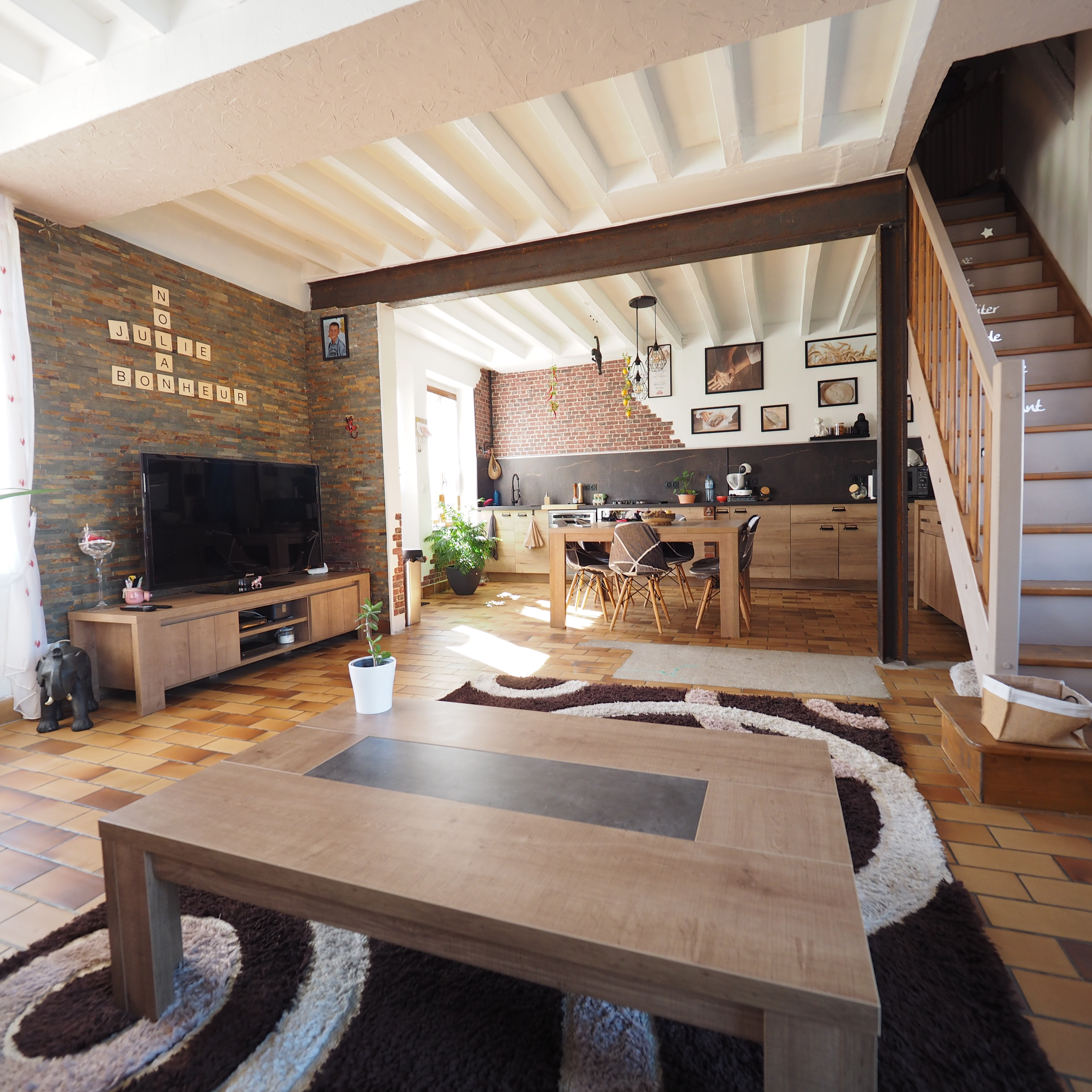 Un séjour lumineux avec cuisine ouverte et poutres apparentes