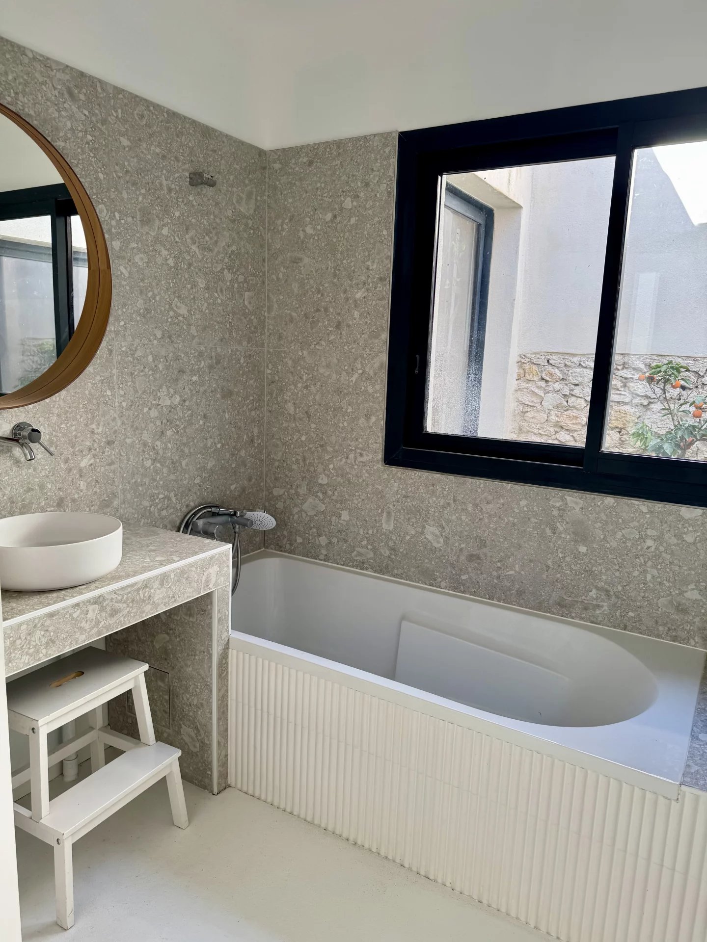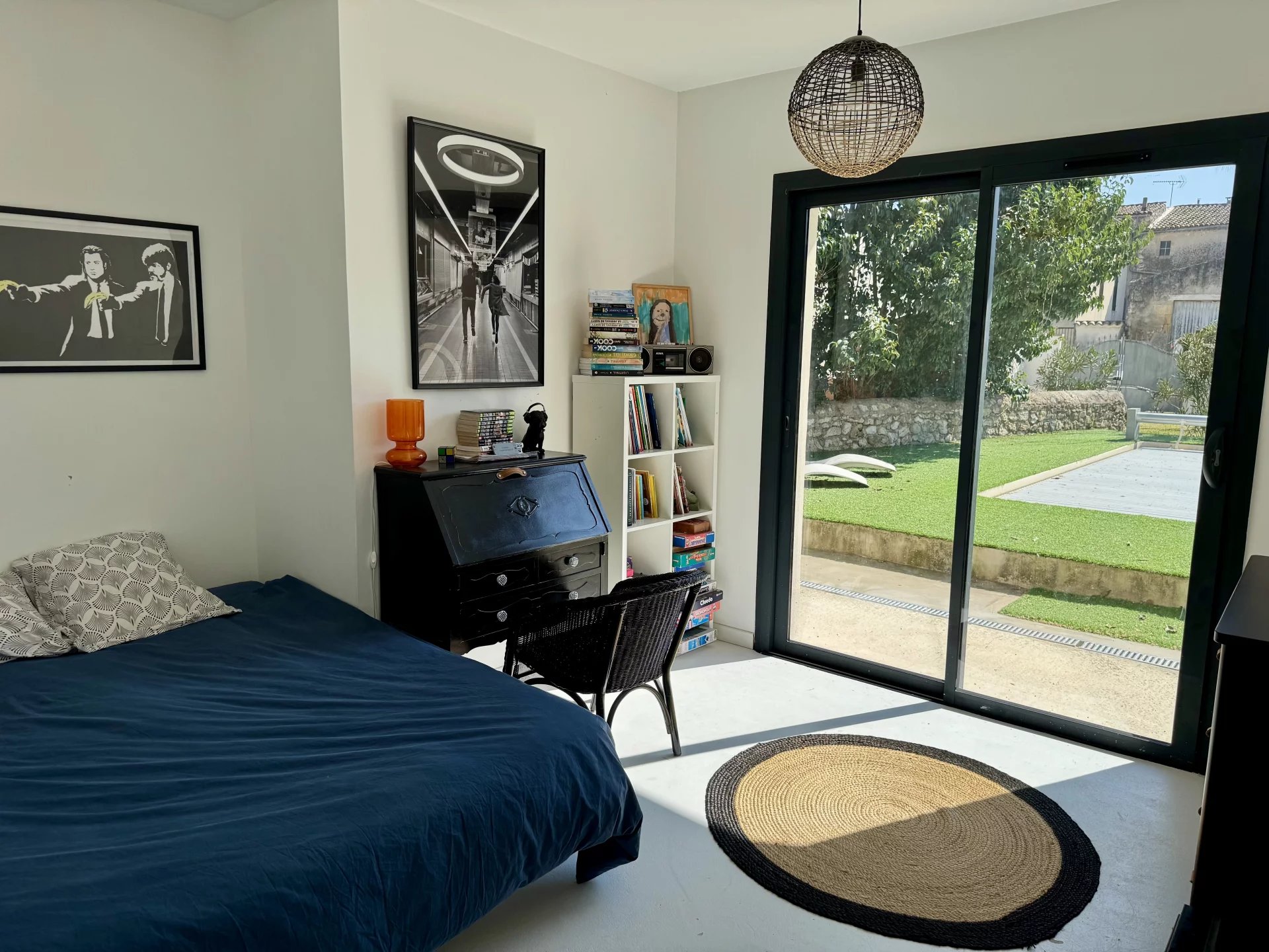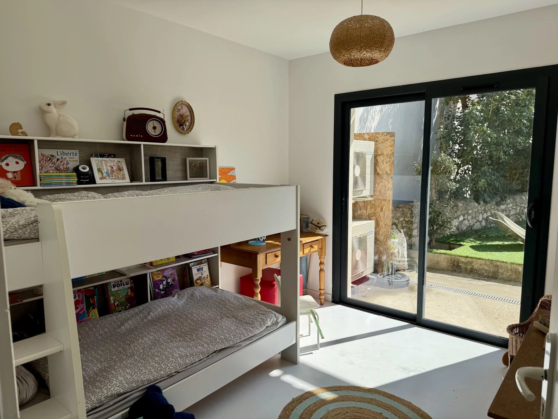Egalement orientées vers la piscine, deux chambres, de l'autre coté, plus cosy et ouverte sur le patio fleuri, une chambre parentale avec sa salle d'eau, ainsi que la salle de bains commune.