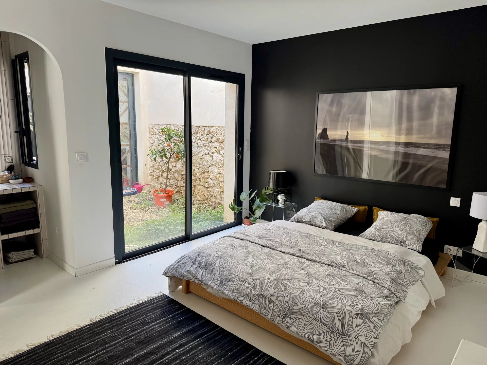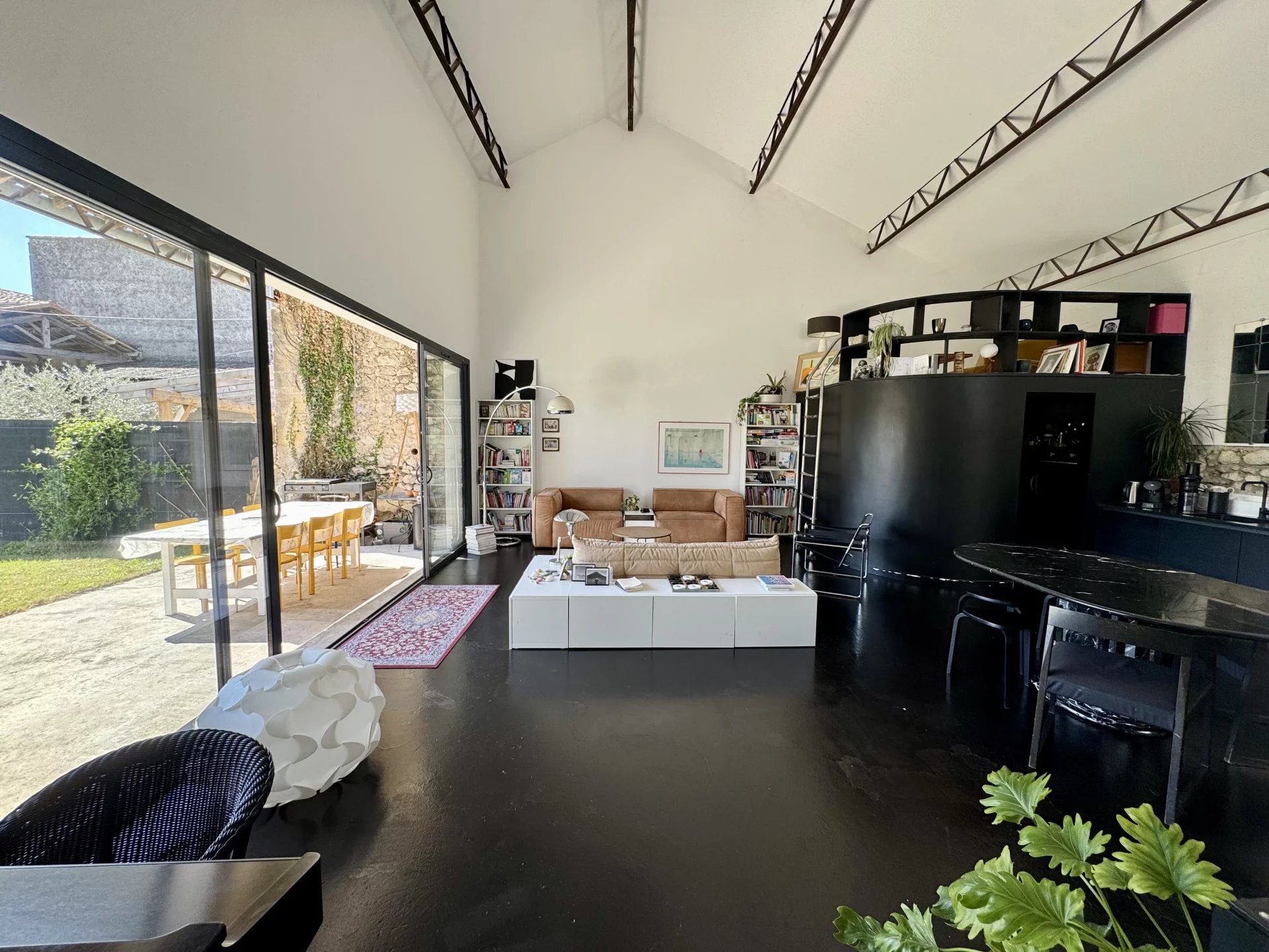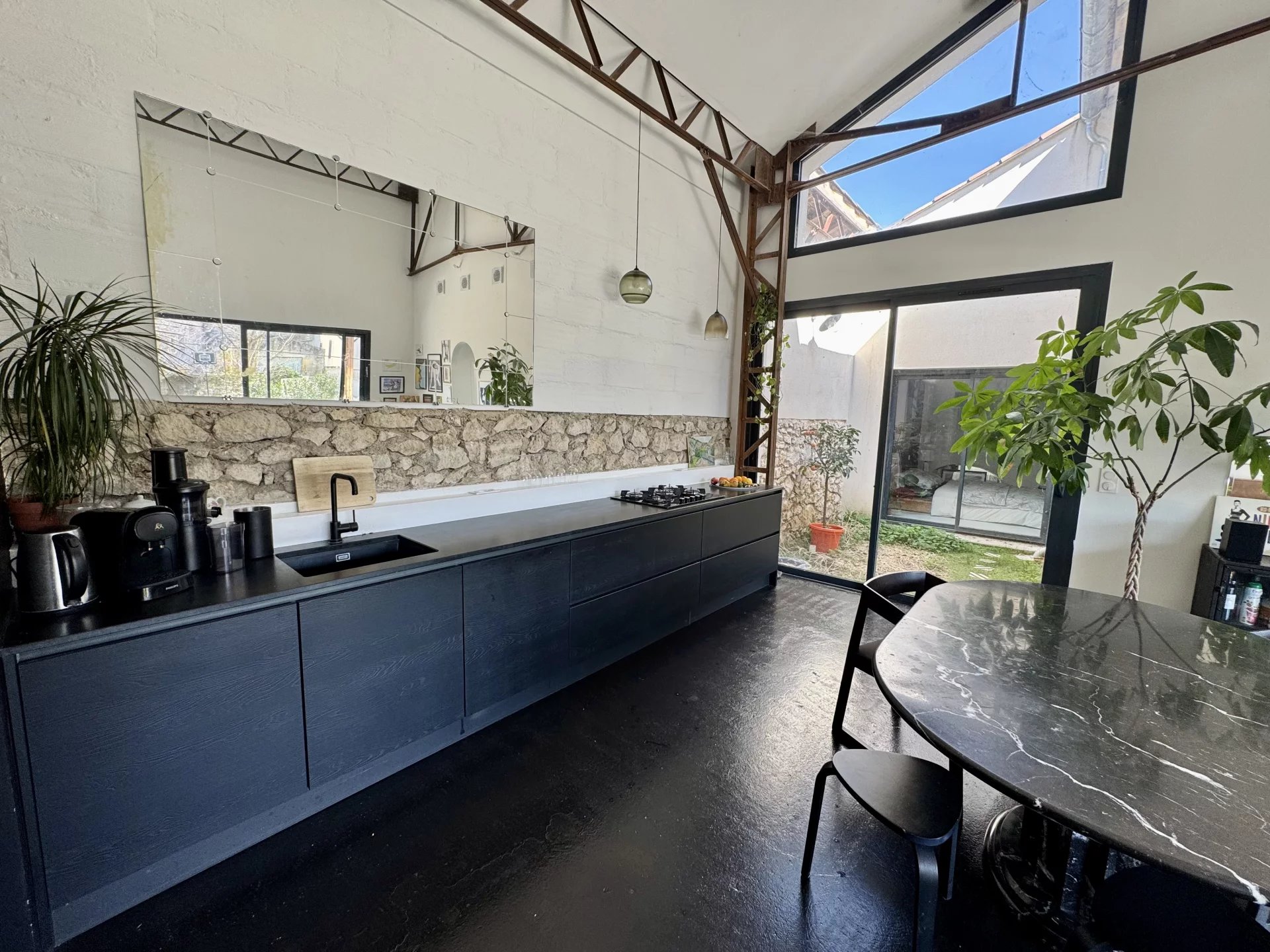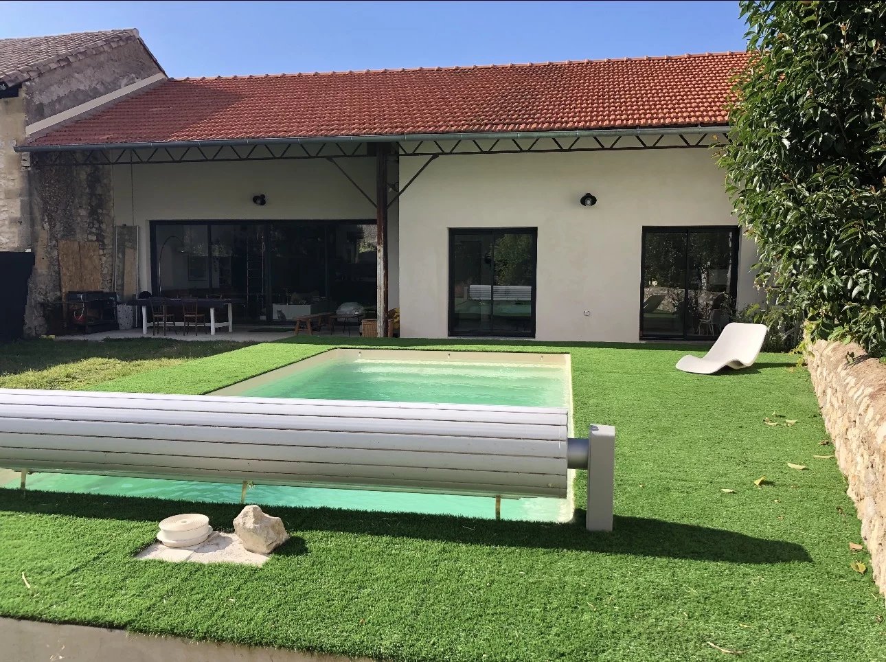 Au cœur du village, sur un terrain de 580 m² clos avec piscine au sel, cette ancienne remise a été réhabilitée parfaitement en maison de plain pied au style industriel.