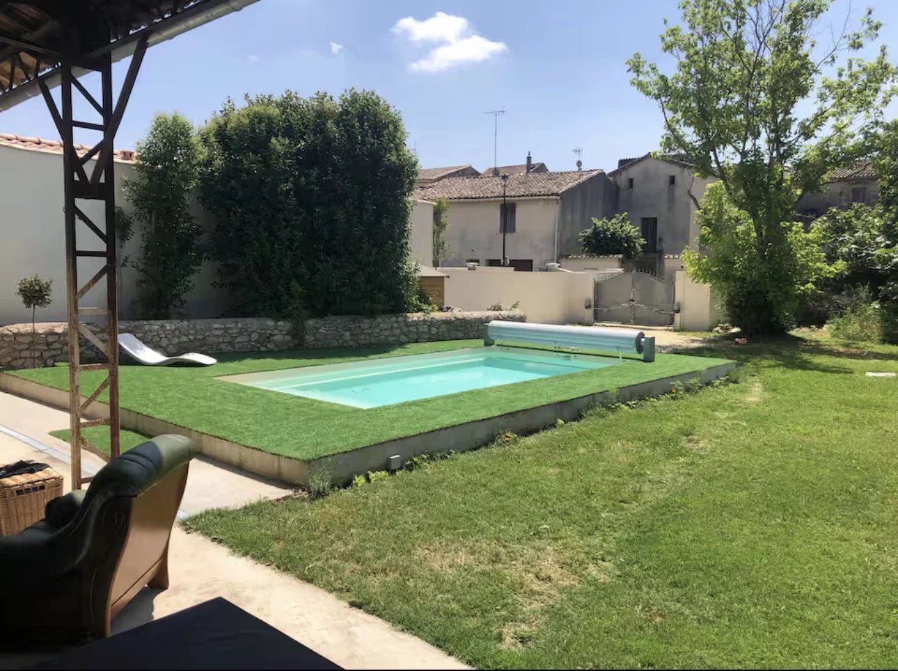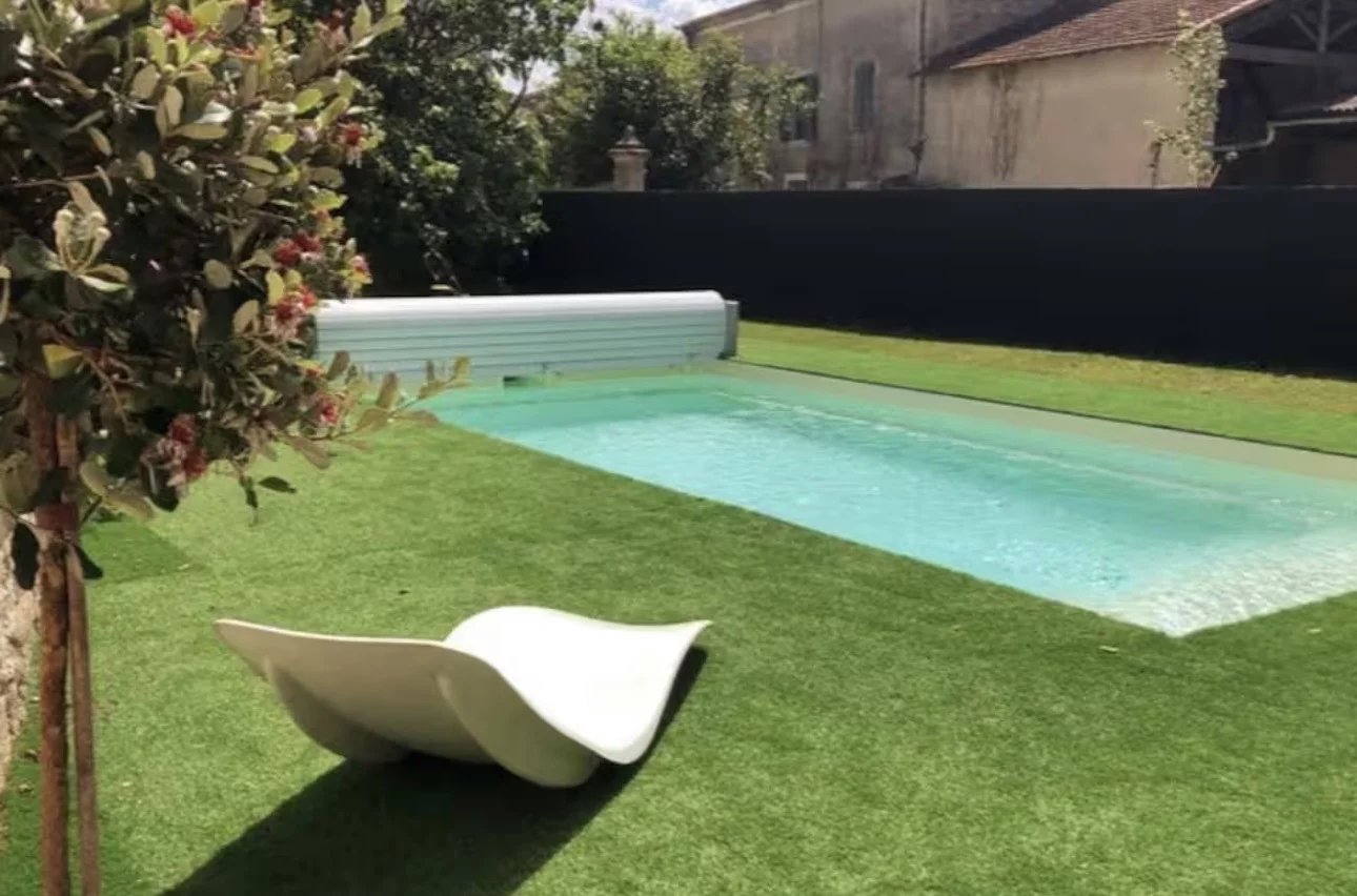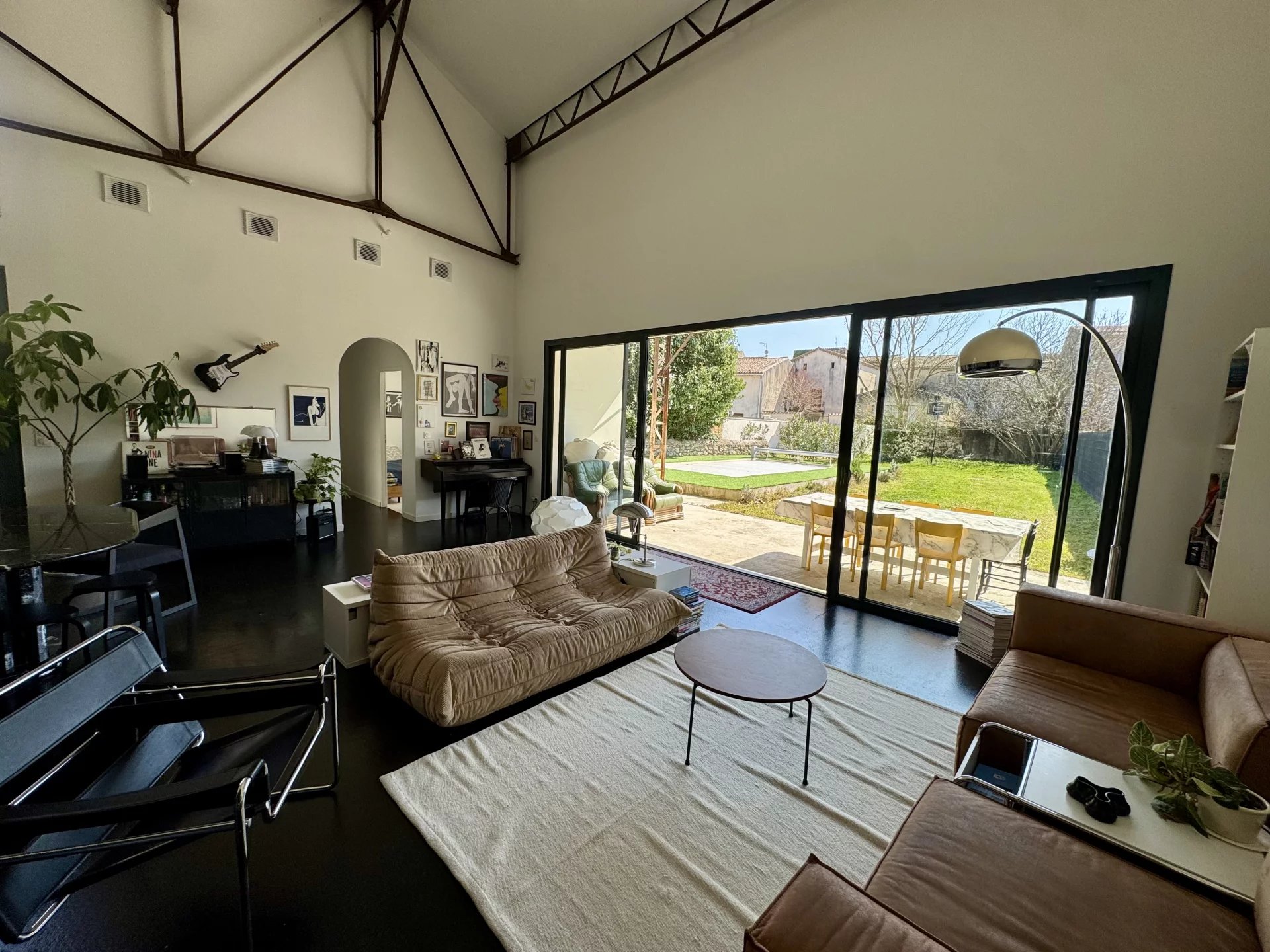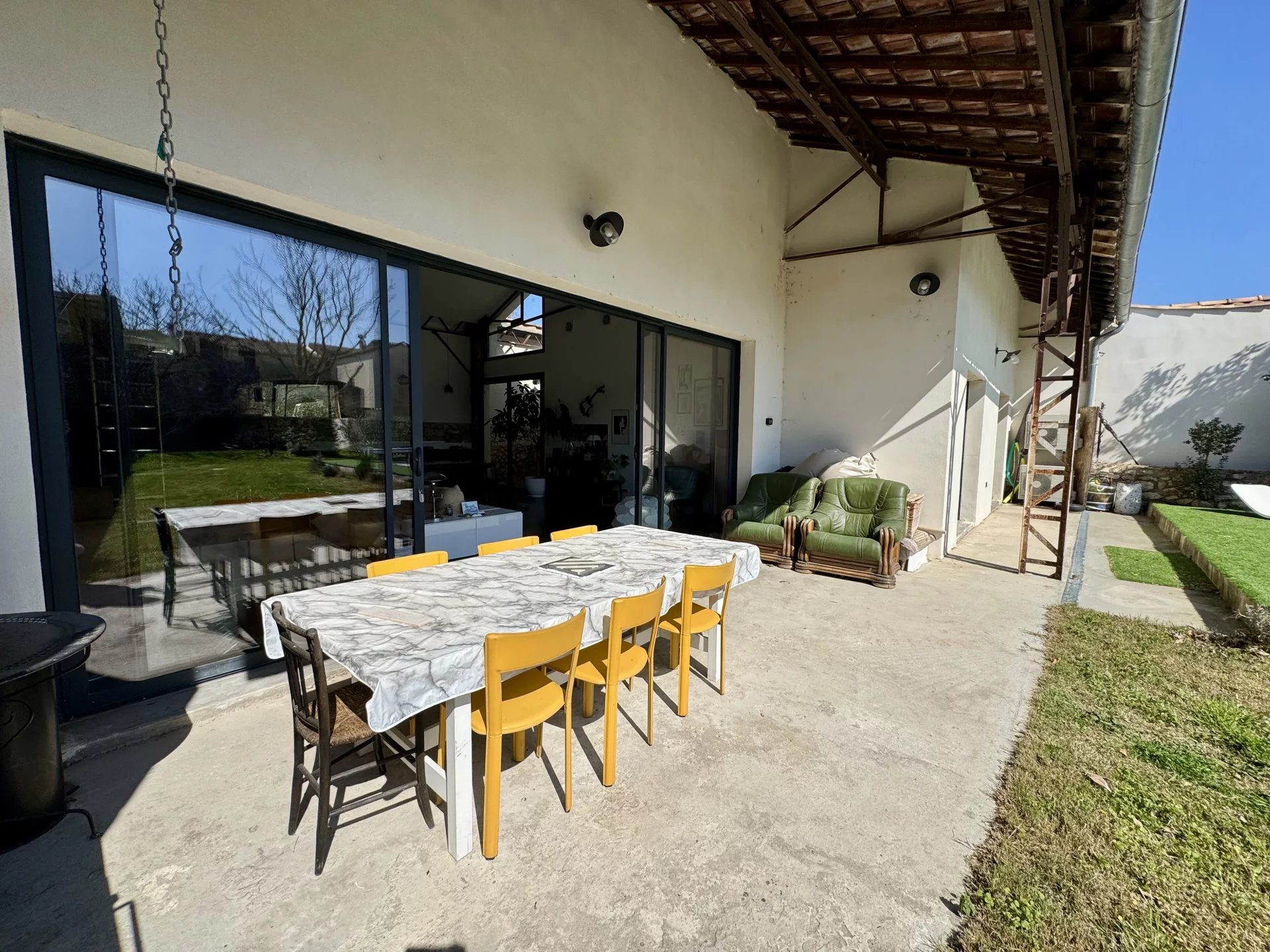 Au cœur du village, sur un terrain de 580 m² clos avec piscine au sel, cette ancienne remise a été réhabilitée parfaitement en maison de plain pied au style industriel.
