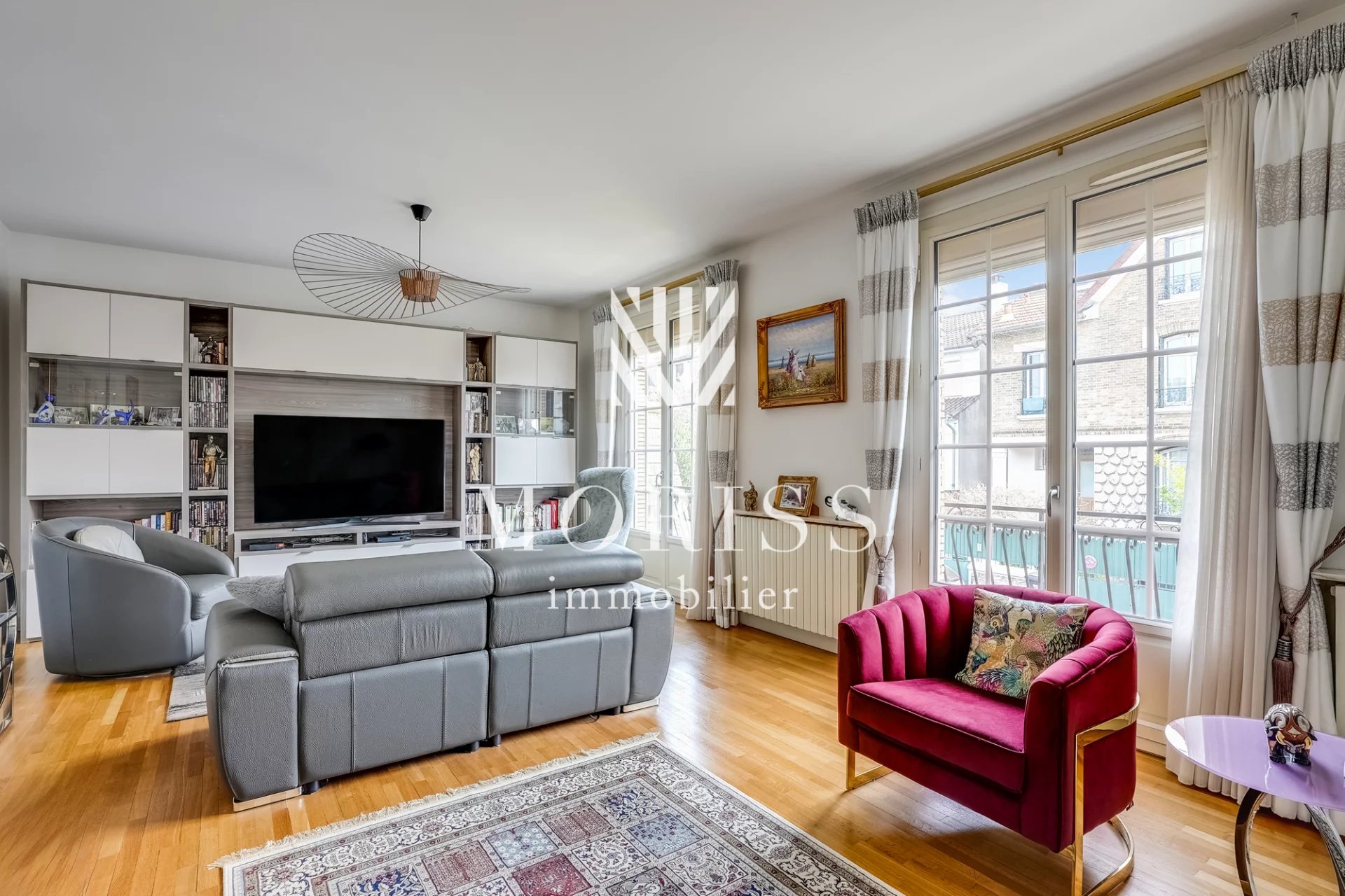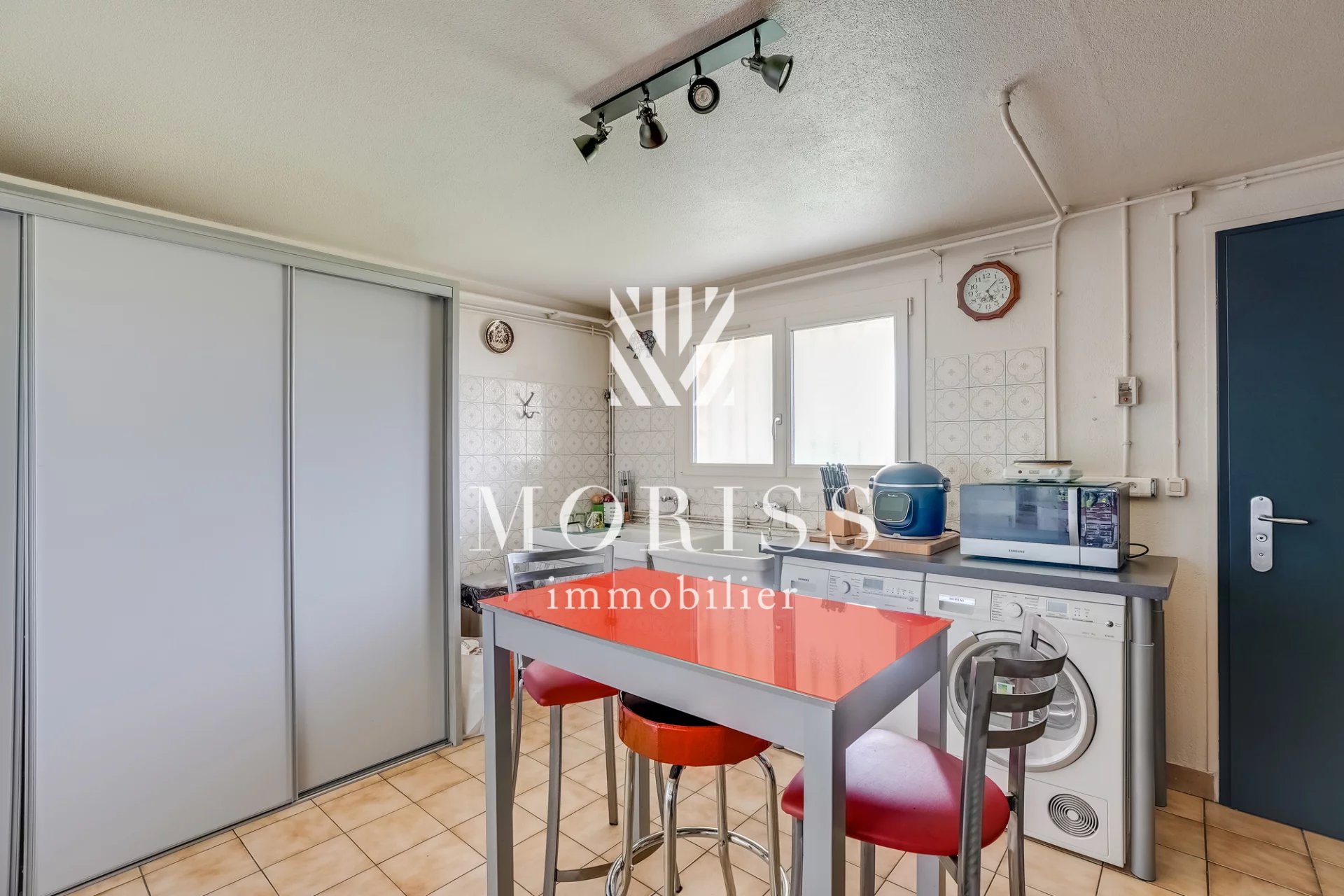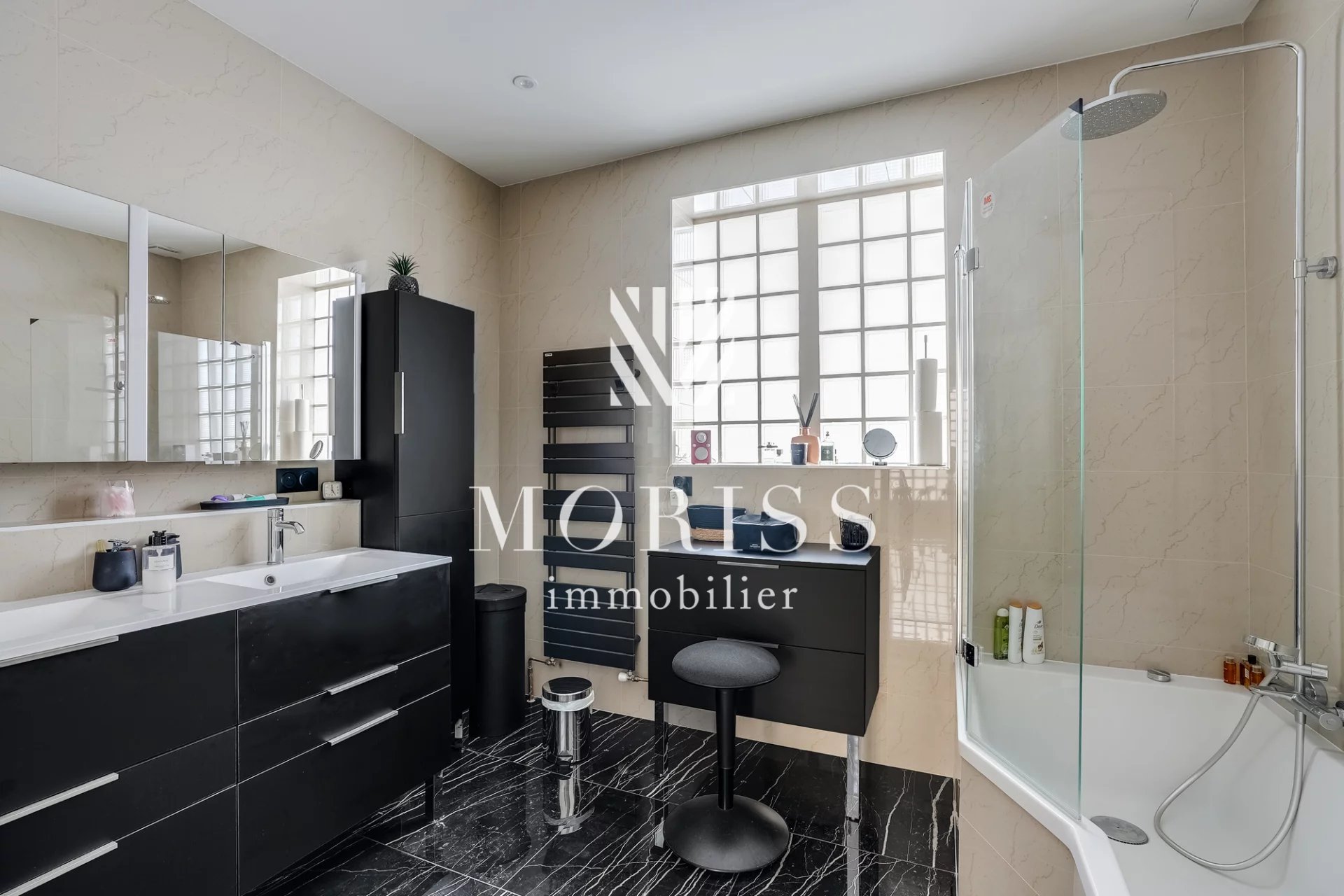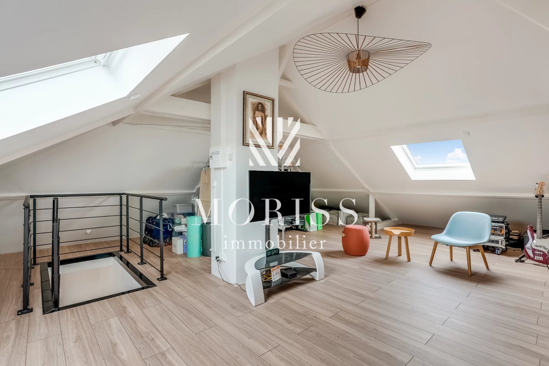 Au 1er étage, un séjour lumineux avec salle à manger attenante, une cuisine moderne toute équipée donnant accès à la terrasse de plus de 22m², deux chambres, la salle de bain et wc indépendant.